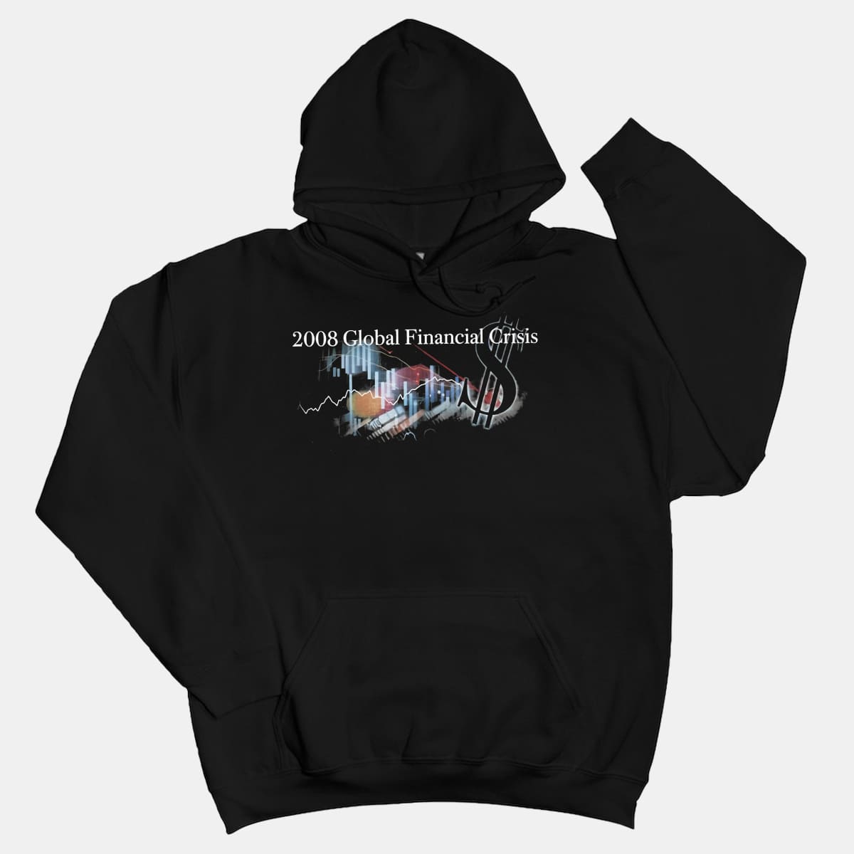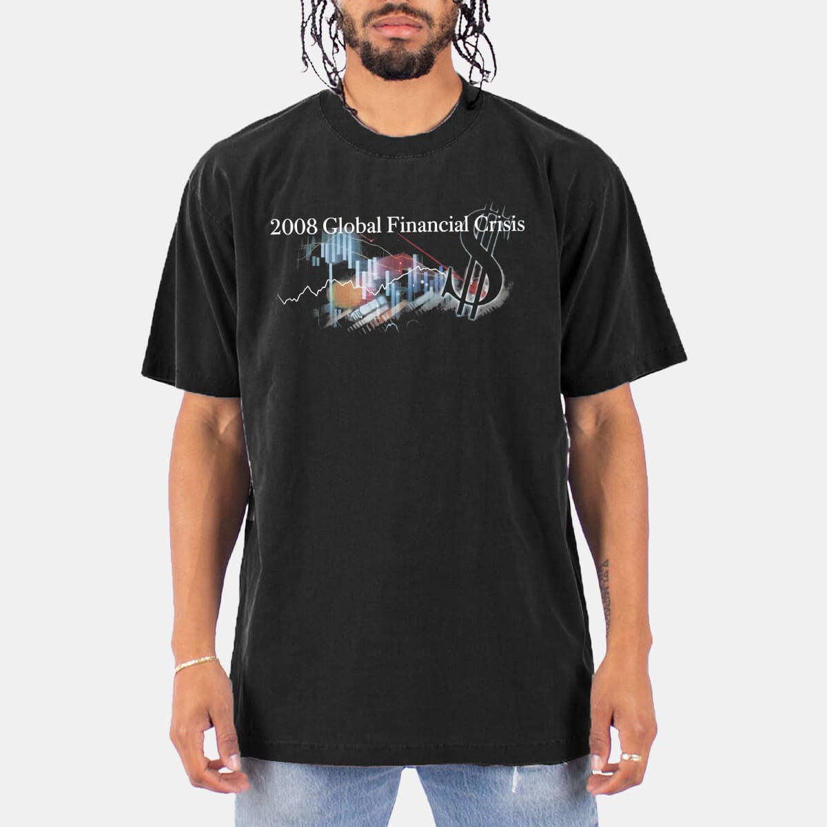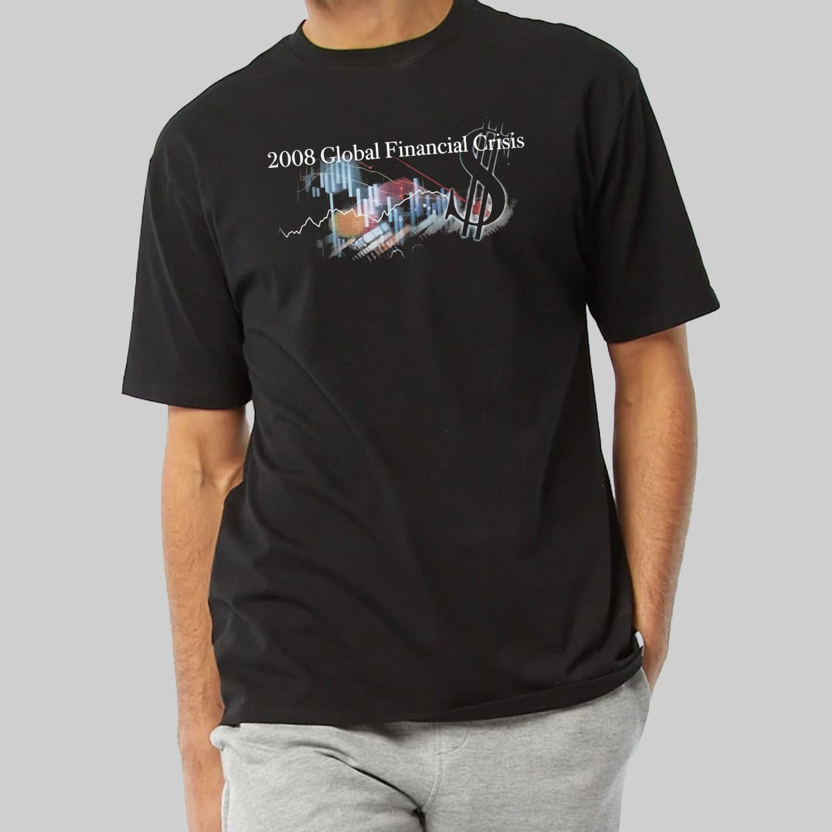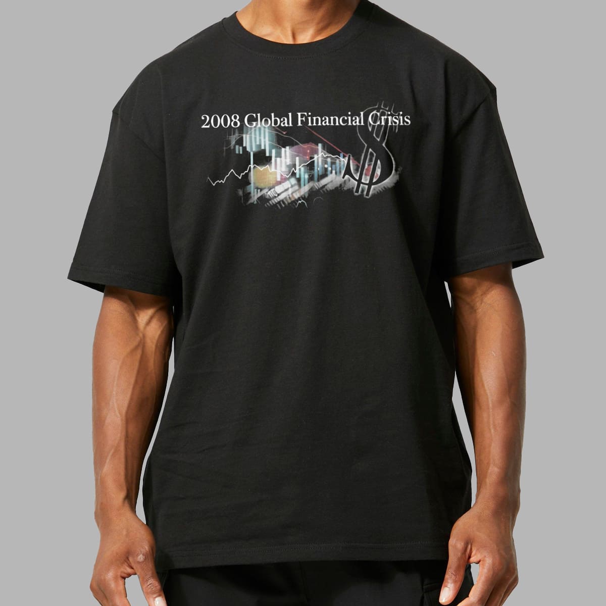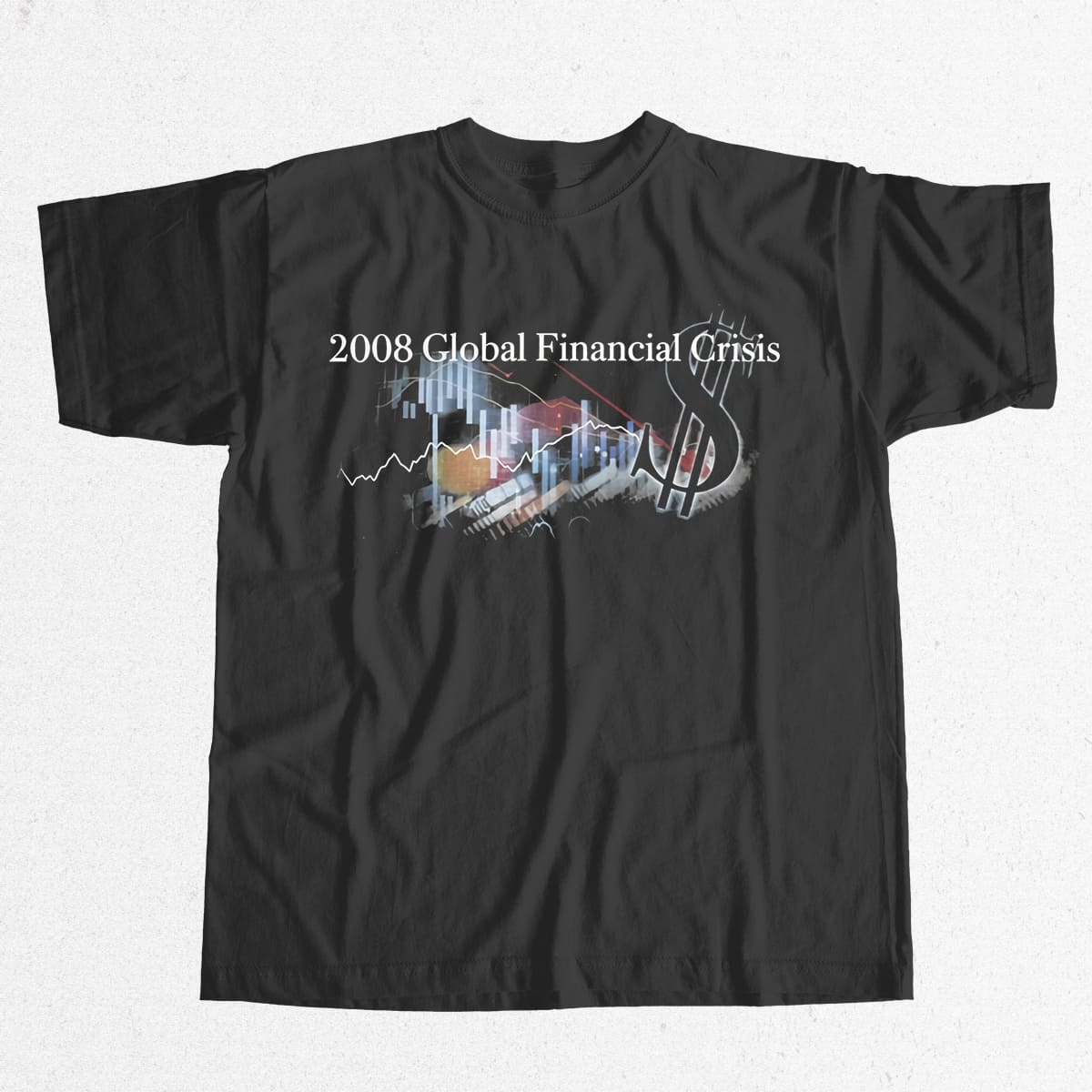 The shirt uses the classic black base of band tee/rap tee styles. The main highlight is the phrase “2008 Global Financial Crisis” printed in a formal serif font, completely contrasting with the chaos of the image below.