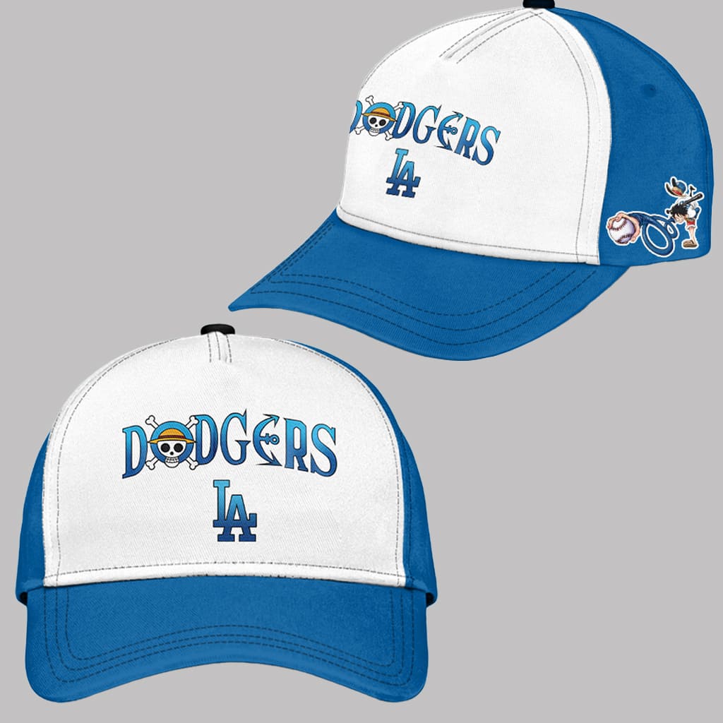 Crafted from durable, breathable cotton with an adjustable strap, this cap features a white crown and blue bill, mirroring the Dodgers’ classic colors. The front showcases “DODGERS LA” in a stylized blue font inspired by the One Piece logo, with a subtle gradient effect adding a dynamic touch. On the side, a playful embroidered patch depicts Luffy, the straw-hat-wearing captain from One Piece, riding a baseball with a bat, blending the anime hero’s energy with Dodgers pride.