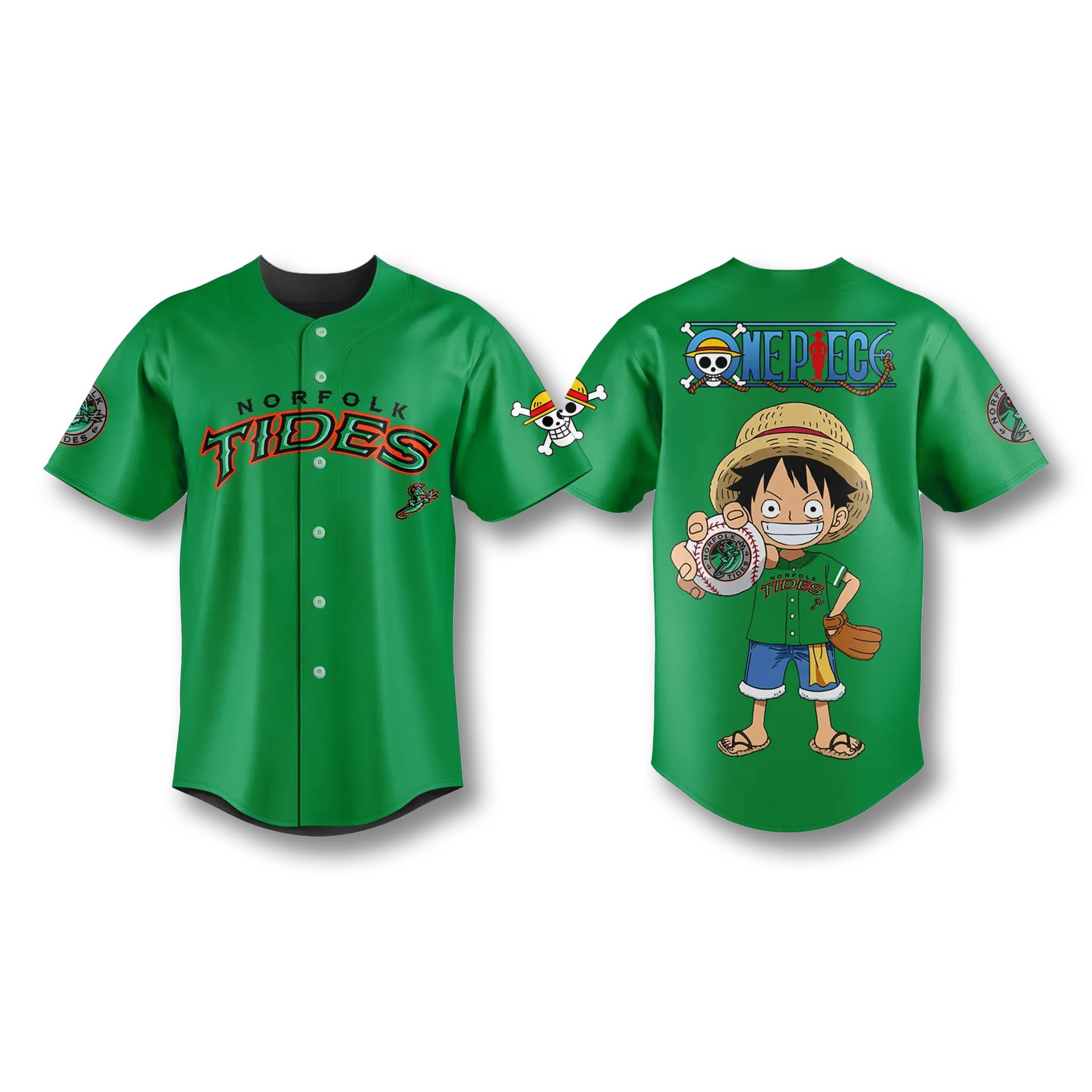 The jersey is dressed in a fresh green color – the color of life and overflowing hope, combined with the artistically curved “Norfolk Tides” lettering. On the back is an image of Luffy in a baseball uniform, ready to throw the decisive pitch to conquer every challenge on the field as well as on the grand line.
