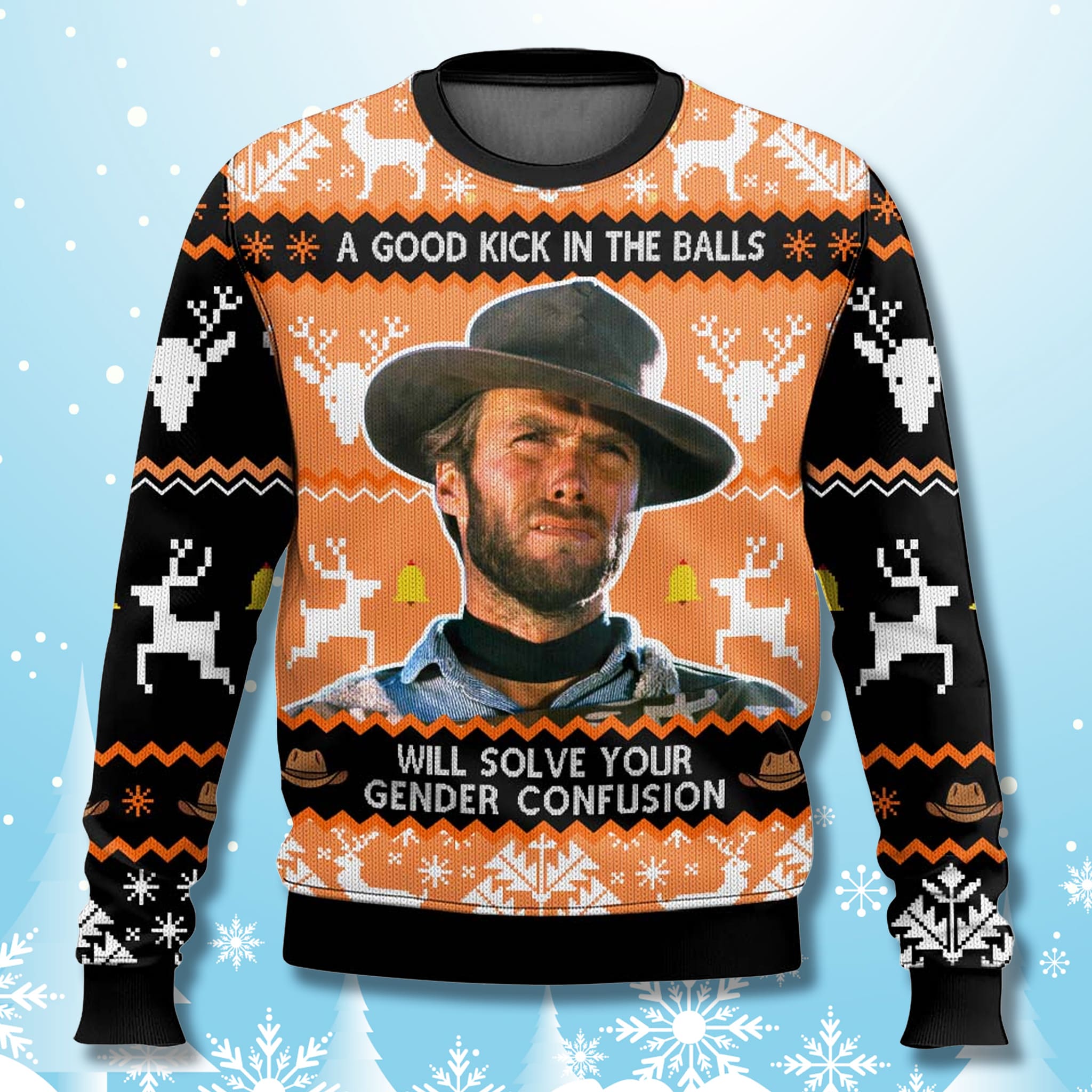 This A Good Kick In The Balls Christmas Sweater features a striking combination of traditional holiday pattern work and Western grit. The central panel is an eye-catching orange and black, showcasing a rugged portrait of “The Man with No Name” wearing his signature hat and poncho. The surrounding design cleverly contrasts the offensive quote, “A Good Kick In The Balls Will Solve Your Gender Confusion,” with classic ugly sweater motifs like reindeer and snowflakes, executed in a bold, zig-zag pattern.