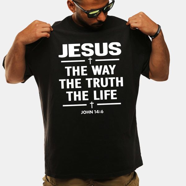 Crafted from soft, durable fabric, this white tee features the powerful biblical verse “JESUS THE WAY THE TRUTH THE LIFE JOHN 14:6” in bold red and black lettering across the chest, with “JESUS” highlighted in a larger, striking font.