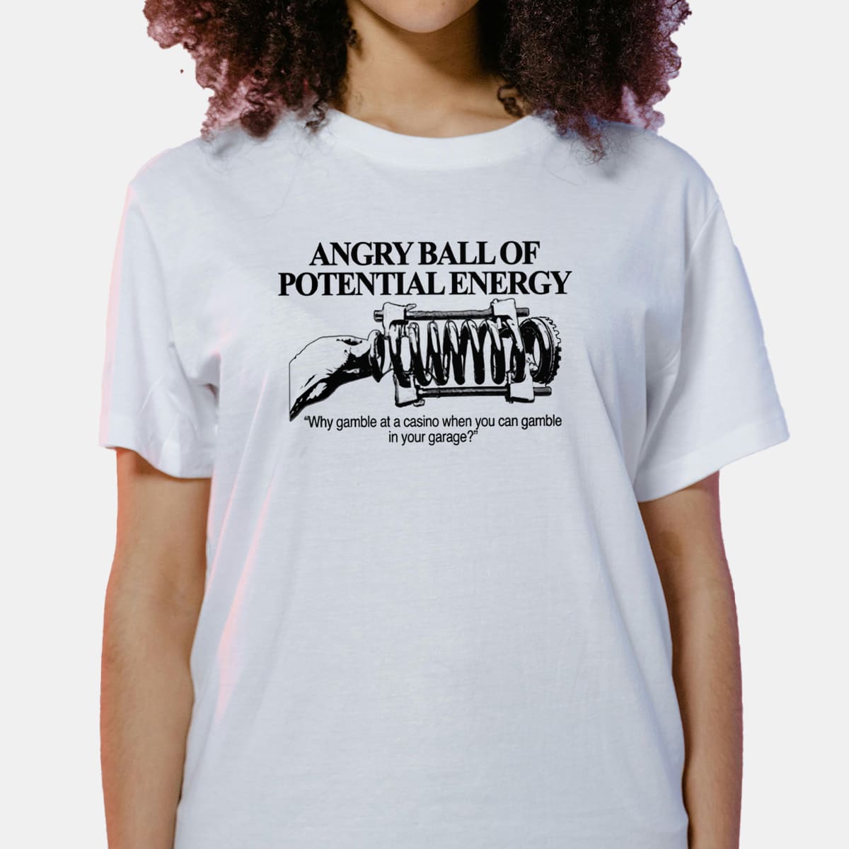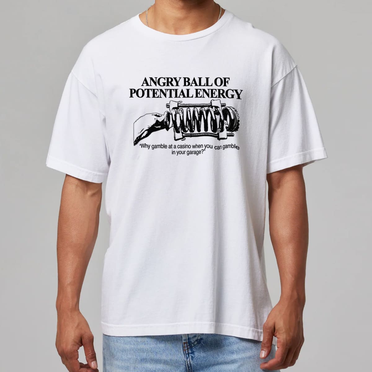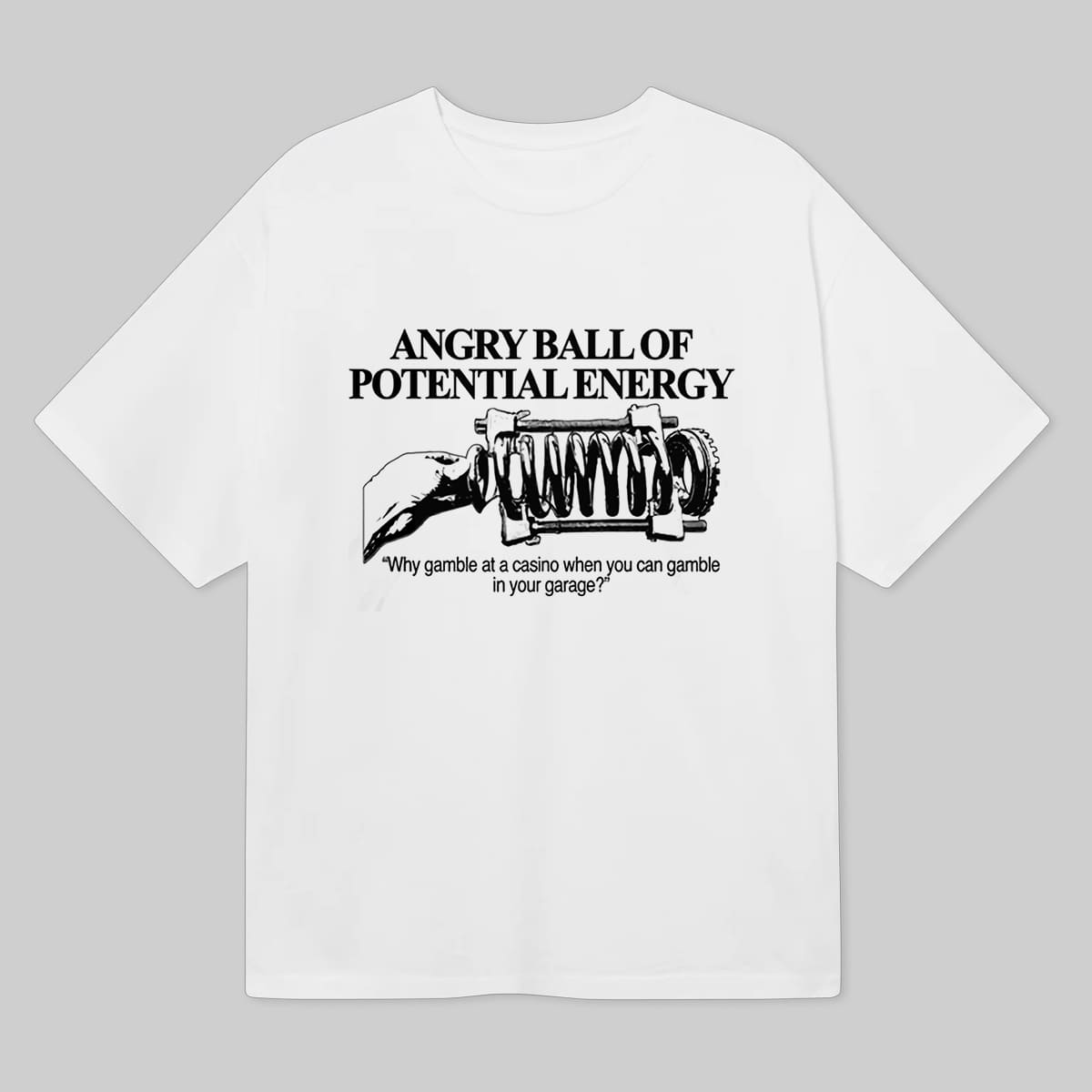 The Angry Ball Of Potential Energy Shirt is a classic meme item for car enthusiasts, garage builders, and anyone passionate about DIY mechanical projects. The design is directly inspired by the iconic phrase “Why gamble at a casino when you can gamble in your garage?” combined with an illustration of a hand gripping a tightly compressed spring ball. It’s a humorous way to describe the feeling when you build engines, weld frames, or create anything in the garage: full of explosive risk, but also full of excitement and potential energy waiting to burst!