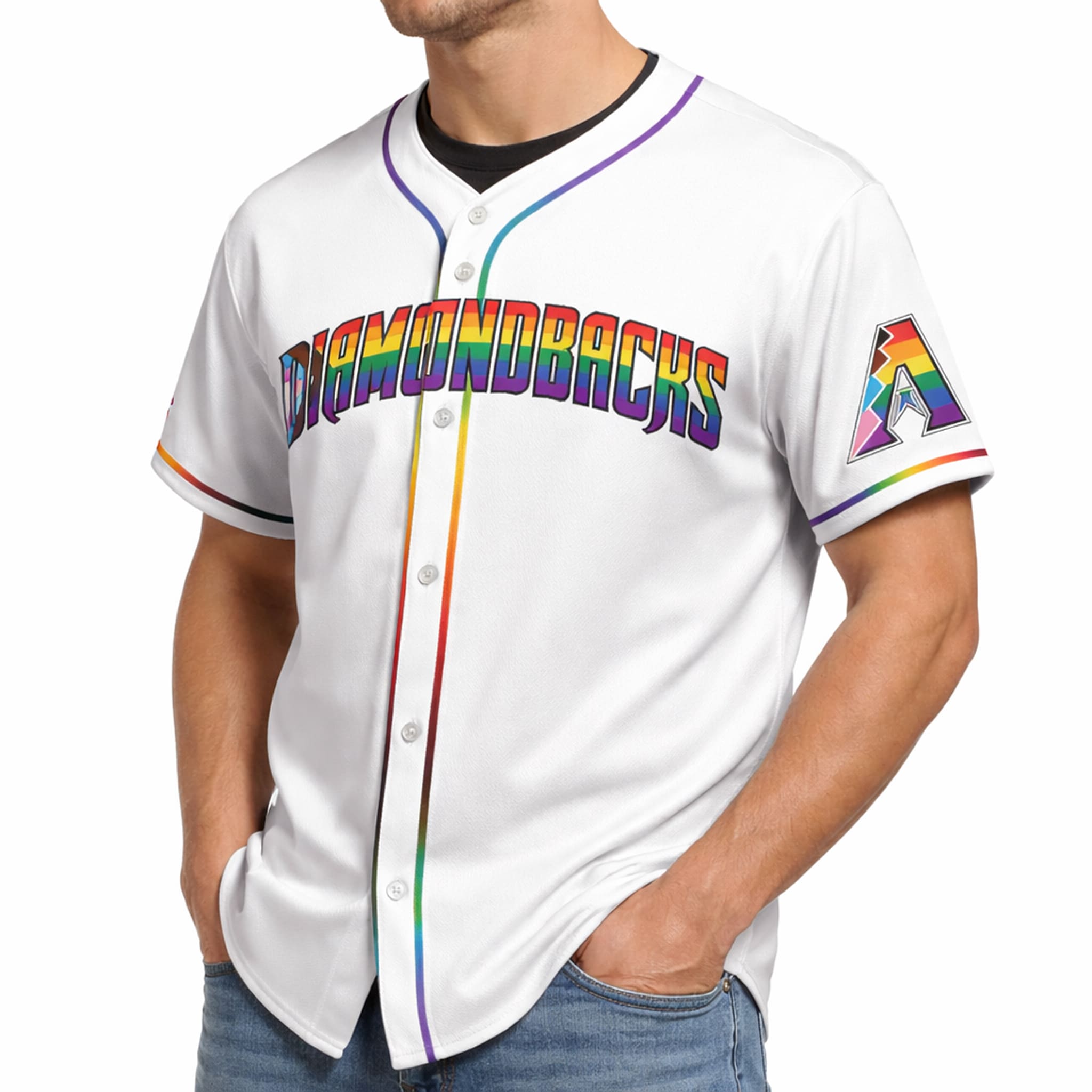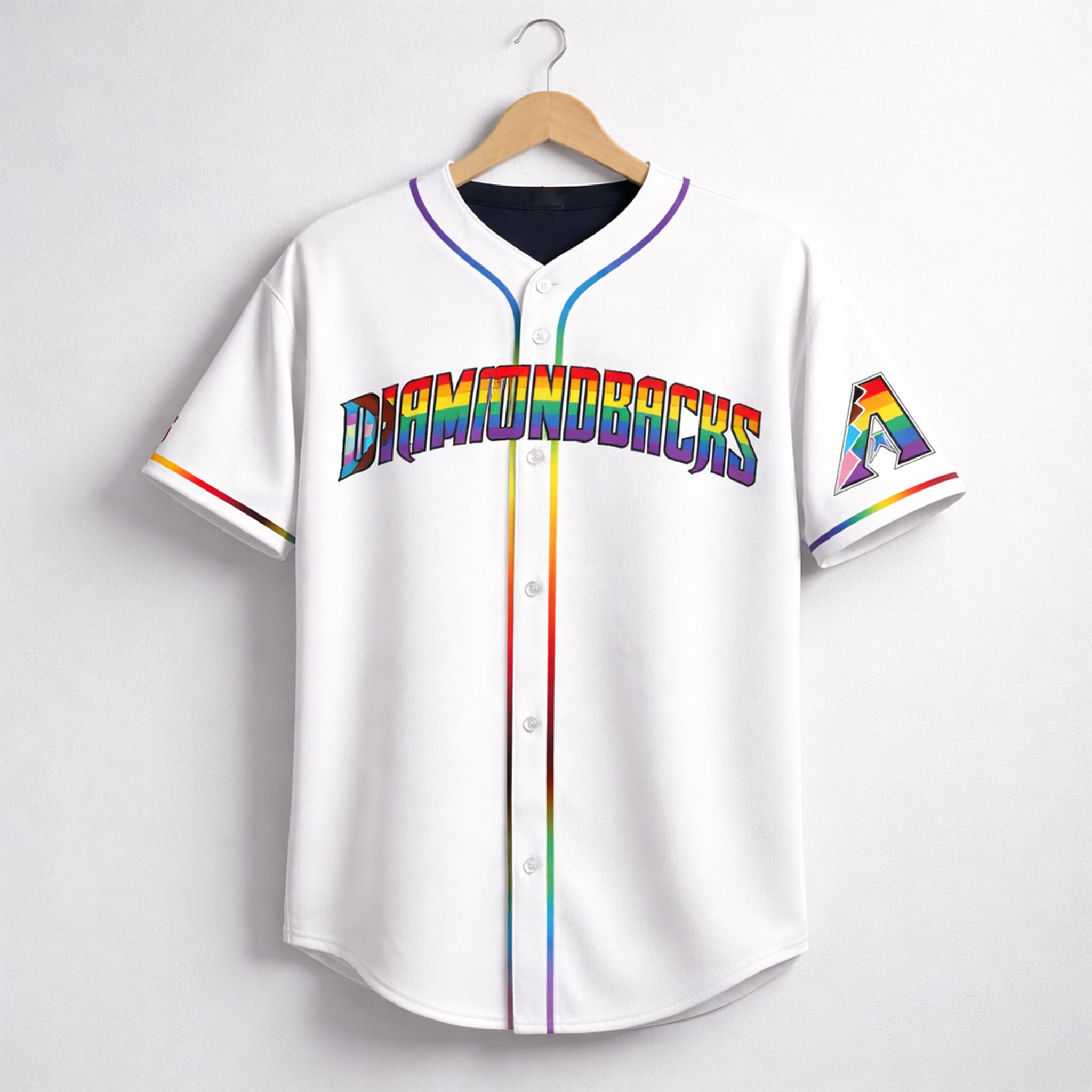 The jersey features a clean white base with “DIAMONDBACKS” displayed across the chest in a vibrant rainbow gradient. The “A” logo on the sleeve is also designed in rainbow colors, with rainbow accents on the collar and sleeves – creating a modern look with deep meaning. The design is both elegant and eye-catching, perfect for proudly wearing to the stadium or spreading a message of love anywhere.