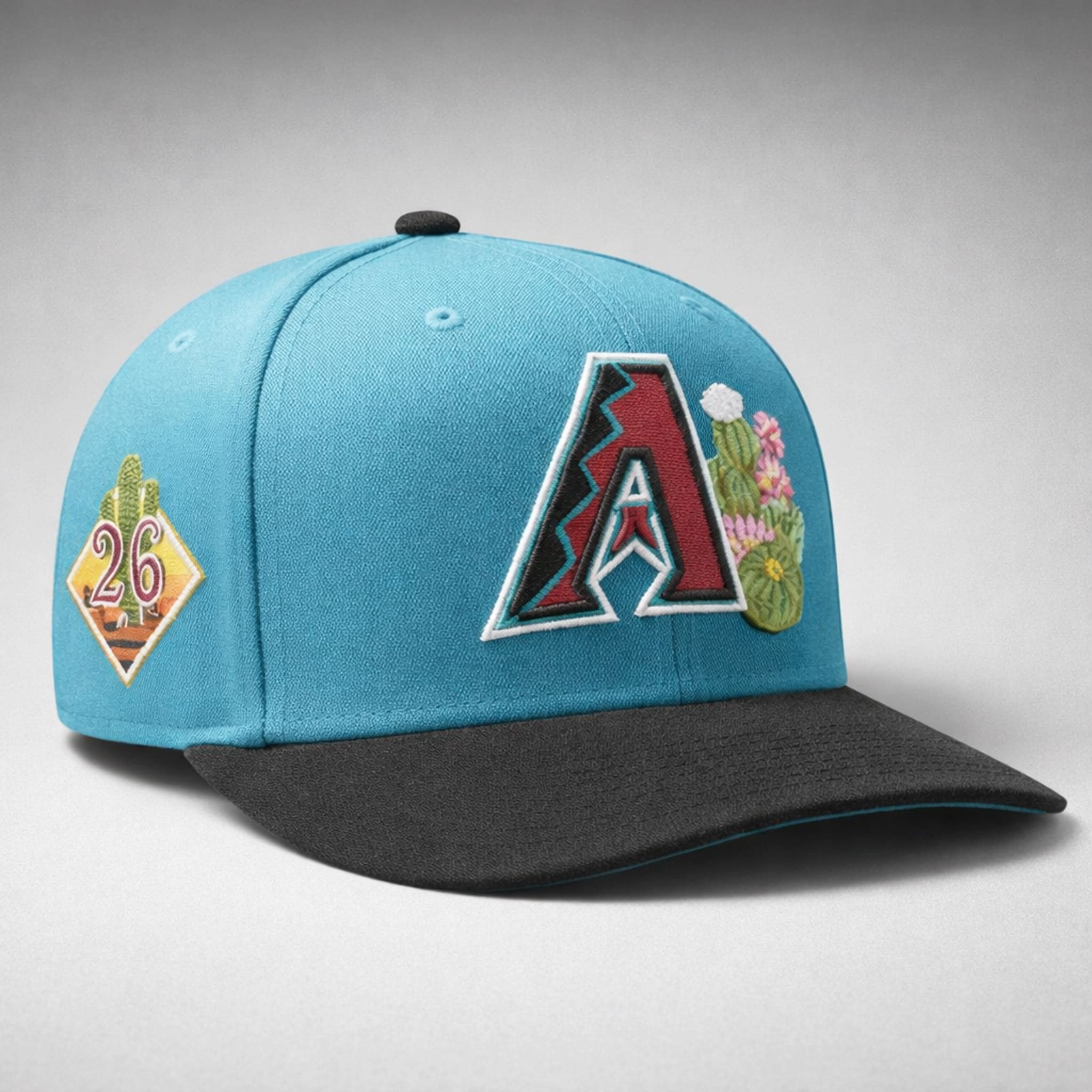 This hat features the team’s signature Teal crown paired harmoniously with a sleek black brim, delivering a look that is both modern and refined. The standout highlight is the sharp 3D embroidered team logo placed beside Arizona-inspired natural motifs, along with a distinctive diamond-shaped commemorative side patch marking the 2026 season.