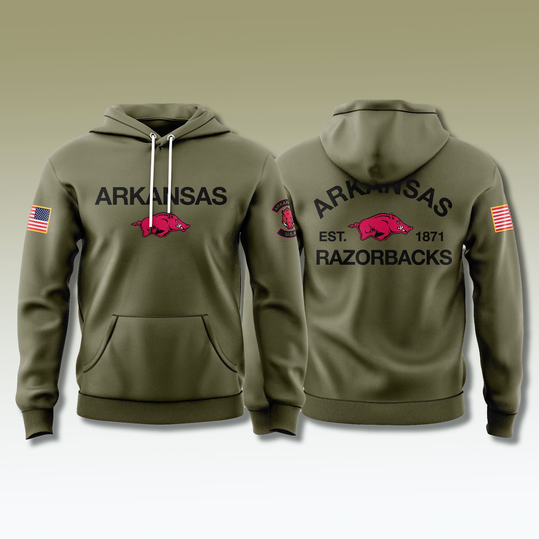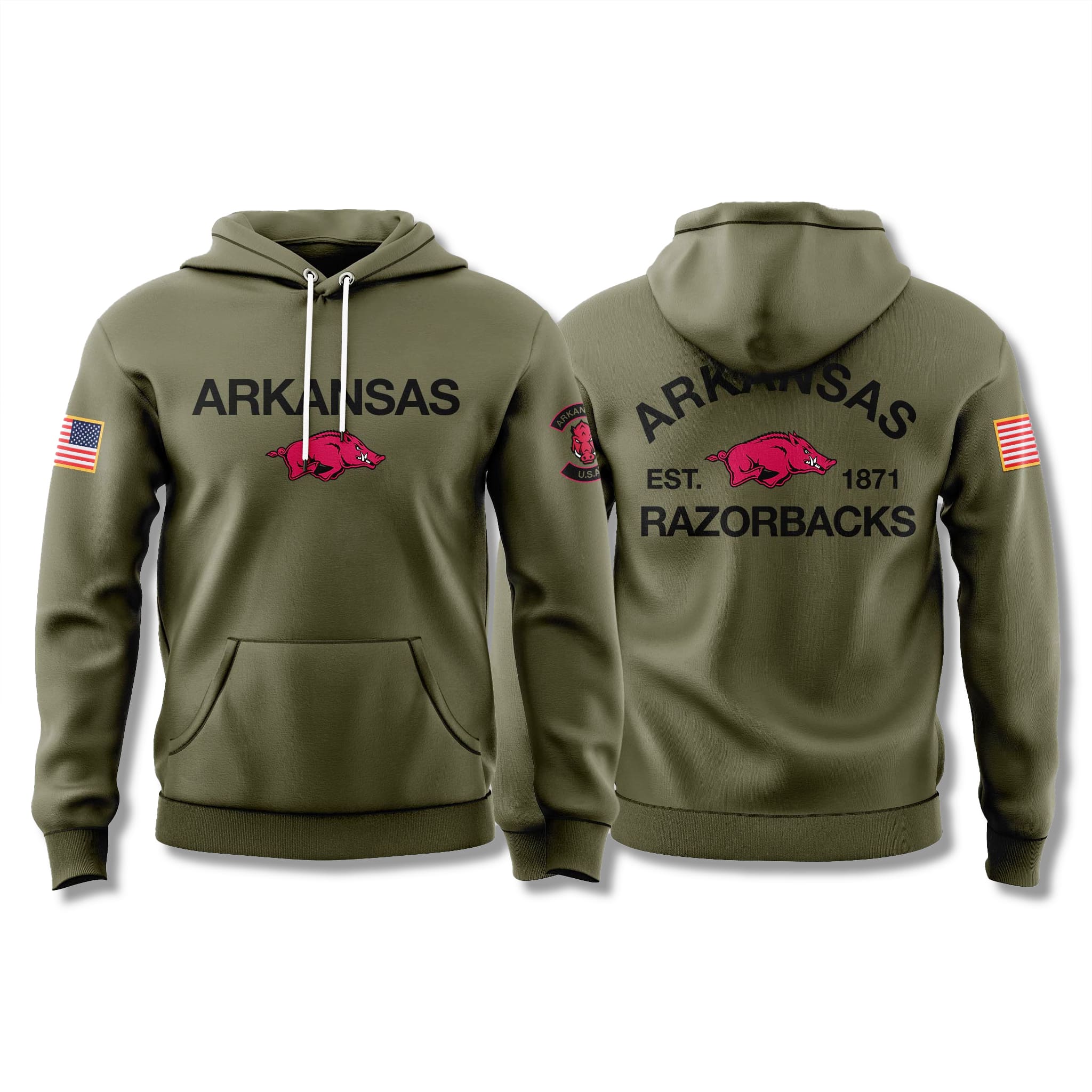 This Razorbacks military hoodie features a dominant military olive green colorway that highlights the charging Razorback logo in Arkansas’ signature red on both the chest and back. The design embraces a minimalist yet masculine aesthetic, with strong black typography paired with a U.S. flag graphic on the sleeve, delivering a modern tactical look.