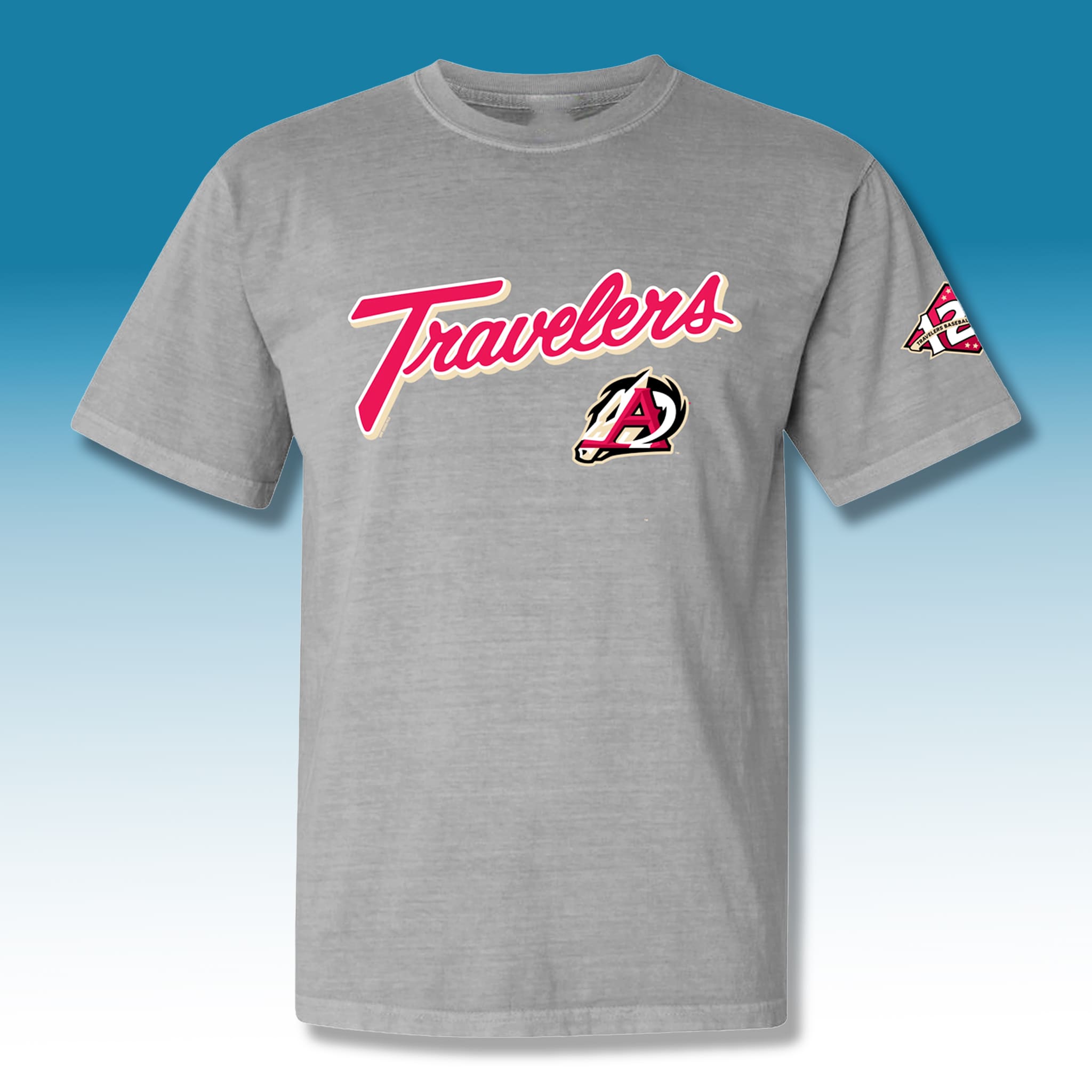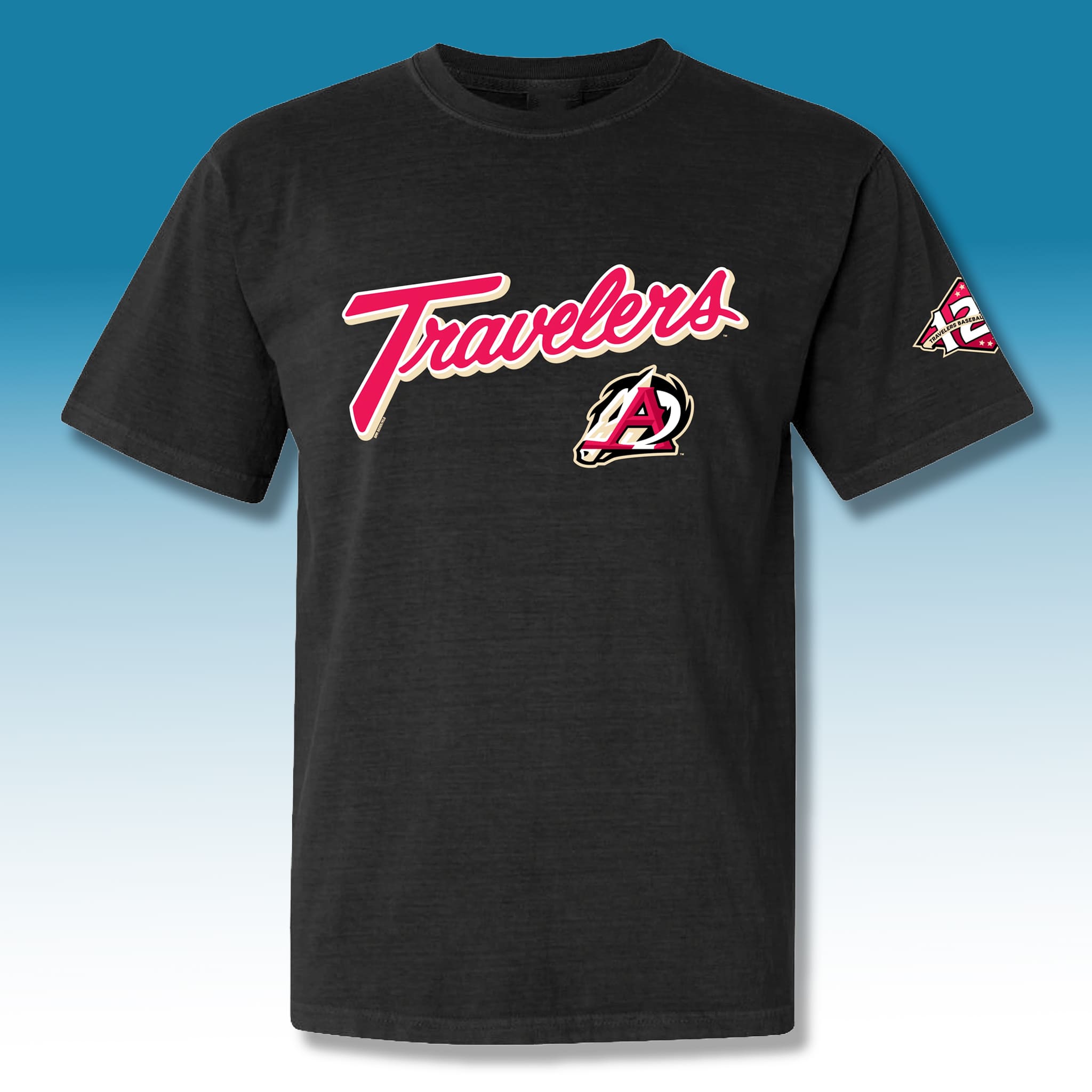 This shirt features a vintage-style design on a faded black base, with cream-red retro “Travelers” script, a stylized “A” logo, and a 125th-anniversary patch on the sleeve, bringing a classic nostalgic baseball vibe. Available in two colors: black and gray.