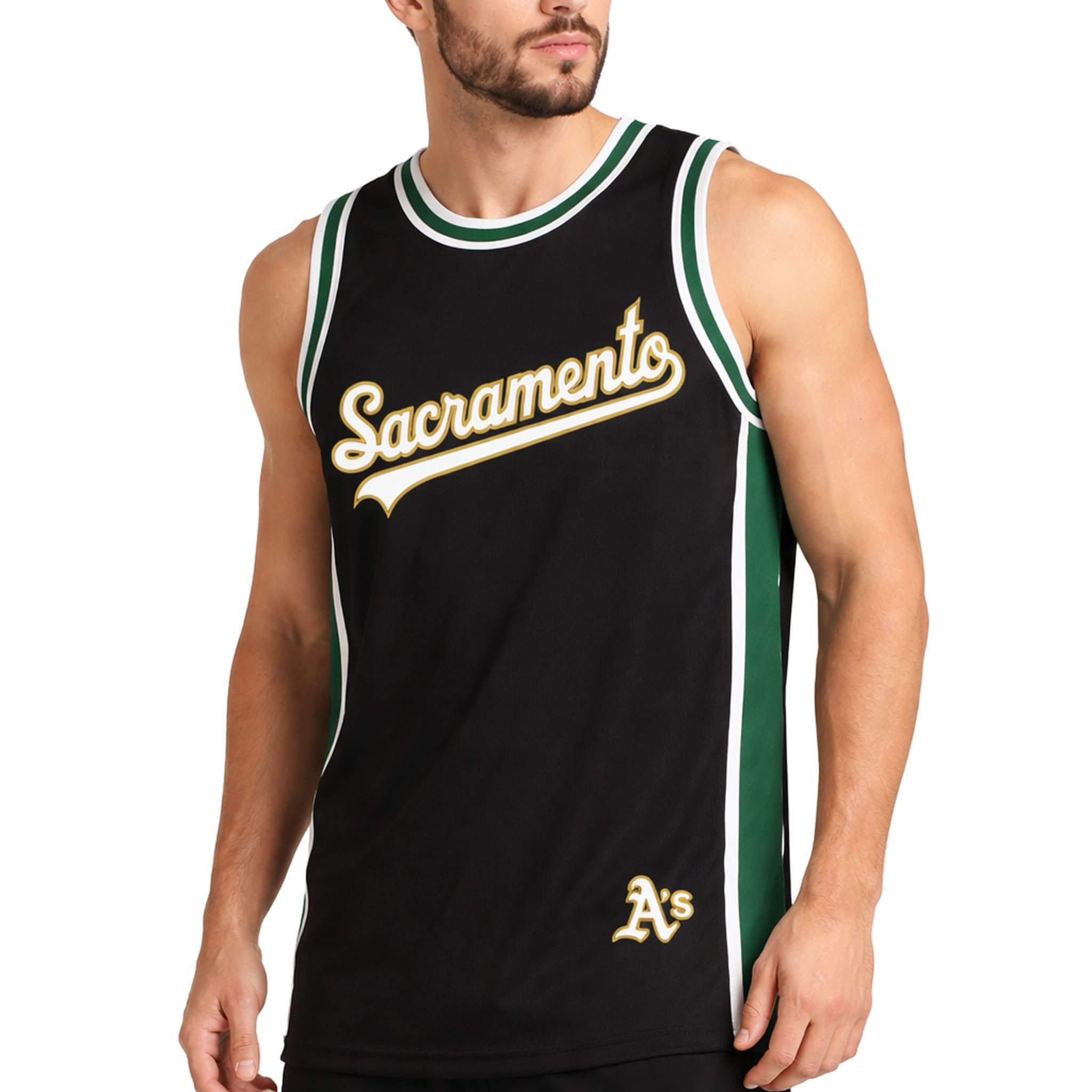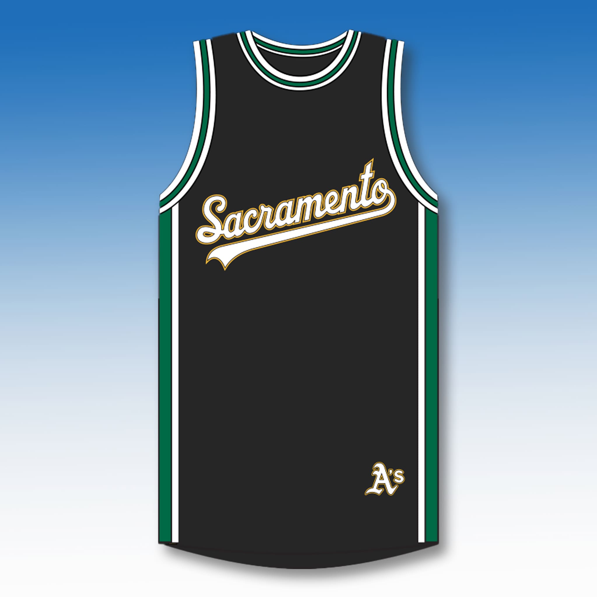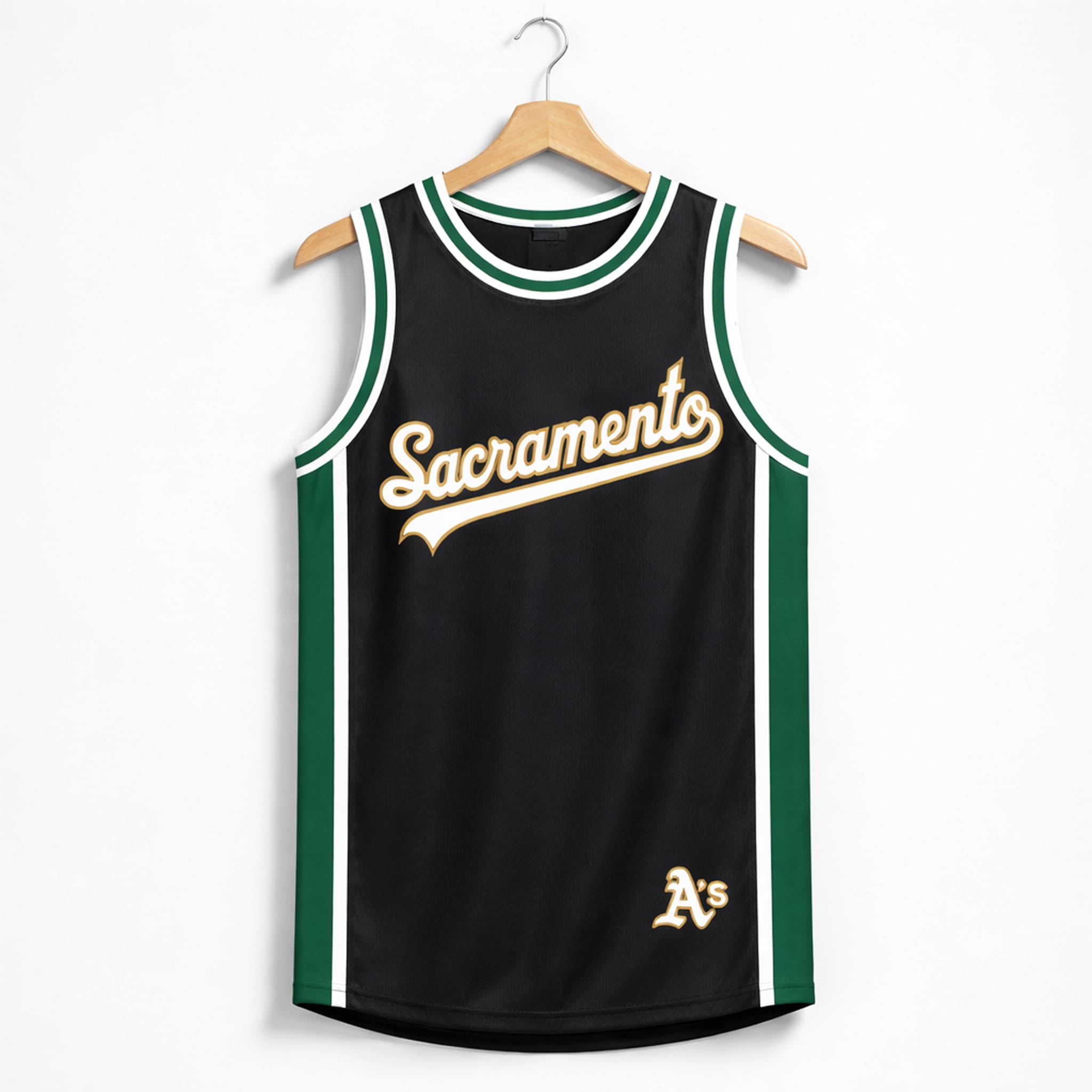 The jersey design is inspired by bold basketball style: a sleek black base, a shining gold “Sacramento” script across the chest, refined green and white trim, and a small A’s logo detail – creating a dynamic streetwear look that perfectly blends A’s baseball with a Sacramento Kings-style basketball vibe. The overall feel is youthful, energetic, and full of California street-sport character.
