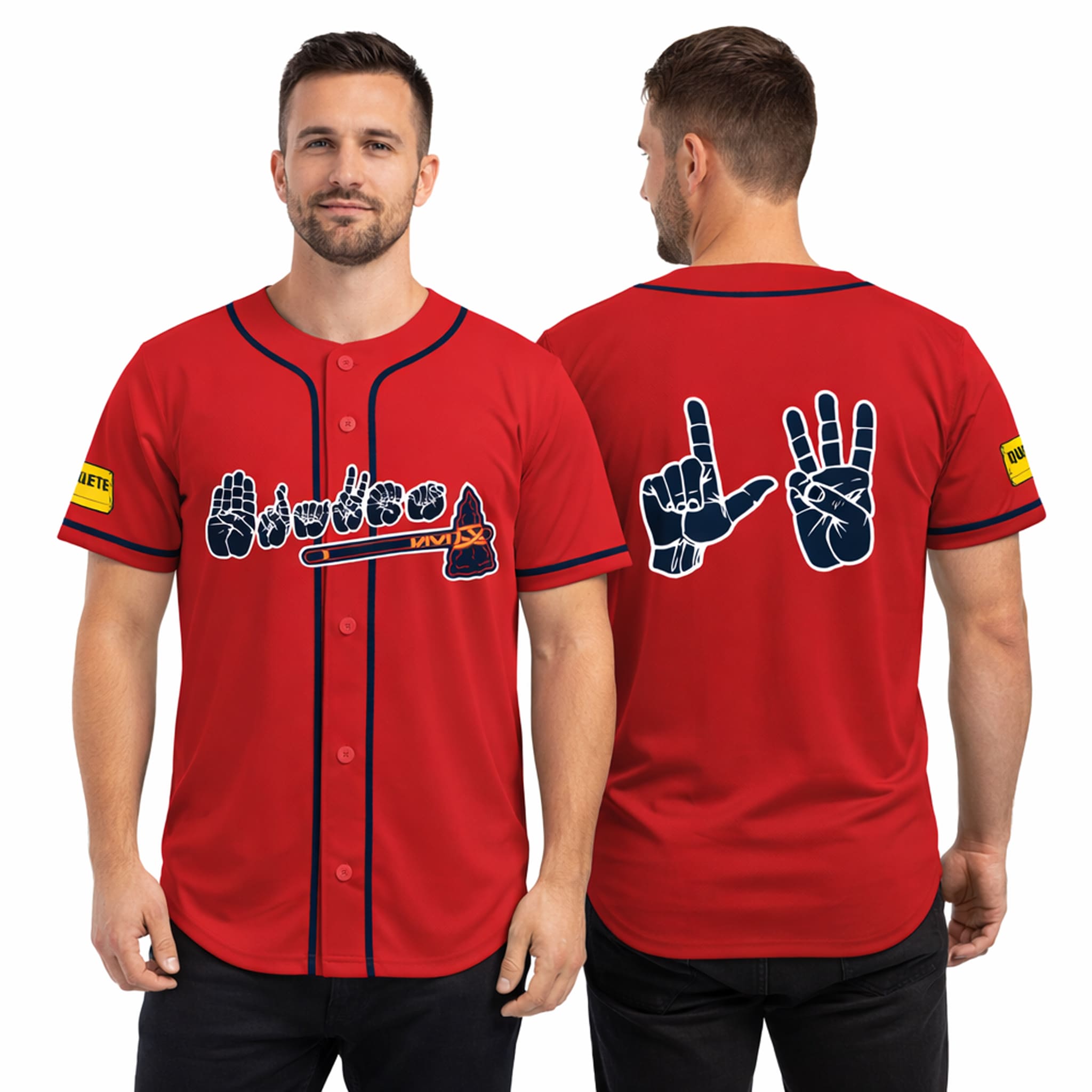 The back showcases large ASL hands spelling “Braves” or an inclusion-themed symbol, and the jersey is made from breathable polyester, making it perfect for cheering on the Braves or spreading Deaf Awareness wherever you go.