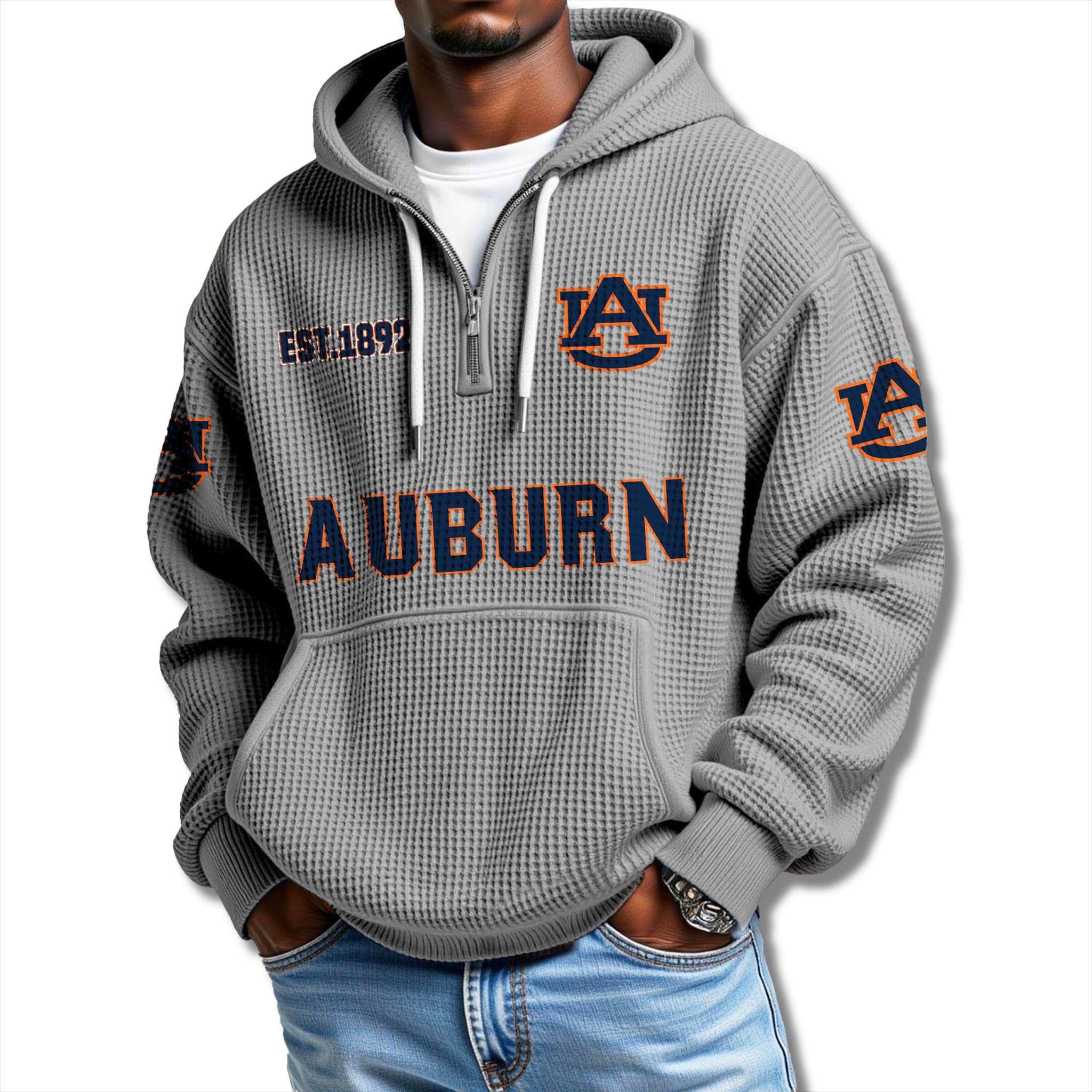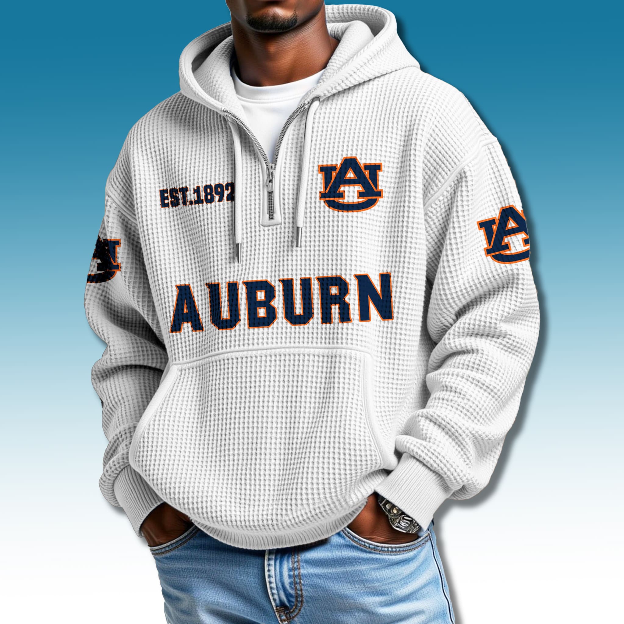 This Auburn fan hoodie stands out with its elegant Cream White waffle-knit fabric – a clean, refined canvas that amplifies the bold Orange and Navy accents. The athletic quarter-zip design features the iconic interlocking AU logo and a strong, confident “AUBURN” print, creating a look that blends classic charm with modern energy. It’s the ideal way to show your support wherever you go.