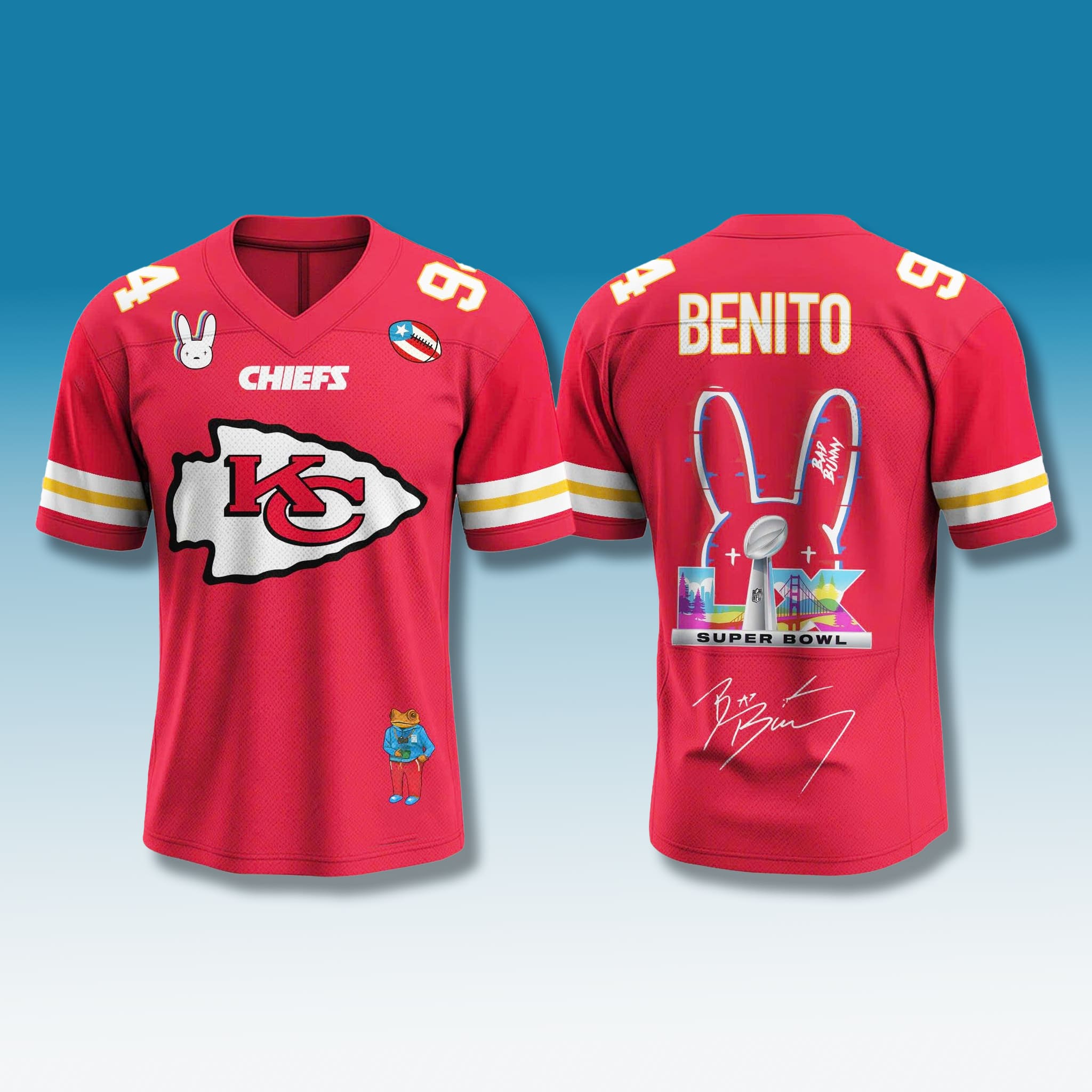 Score the cultural crossover with the Bad Bunny Chiefs 2026 Football Jersey, a passionate tribute to Puerto Rican icon Bad Bunny, who will headline the halftime show at the highly anticipated event on February 8, 2026 at Levi’s Stadium. Combining Bad Bunny’s boundary-pushing reggaeton beats and Latino pride – having just wrapped up his 2025 world tour – with the reign of the KC Chiefs, this jersey channels the “Benito Bowl” vibe as a spiritual gift to Chiefs fans.