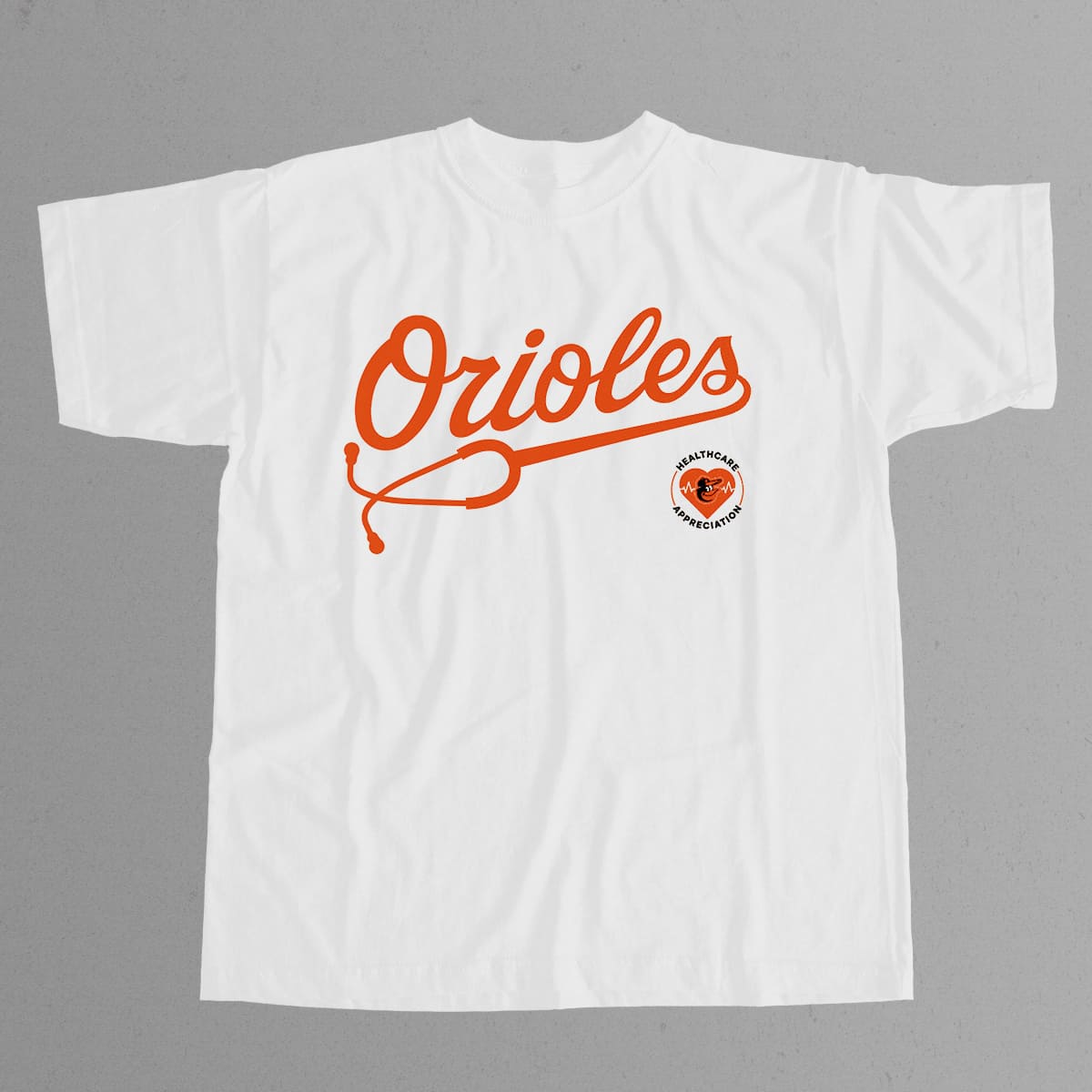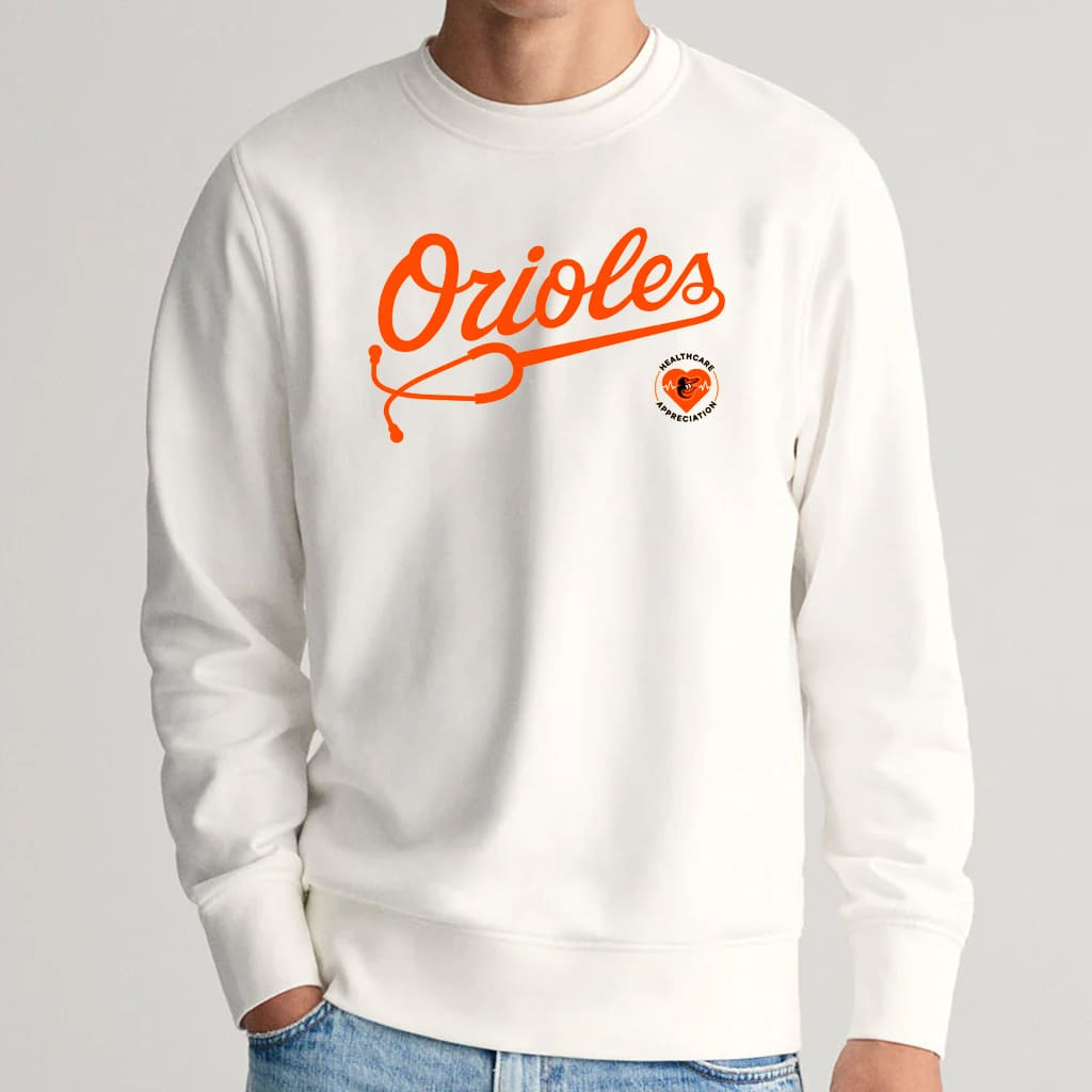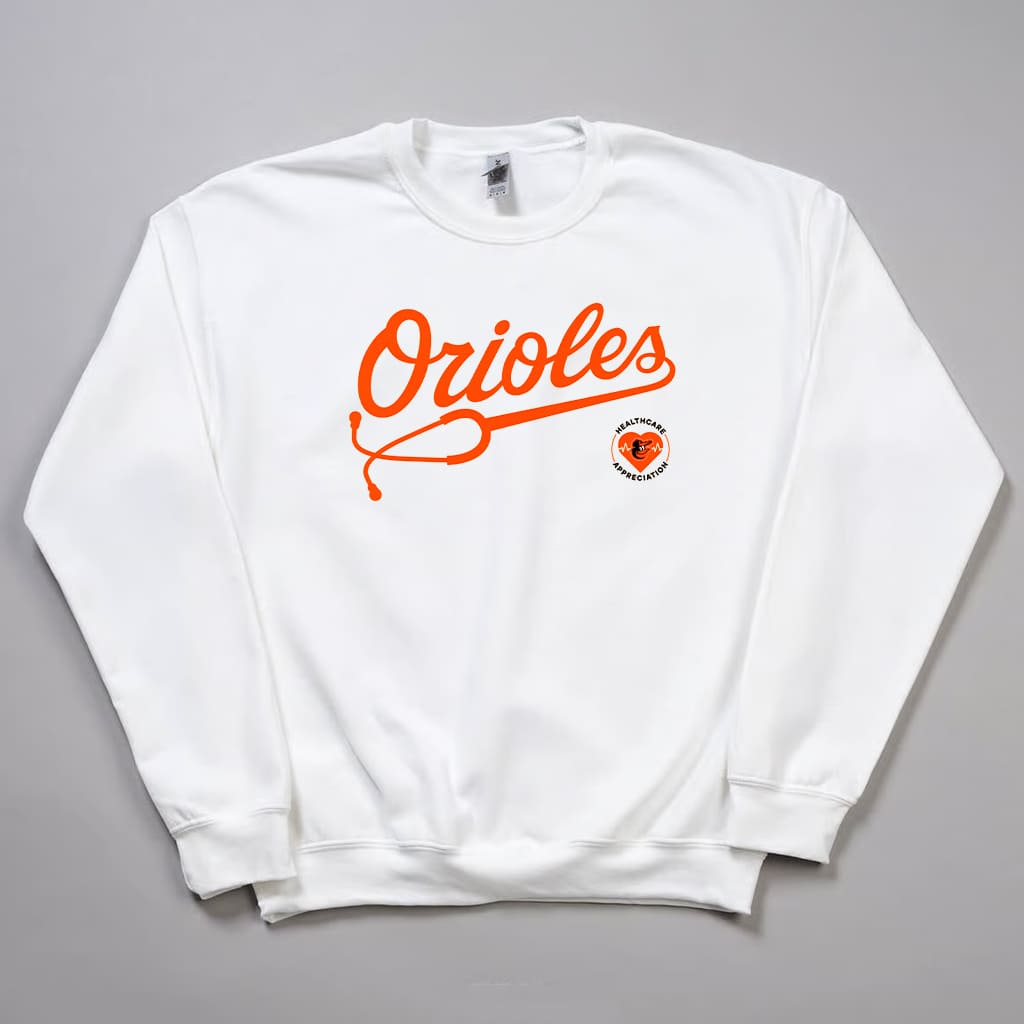 This sweatshirt comes in a pure white design, featuring the classic Orioles script transformed into a stethoscope graphic and a bright orange heart-shaped “Healthcare Appreciation” badge on the right side. The imagery symbolizes care, dedication, and the fighting spirit of both healthcare workers and Orioles fans. You can receive this item as part of a ticket package for the game, or purchase a premium version directly at iFrogtees.