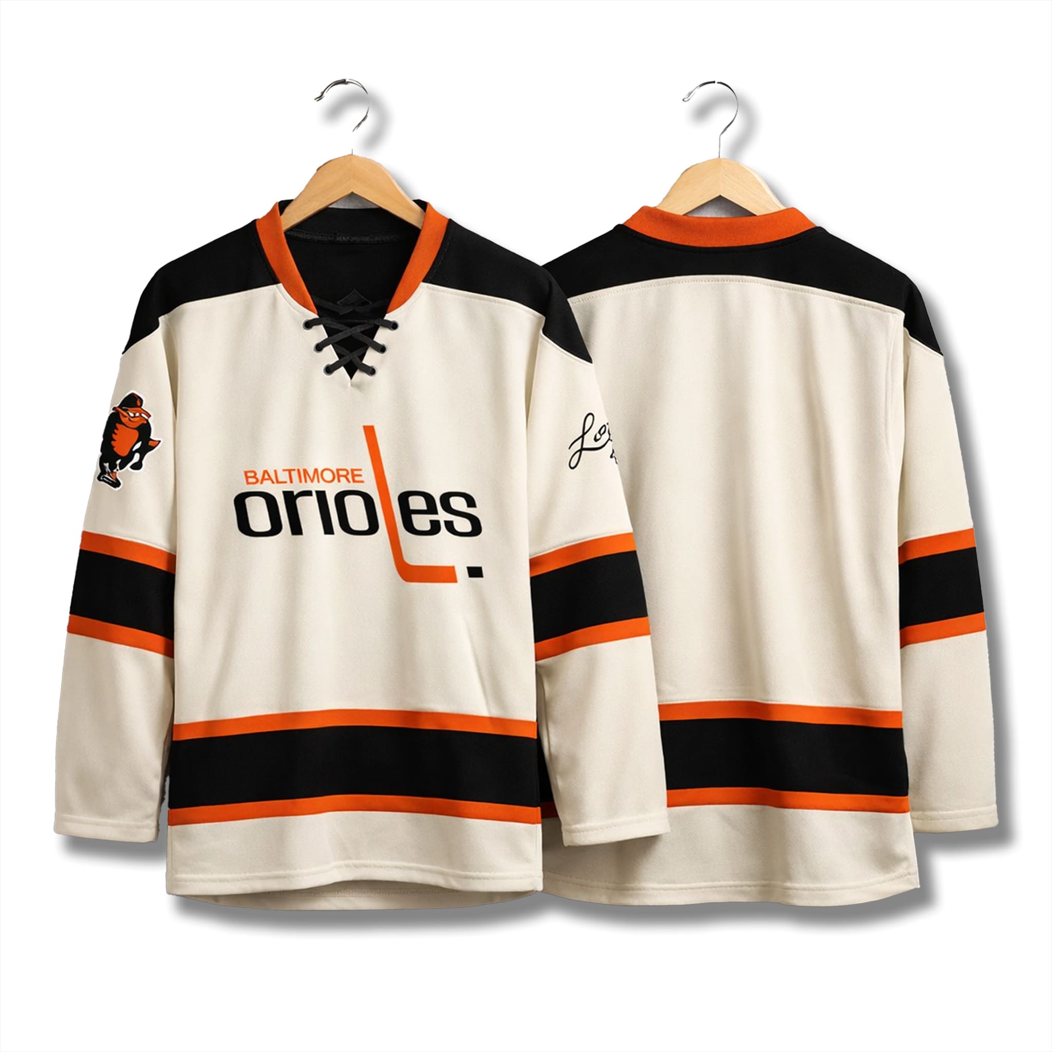 This jersey features a classic cream-colored hockey style, standout orange wordmark in an original Caps-inspired style, signature orange-black trim on the collar and sleeves, and a stylized Oriole bird logo on the sleeve, creating a strong retro, dynamic, and proud Birdland feel.