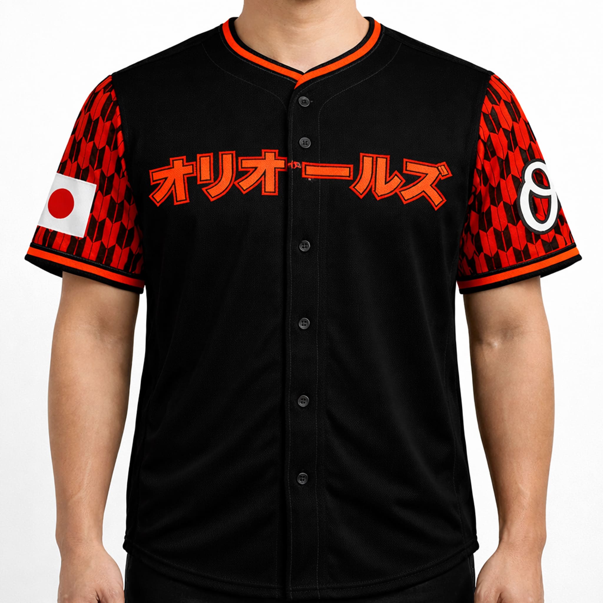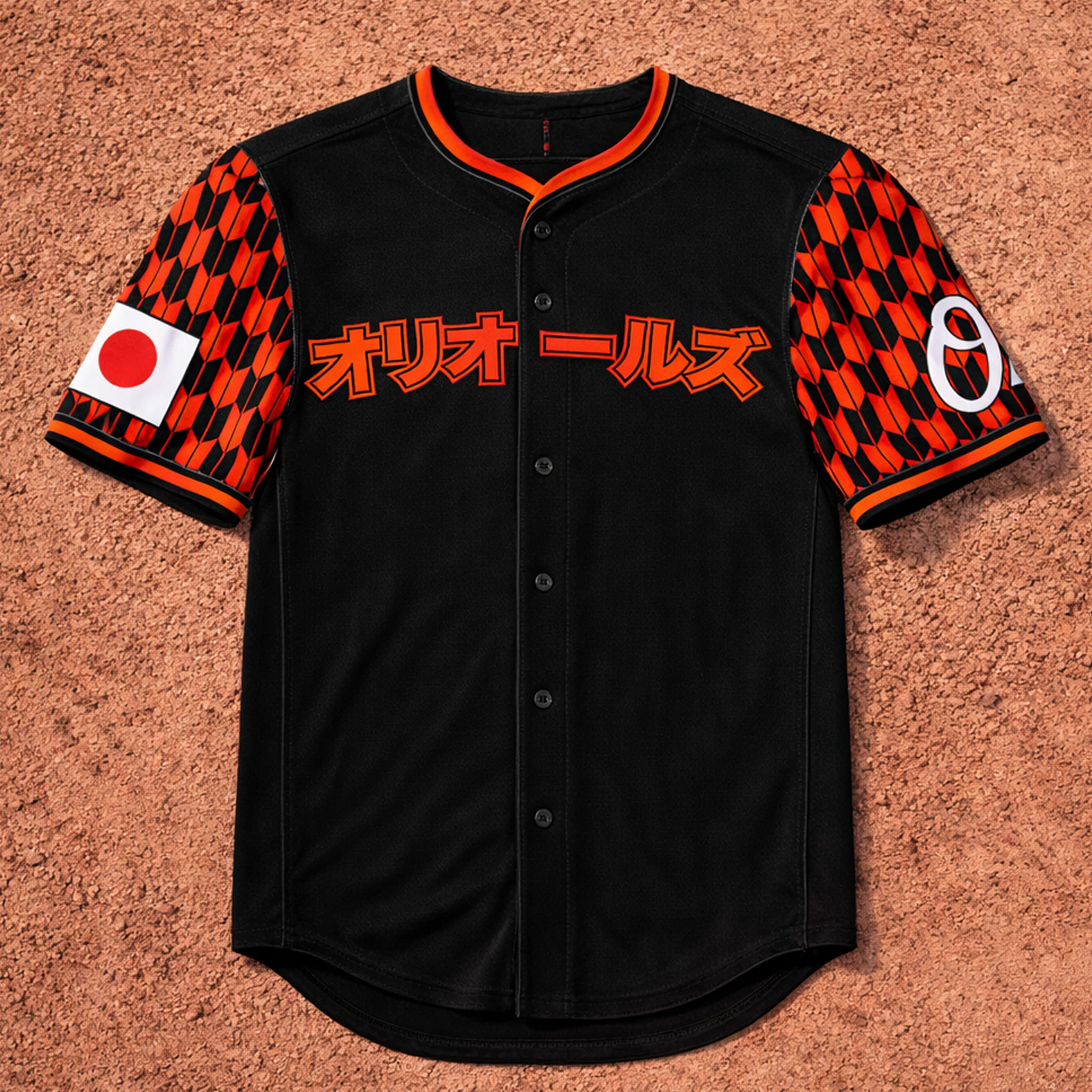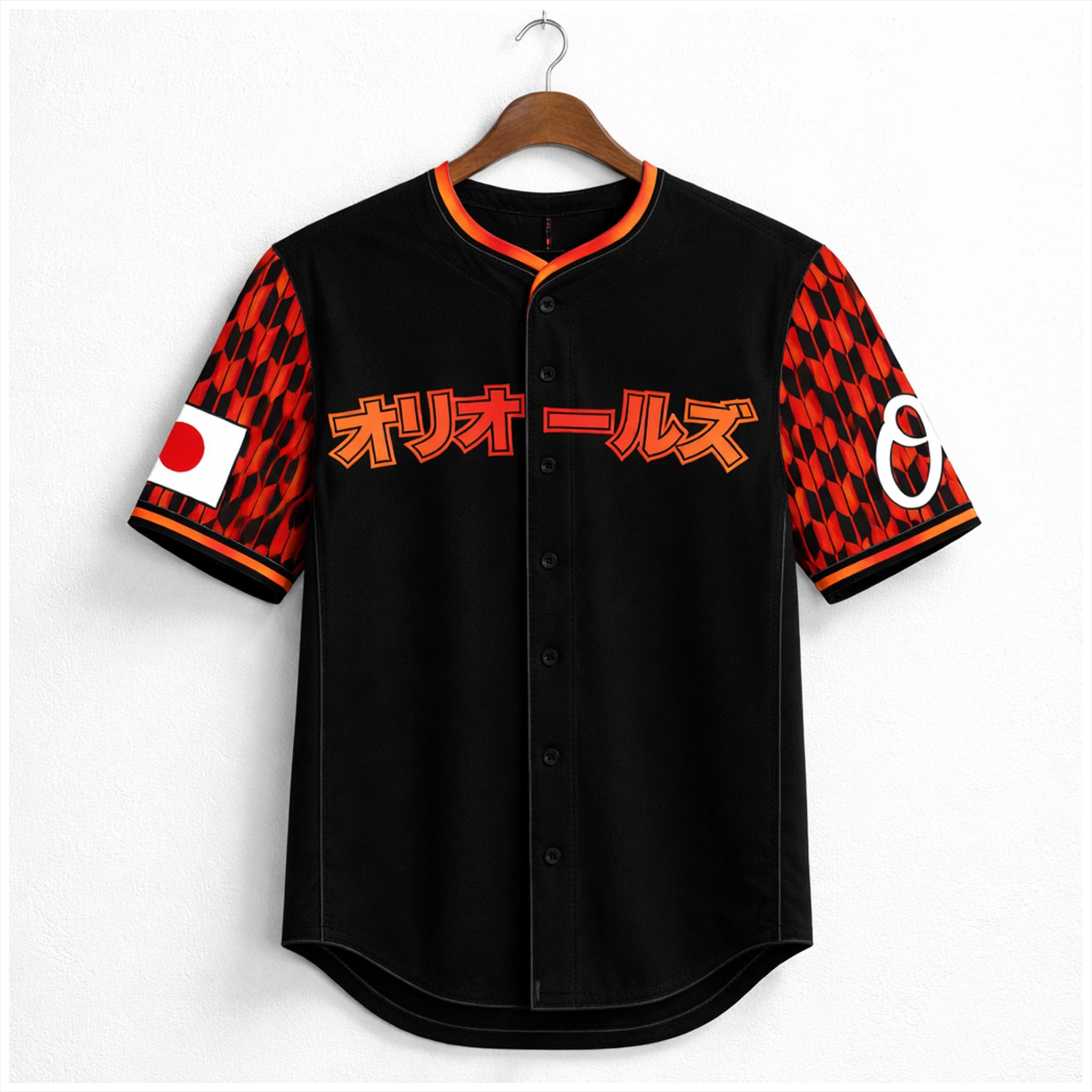 This design impressively blends culture and sport: a mysterious black base, large “オリオリオールズ” lettering embroidered in vibrant orange with an artistic style, a Japanese flag patch on the right sleeve, and “Orioles” in bright orange on the left sleeve in a classic style. The orange-and-black trim on the collar and sleeves adds a bold touch, while the team name written in Japanese (Kanji/Hiragana) creates a powerful sense of pride – honoring Japanese heritage while fully preserving the Orioles spirit.
