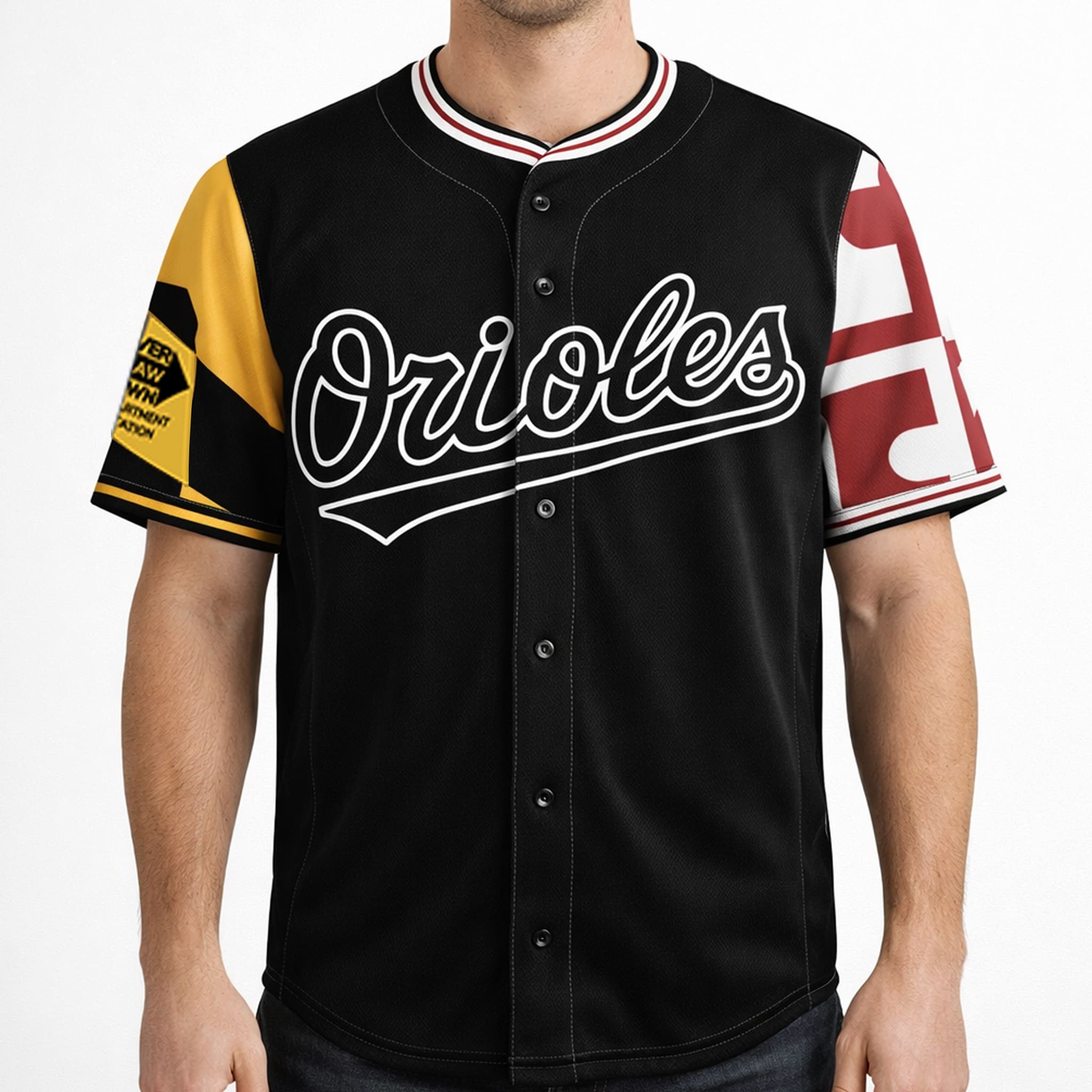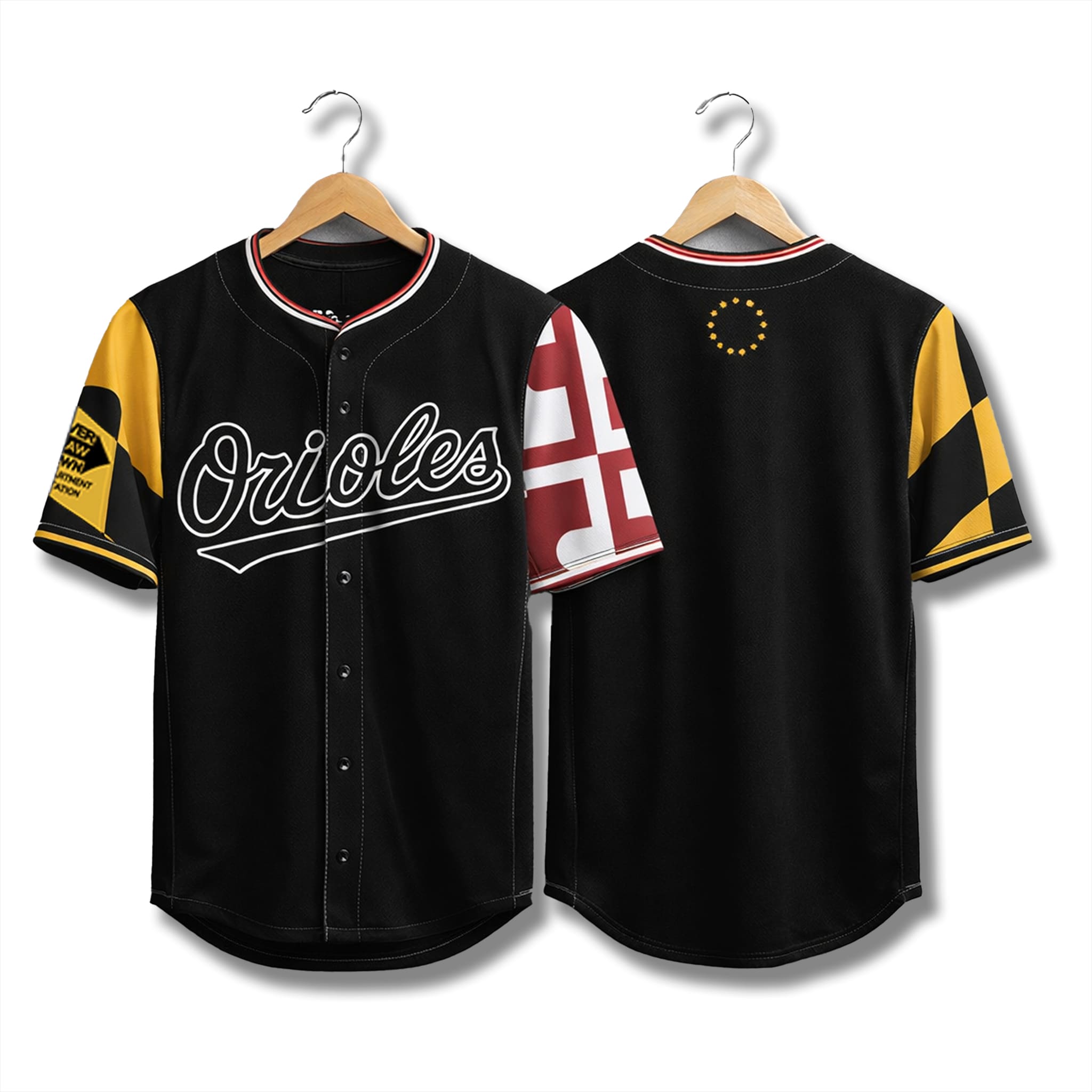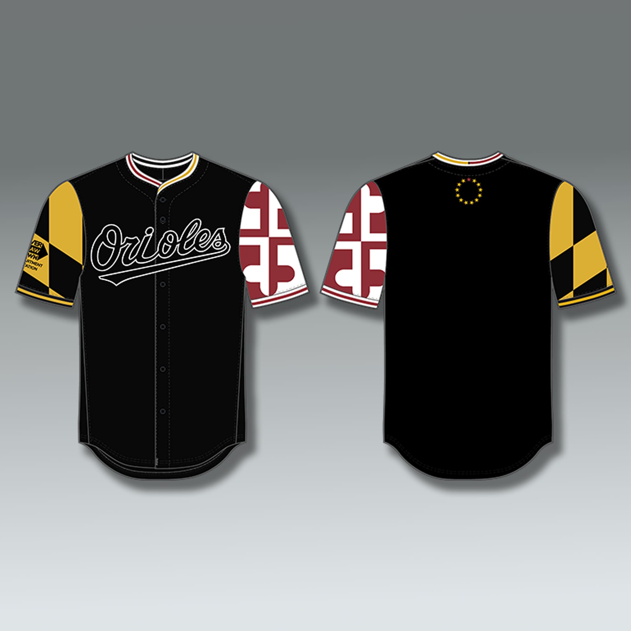 This eye-catching design is directly inspired by the Maryland state flag: a bold black base creates a strong backdrop, while the classic white “Orioles” lettering stands out across the chest. The sleeves feature the signature black-and-gold diamond pattern of the Maryland flag, along with red-and-white cross elements. Overall, the jersey creates a powerful sense of Maryland pride, blending perfectly with the spirit of the Orioles – modern in style while still honoring hometown heritage.