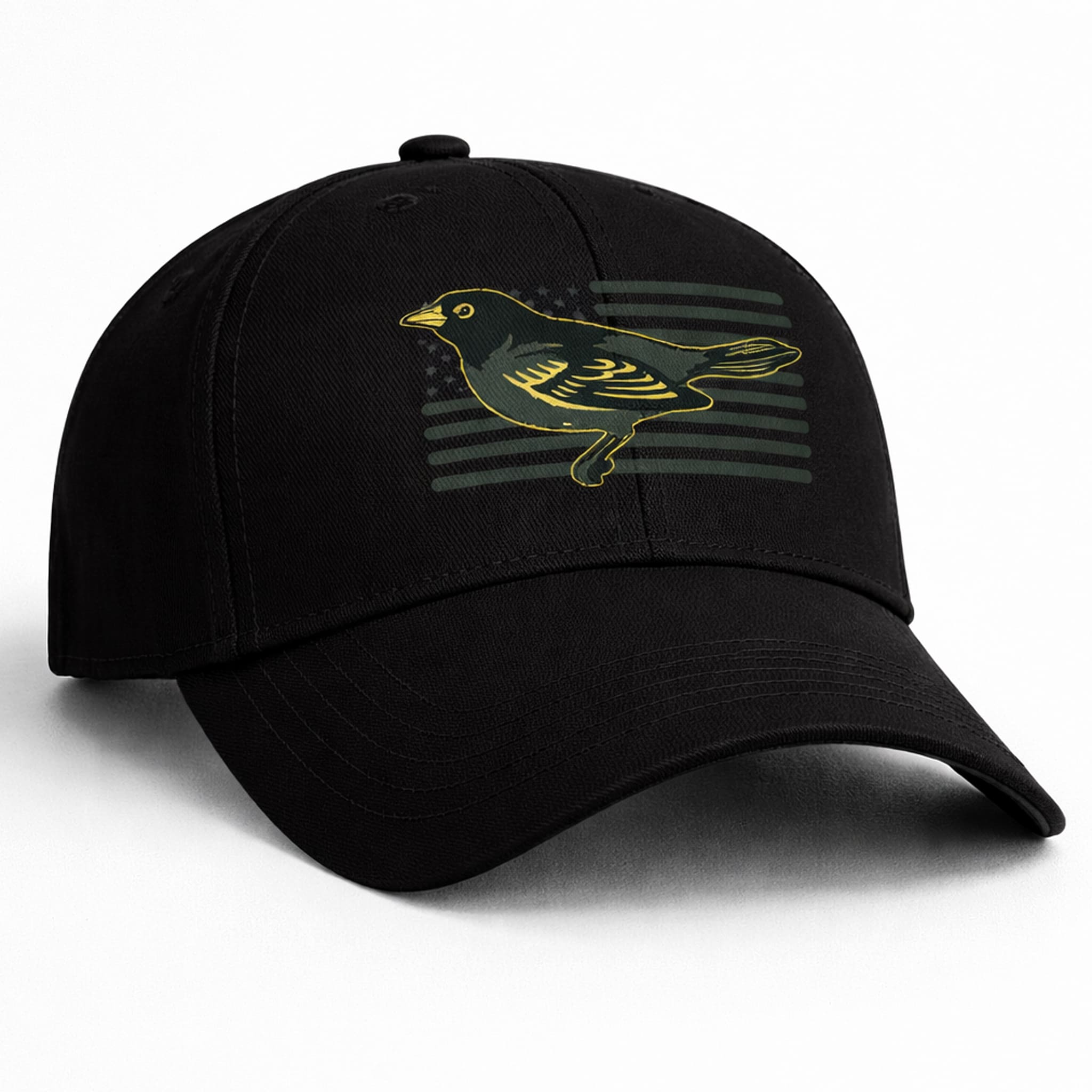 The overall design of the hat reflects a military tribute style: a mysterious black base, a stylized Oriole bird logo in vibrant olive-drab green with yellow trim, combined with American flag elements, creating a strong, patriotic feel that fits the military theme while still maintaining Baltimore’s sporting spirit.