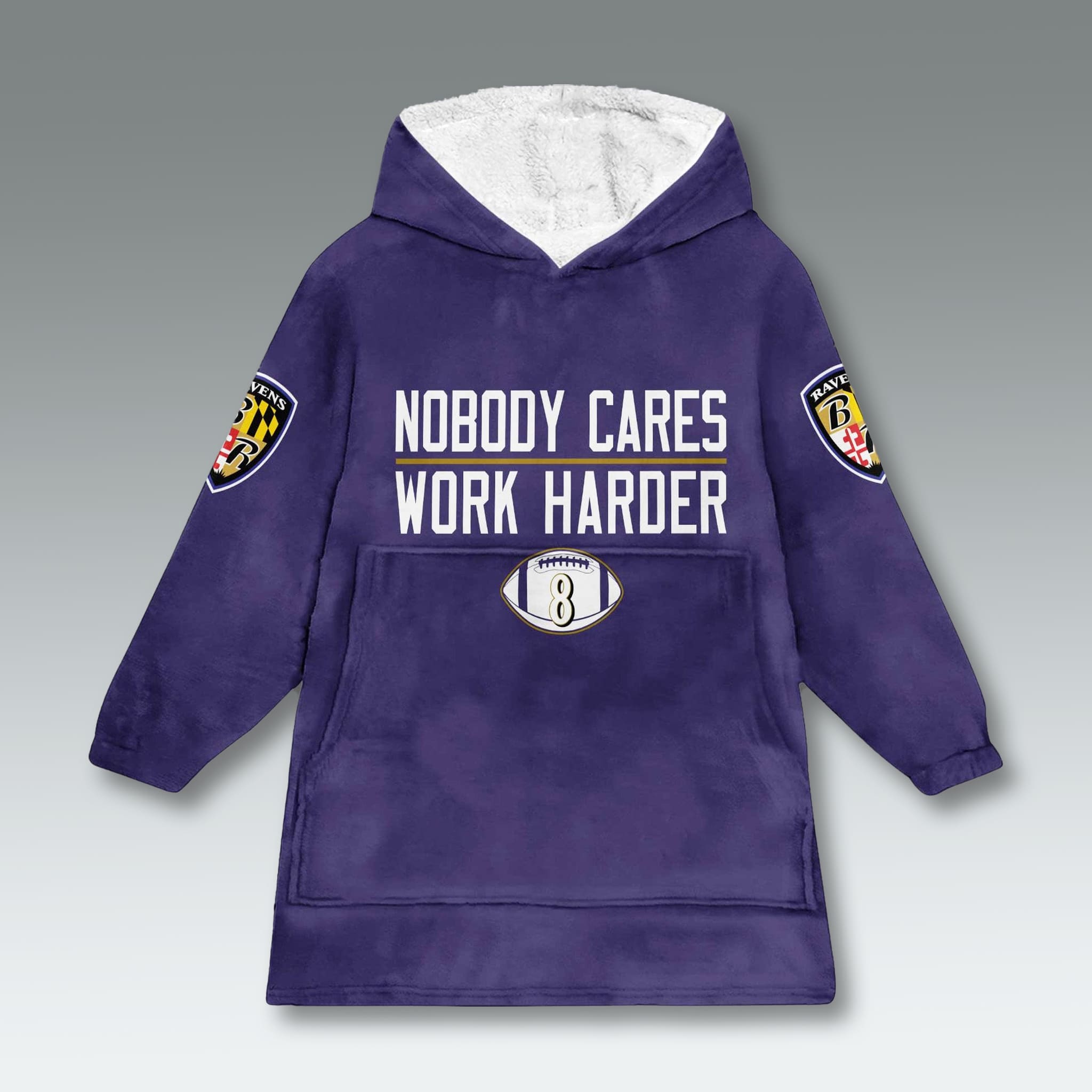 The Ravens Nobody Cares Work Harder Unisex Blanket Hoodie is more than just an oversized cozy hoodie – it’s a bold statement of determination and relentless effort, featuring the motivational message “Nobody Cares Work Harder.” Highlighted with the iconic number 8 representing Lamar Jackson, this blanket hoodie is perfect for fans who want to stay warm while proudly showing their team spirit and drive to excel. Made from ultra-soft fabric with a thick Sherpa lining, it ensures maximum comfort and warmth.