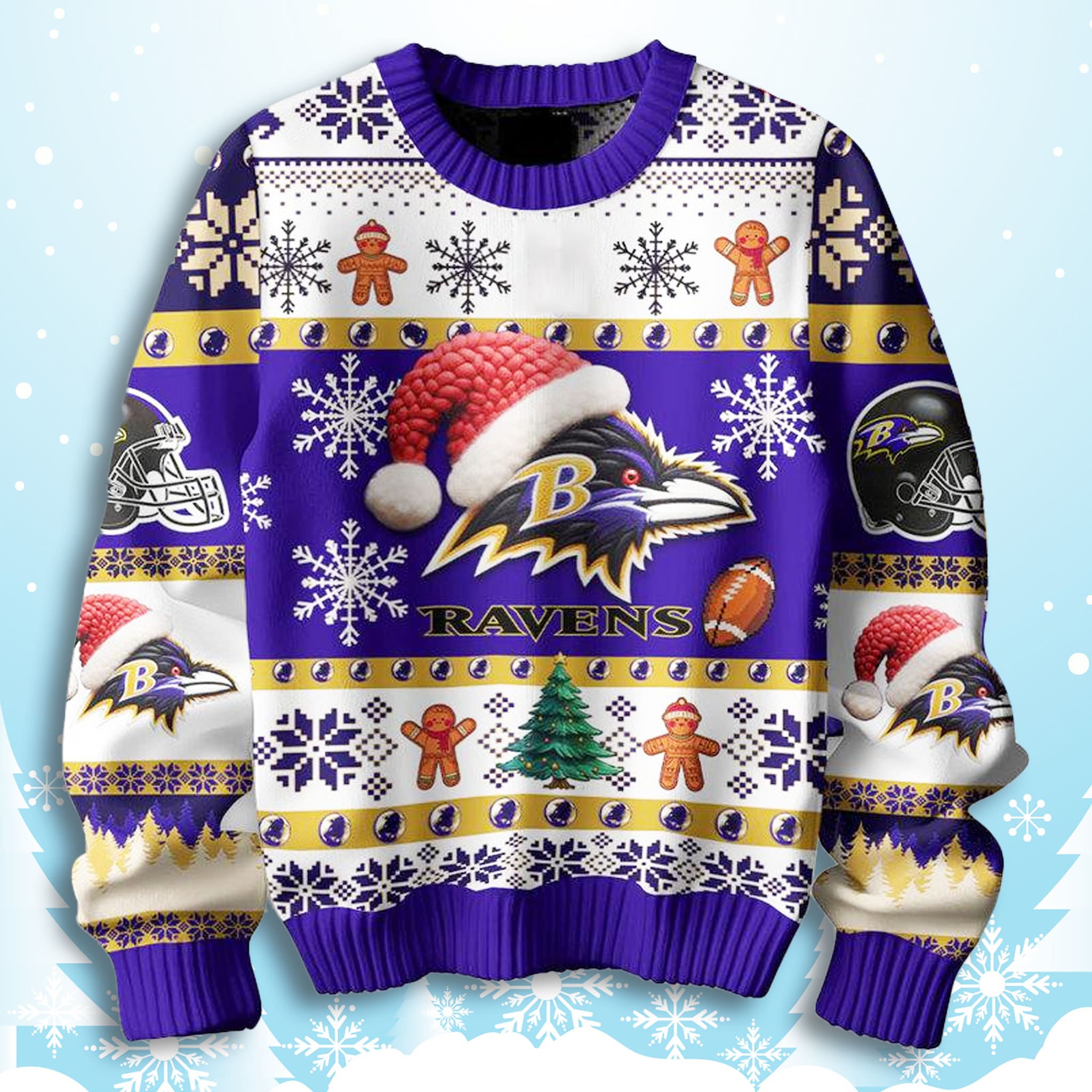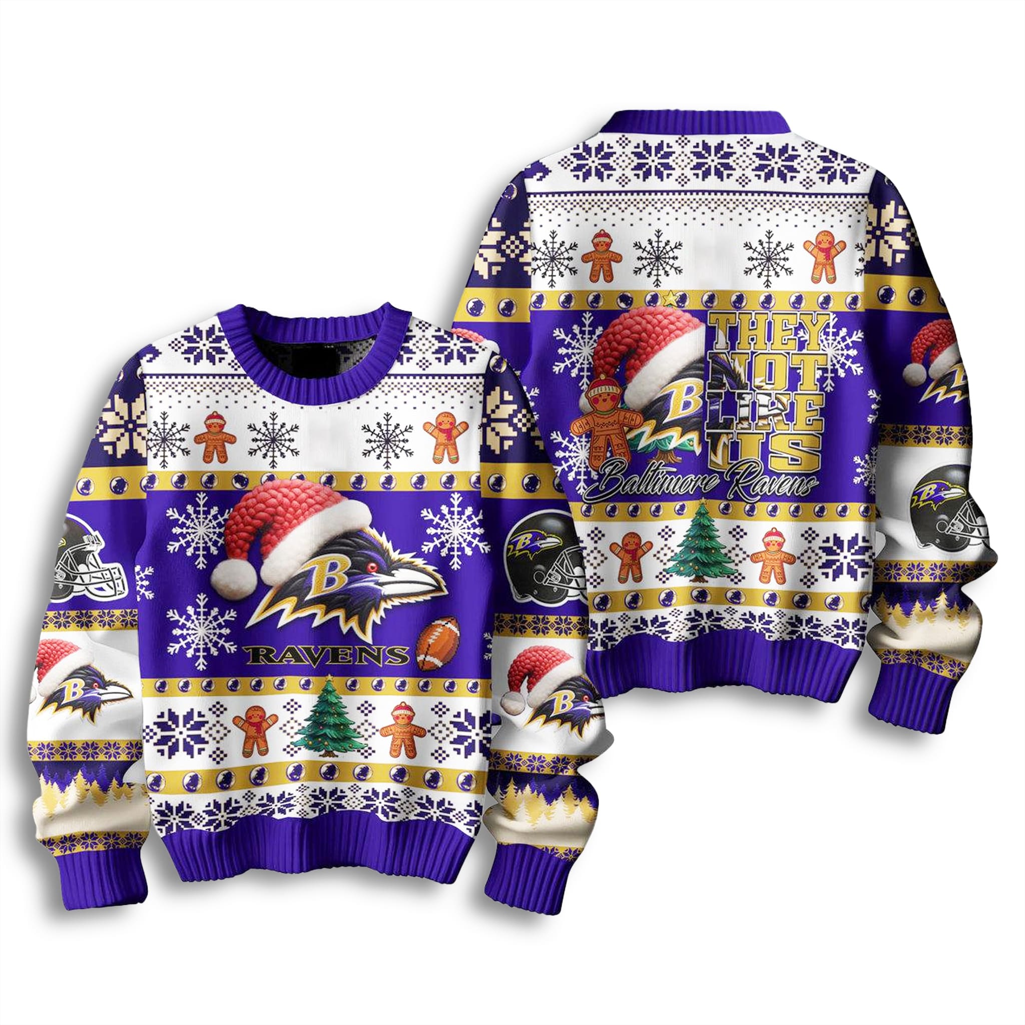 This Baltimore Football UglySweater is steeped in the team’s iconic purple, black, and gold, set against a classic white holiday knit. It masterfully mixes traditional festive patterns like snowflakes and gingerbread men with the fierce Ravens logo (wearing a Santa hat) and the unmissable “They Not Like Us” text, creating a look that’s both merry and menacing.