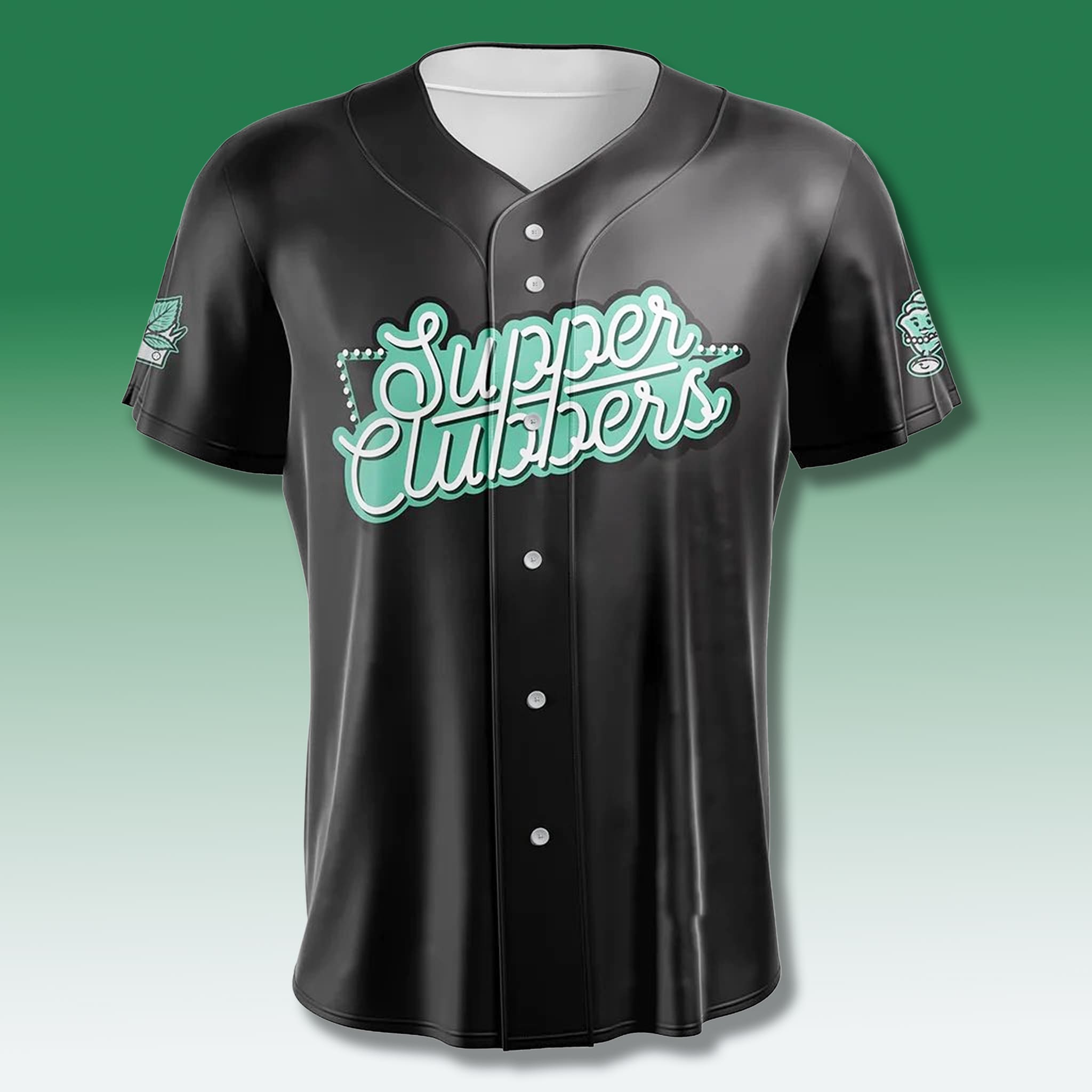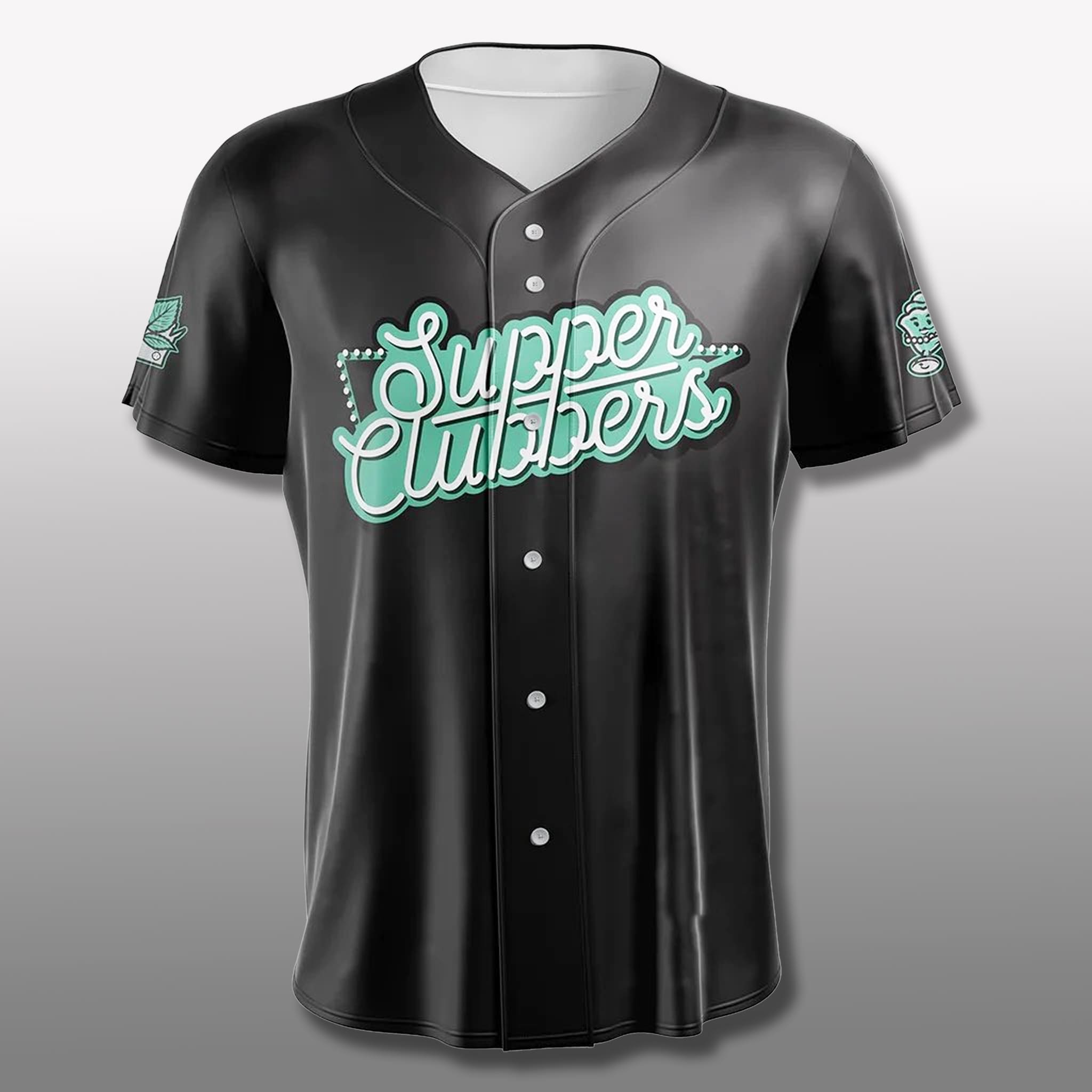 This jersey features a modern aesthetic with a sleek black body, highlighted by glowing teal neon script reading “Supper Clubbers,” along with a neon sign icon and stylized leaves. The black–teal palette delivers a retro neon effect, perfect for game-day or casual styling and easy to pair with shorts for fans of both baseball and regional cuisine.