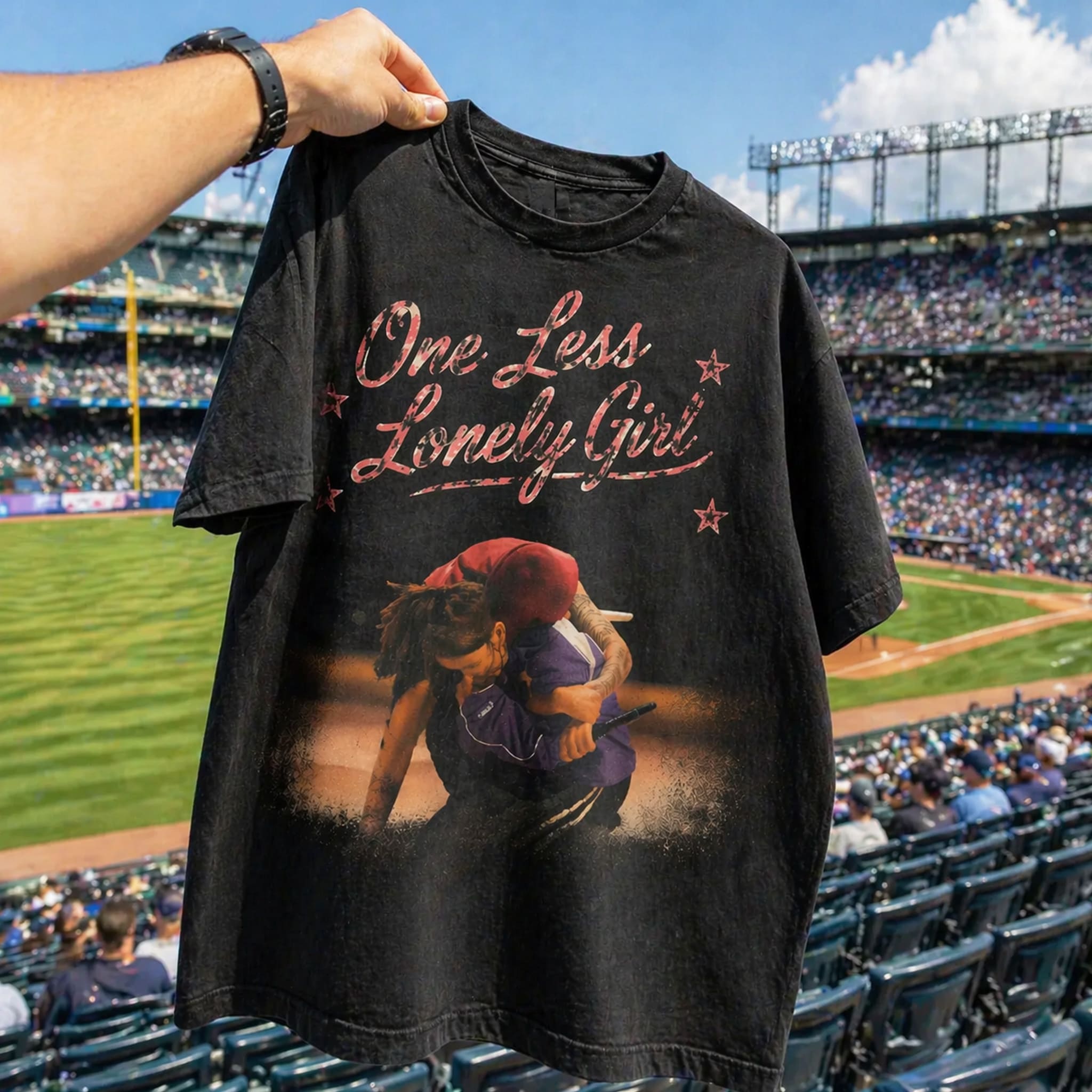 The Justin Bieber Billie Eilish One Less Lonely Girl T-Shirt is a viral black vintage-style design that recreates one of the most emotional moments of Coachella Weekend 2 (April 18, 2026). The shirt features an artistic distressed print of the two artists hugging on stage, combined with the retro pink “One Less Lonely Girl” text, turning a full-circle moment into meaningful merch that celebrates the genuine friendship between two superstars.