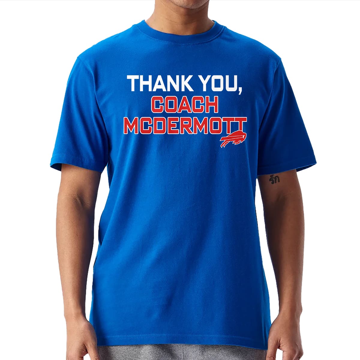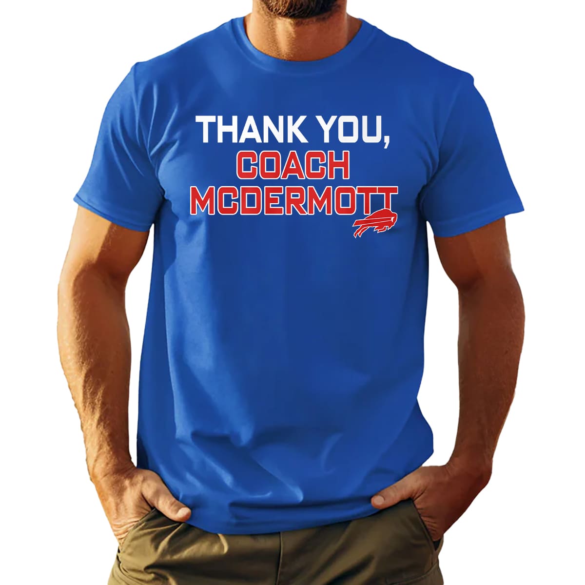 This shirt is simple yet powerful, set on a vibrant Bills blue background with standout white-and-red lettering reading “THANK YOU, COACH MCDERMOTT,” accompanied by a small red buffalo logo and refined details. The overall look feels warm, sincere, and easily recognizable from a distance. Available now at iFrogtees in multiple sizes and color options to express unity with the team and this coach.