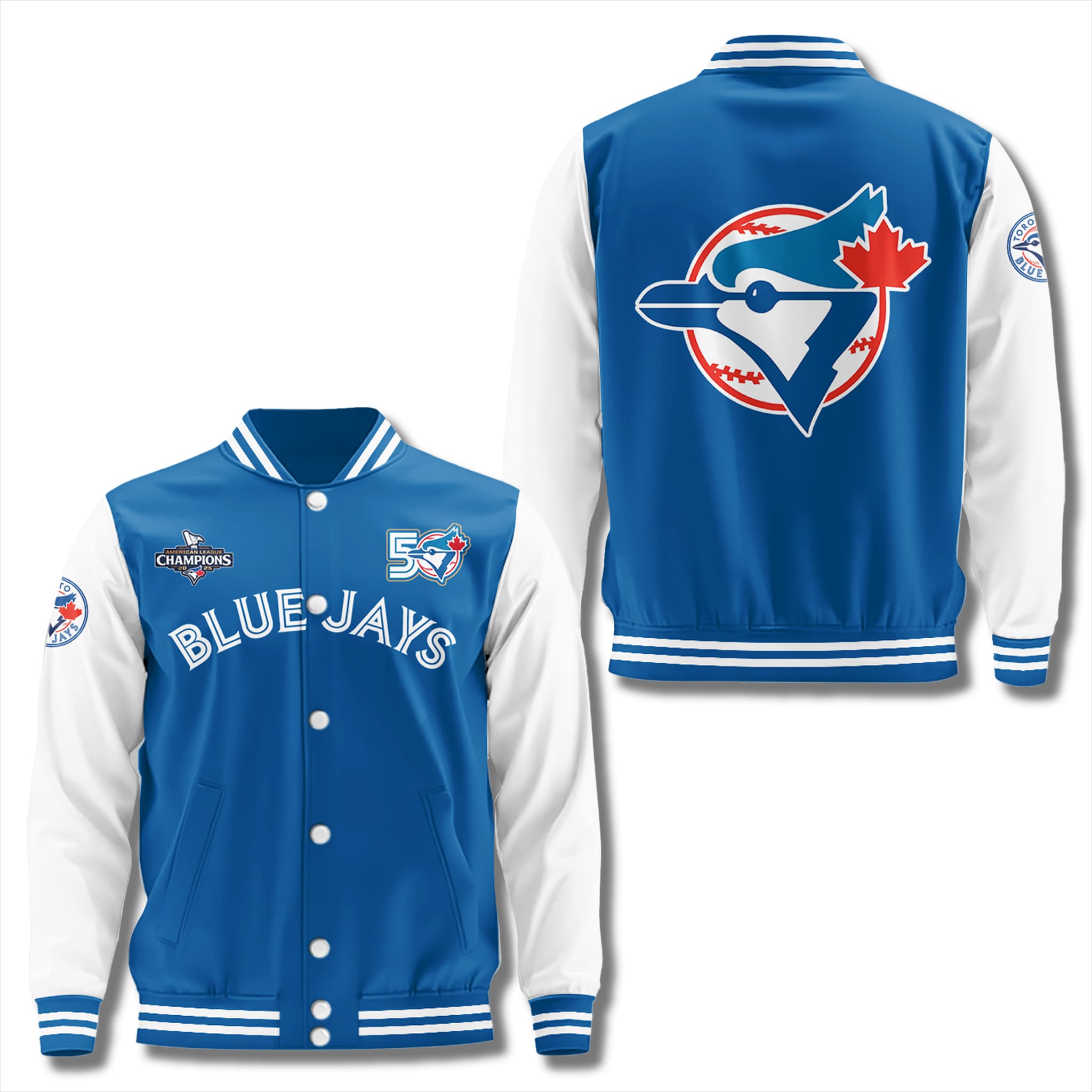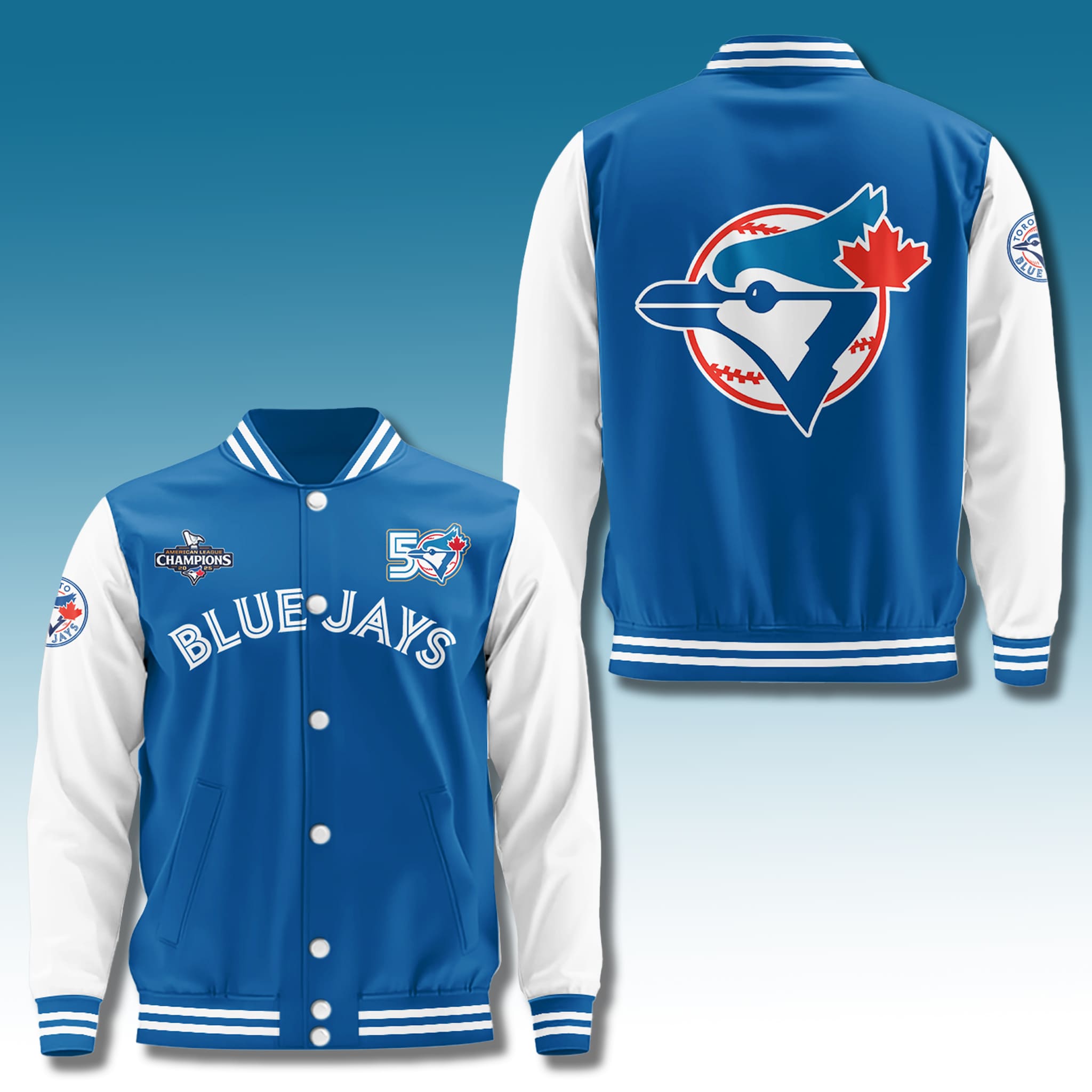 This commemorative varsity jacket features a classic collegiate style with the signature blue-and-white color combination, creating a look that is both dynamic and elegant. The most valuable highlights are the pair of finely embroidered 50 Seasons logos and the 2025 American League Champions badge on the front, along with a massive Blue Jays emblem dominating the center of the back.