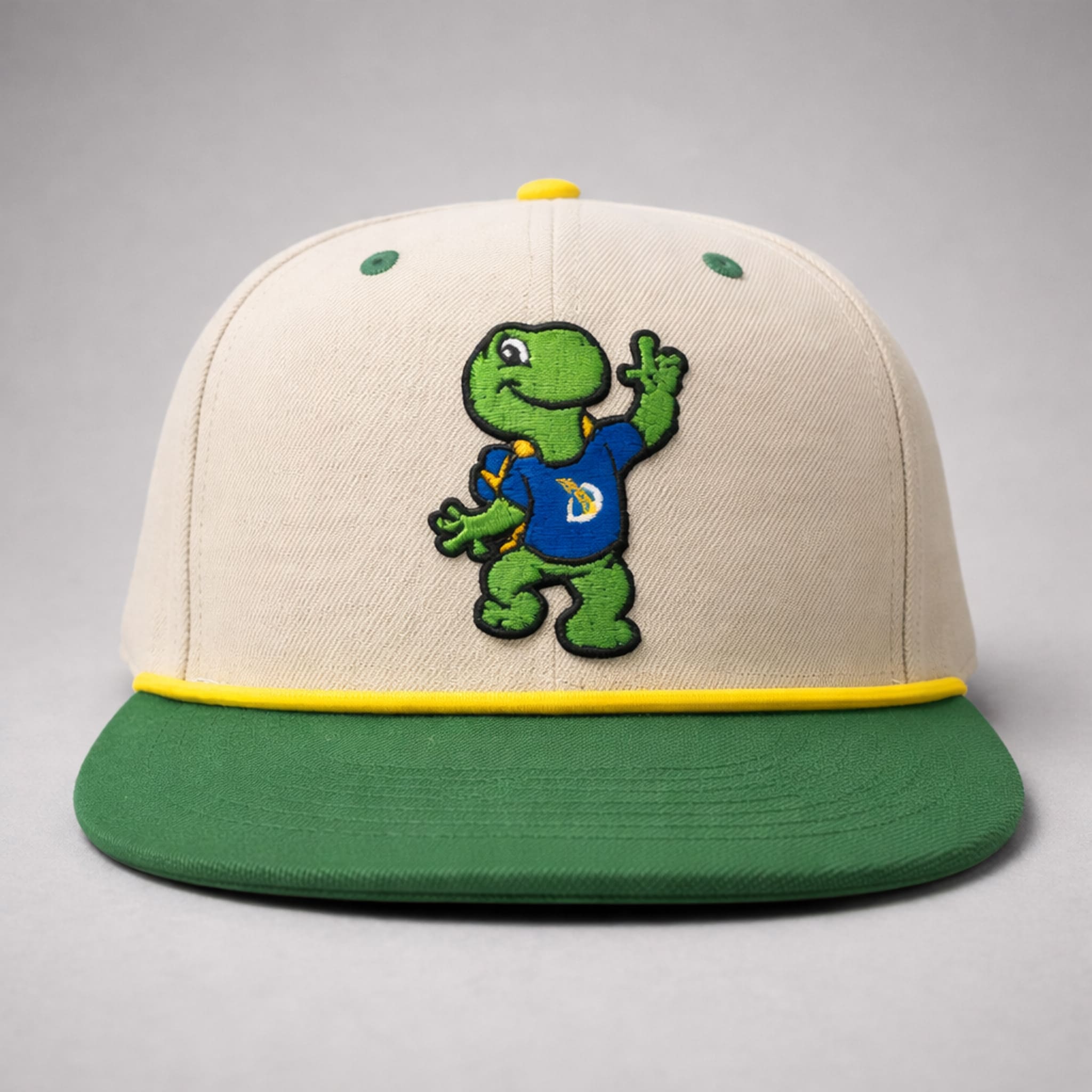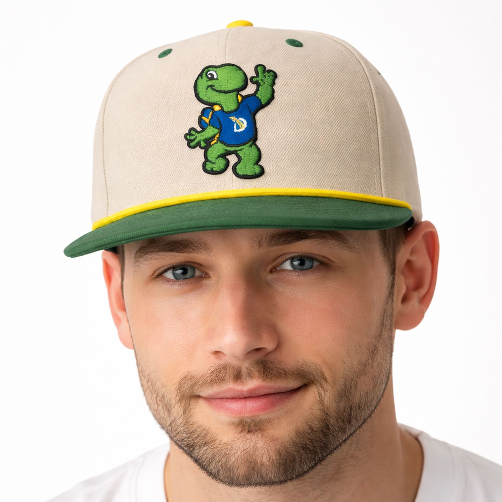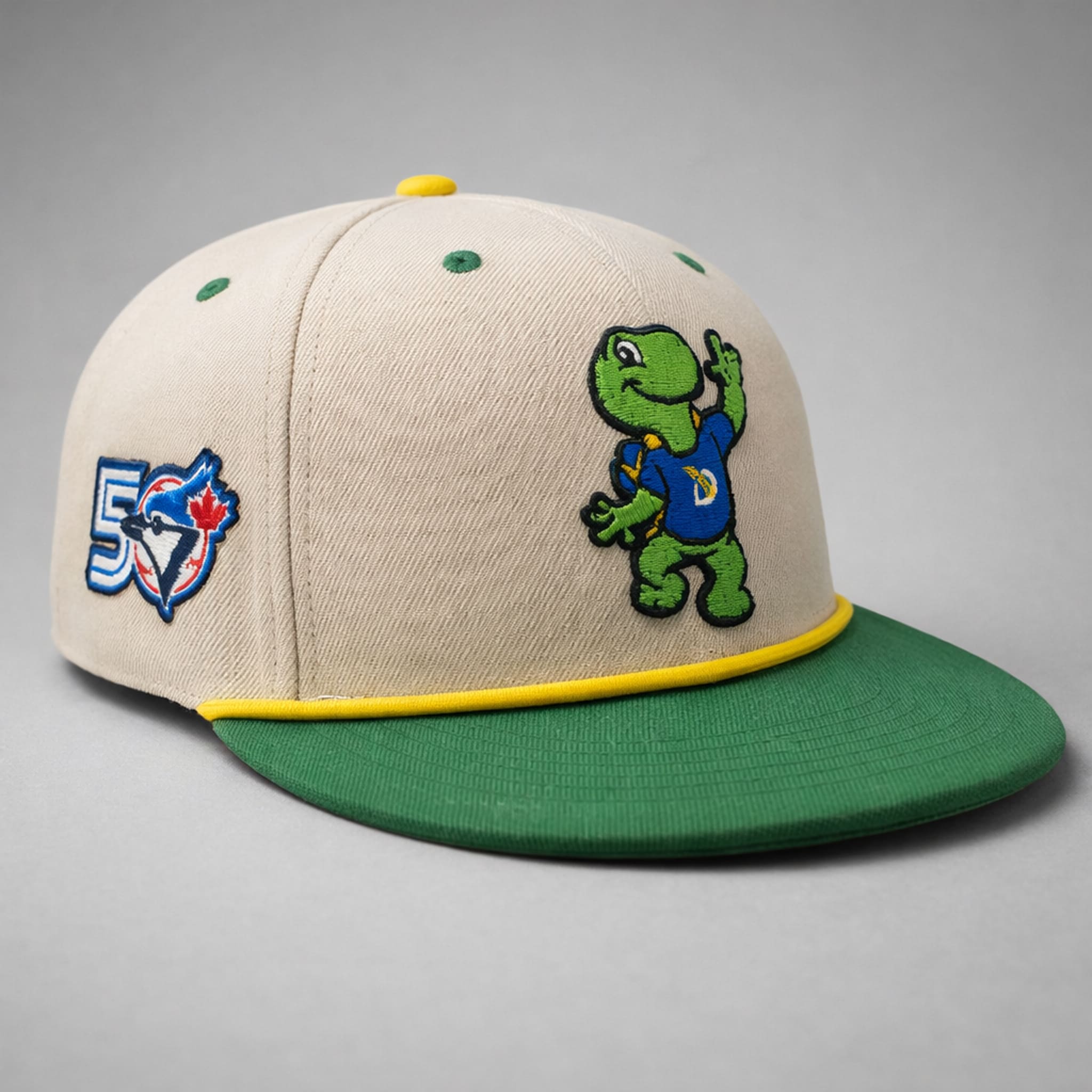 This cap stands out with its vintage design: a classic cream base, bright green brim trim, a bold yellow top button, a “50” side patch featuring the SkyDome– era Blue Jays emblem (blue jay, maple leaf, baseball), and a large embroidered image of Domer – the blue turtle wearing a blue shirt with the letter “D,” cheerfully flashing a peace sign – creating a strong retro color combination. It is a keepsake that recalls the team’s golden era and its most beloved mascot in history.