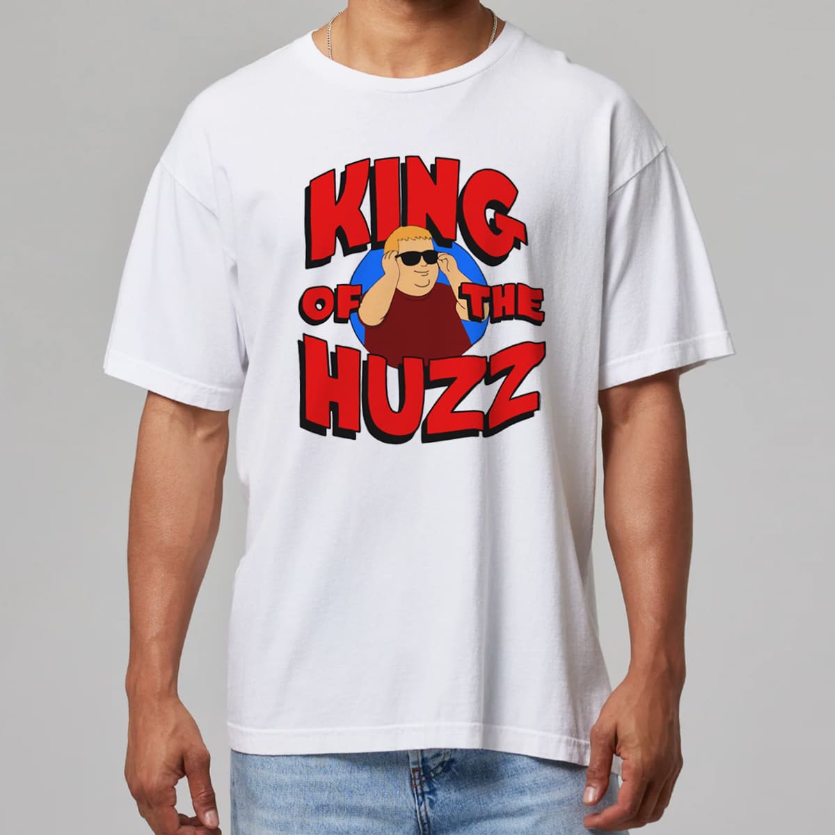 The design features a cartoonish Bobby – blond, sunglasses, grinning in a red “Huzz” T-shirt—centered on a bright red “KING OF THE HUZZ” on a crisp white cotton background, delivering a comic book style that’s both fun, powerful, and instantly iconic.