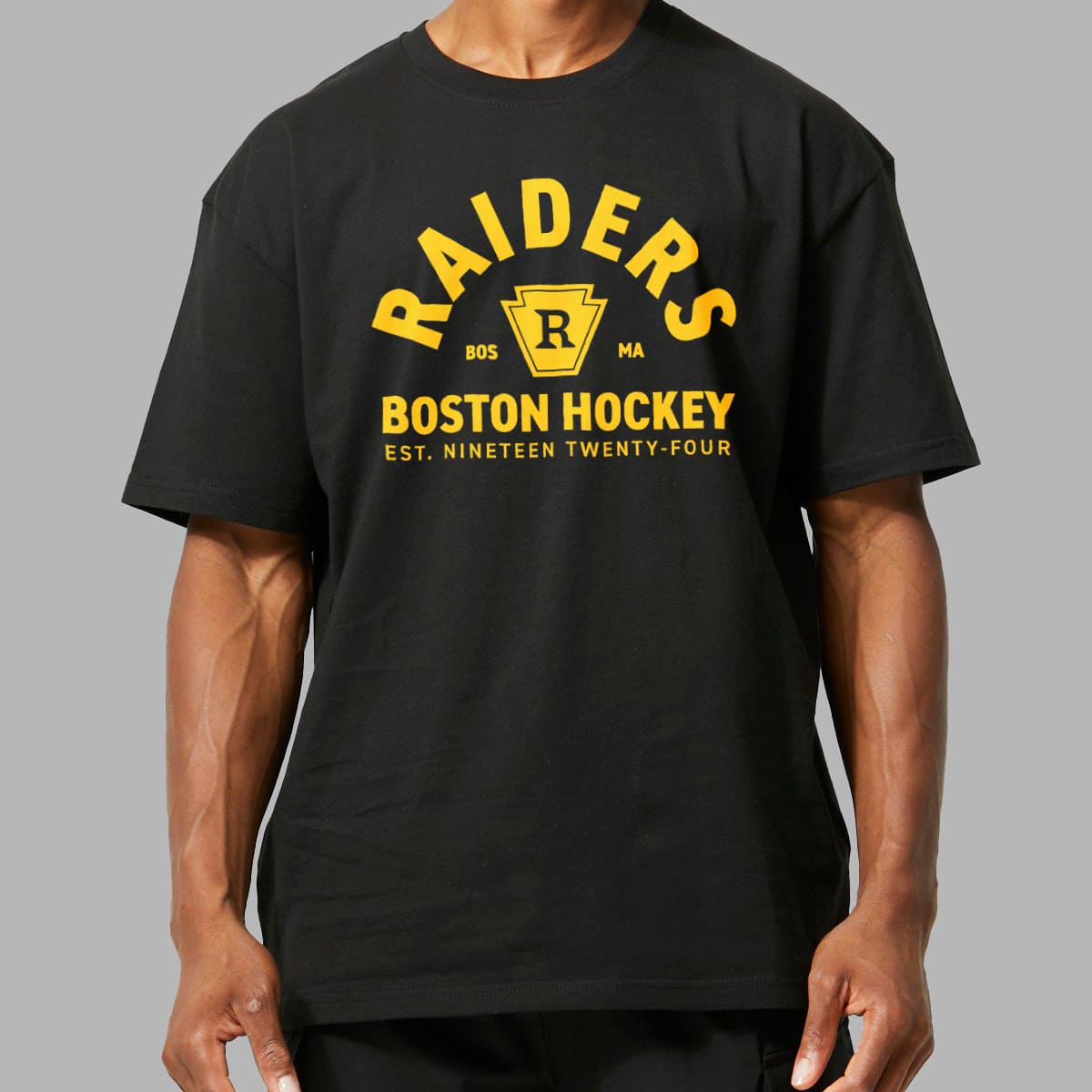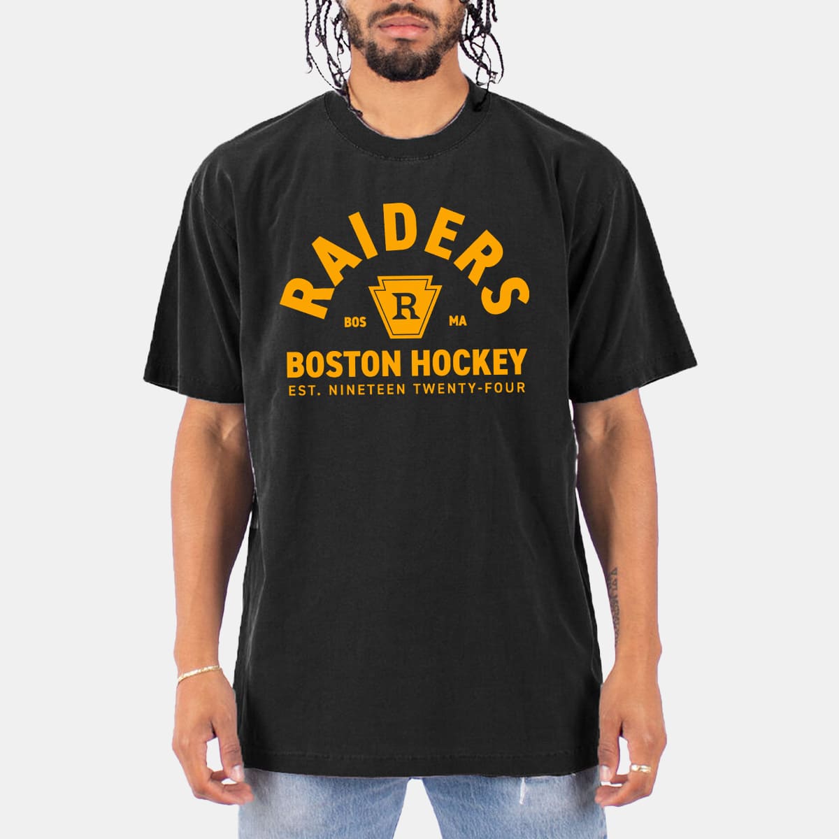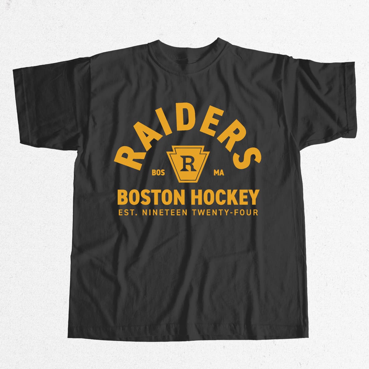 This design follows a classic vintage style on a black shirt background, featuring the message “Boston Hockey Est. Nineteen Twenty-Four.” The black-and-gold color scheme creates a strong, nostalgic feel, evoking the legacy of the Boston Bruins hockey heritage that inspired the Raiders team. Available now at iFrogtees in multiple sizes and styles, ready for you to wear while cheering for your favorite hockey team.