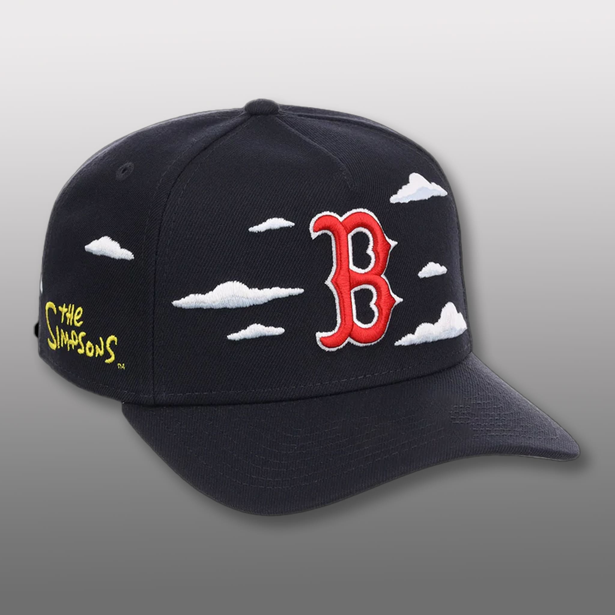 The Simpsons Red Sox Cloudy Hat brings the Cloudy style to Boston with a navy base, creating a darker, more subtle tone. Soft white clouds float across the cap in signature Simpsons style, with a red “B” logo outlined in white at the center, and the yellow “The Simpsons” text along the side. The contrast between navy and white clouds stands out clearly.