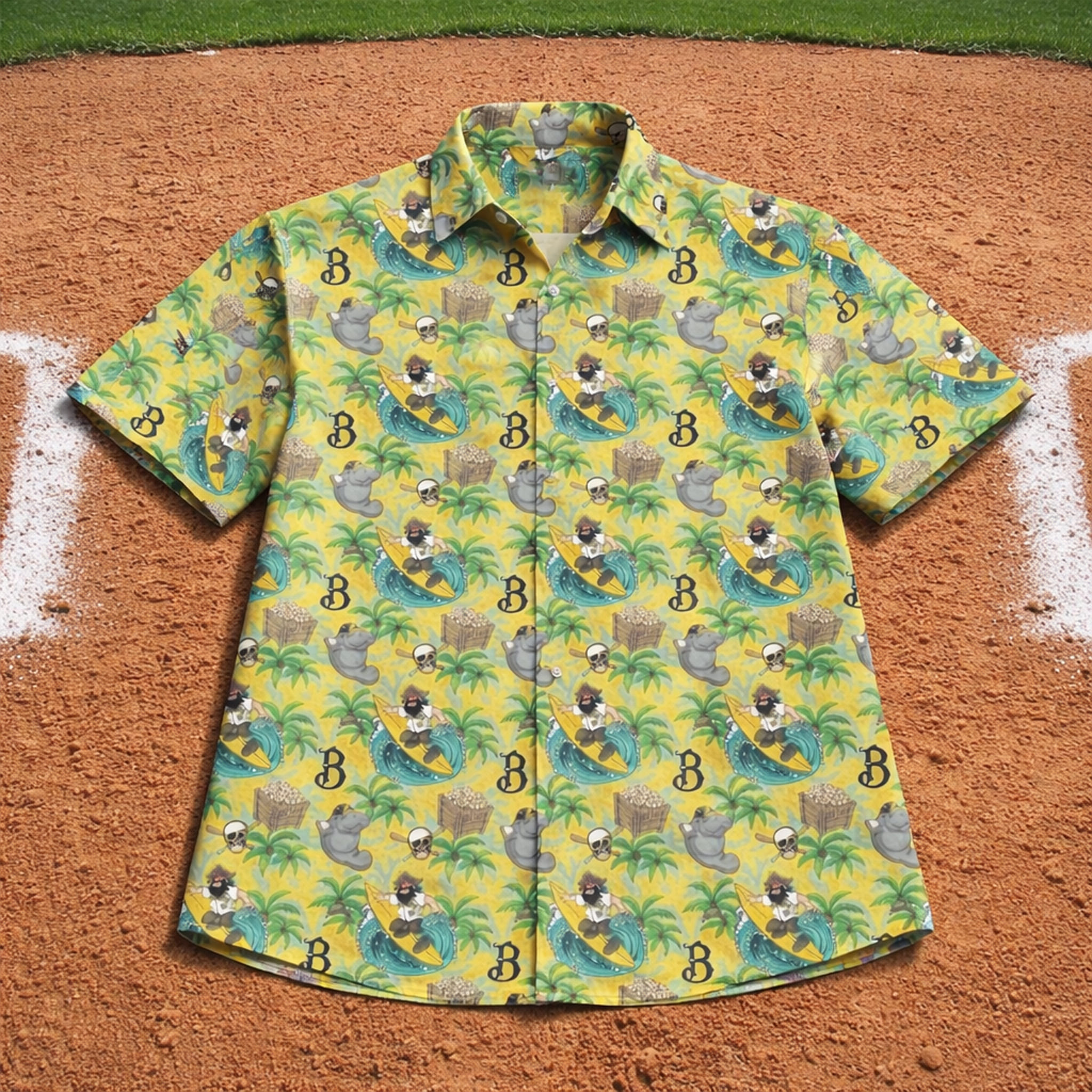 Saturday, May 2, 2026 – Margaritaville Night presented by Anna Maria Oyster Bar – is that night. The Bradenton Marauders will give away 750 bright yellow Hawaiian shirts to the earliest arriving fans. The eye-catching all-over print features a sunny yellow base – a symbol of Florida summer – covered in lively tropical graphics: seahorses, surfing pirate icons, treasure chests filled with gold, green palm trees, and the Marauders “B” logo.