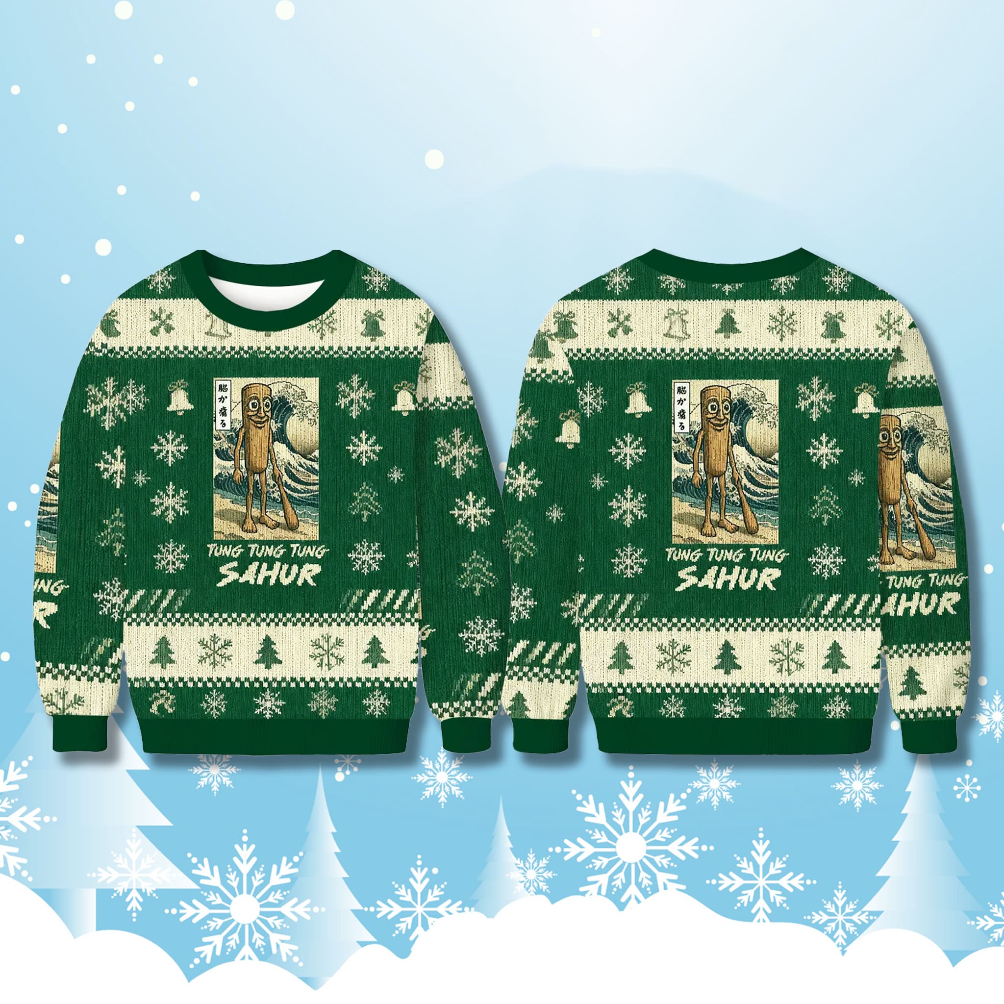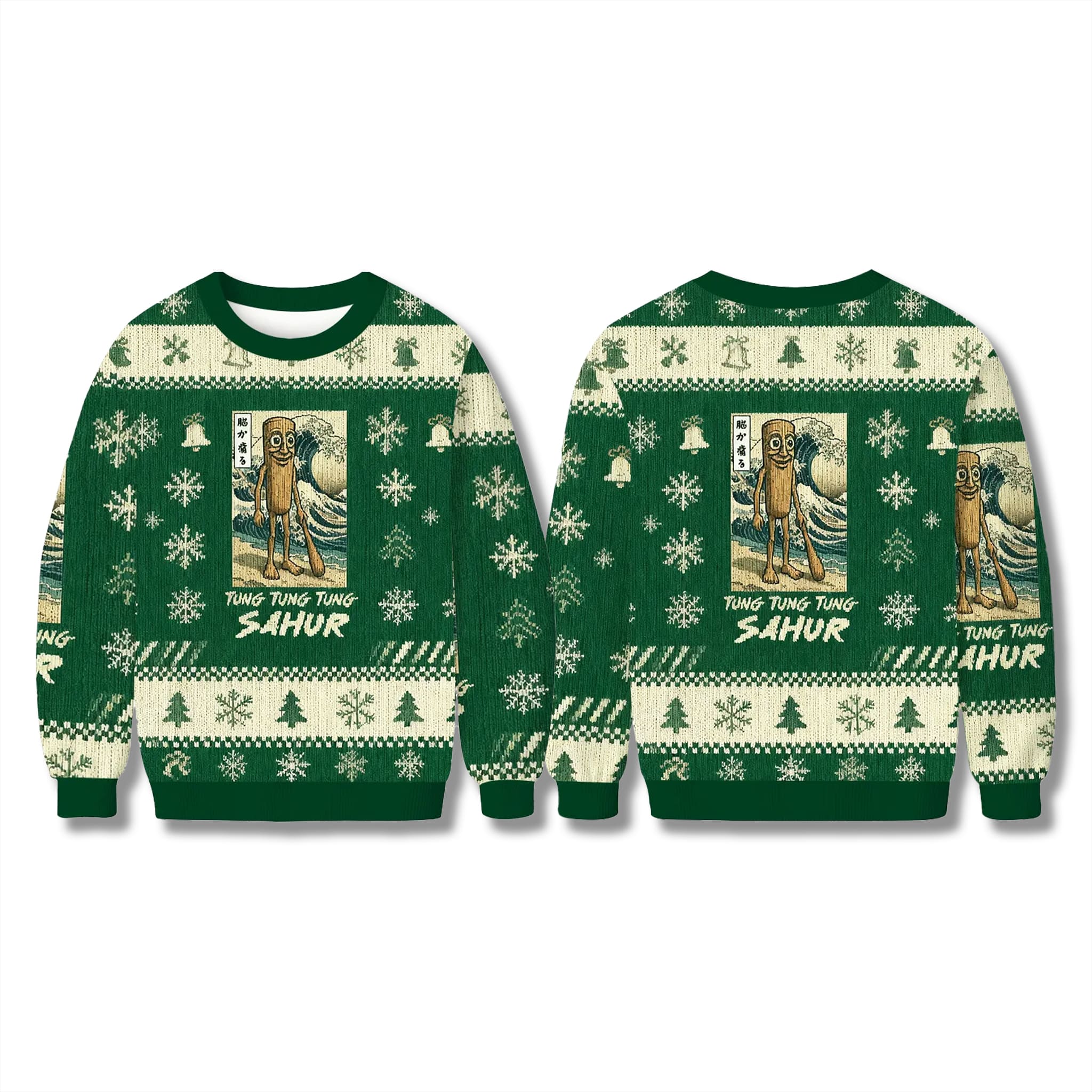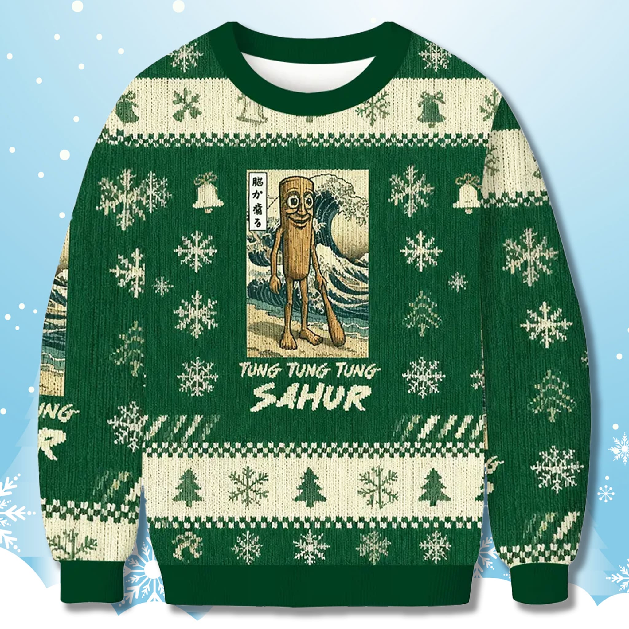 The central graphic features of this Brainrot Tung Tung Tung Sahur Ugly Christmas Sweater is the meme character, a cylindrical figure wielding a stick, standing on a beach against a tumultuous sea reminiscent of the classic Japanese Ukiyo-e woodblock print. This surreal scene is framed by the striking text “Tung Tung Tung Sahur” and is set against a traditional green and white Christmas Fair Isle pattern.