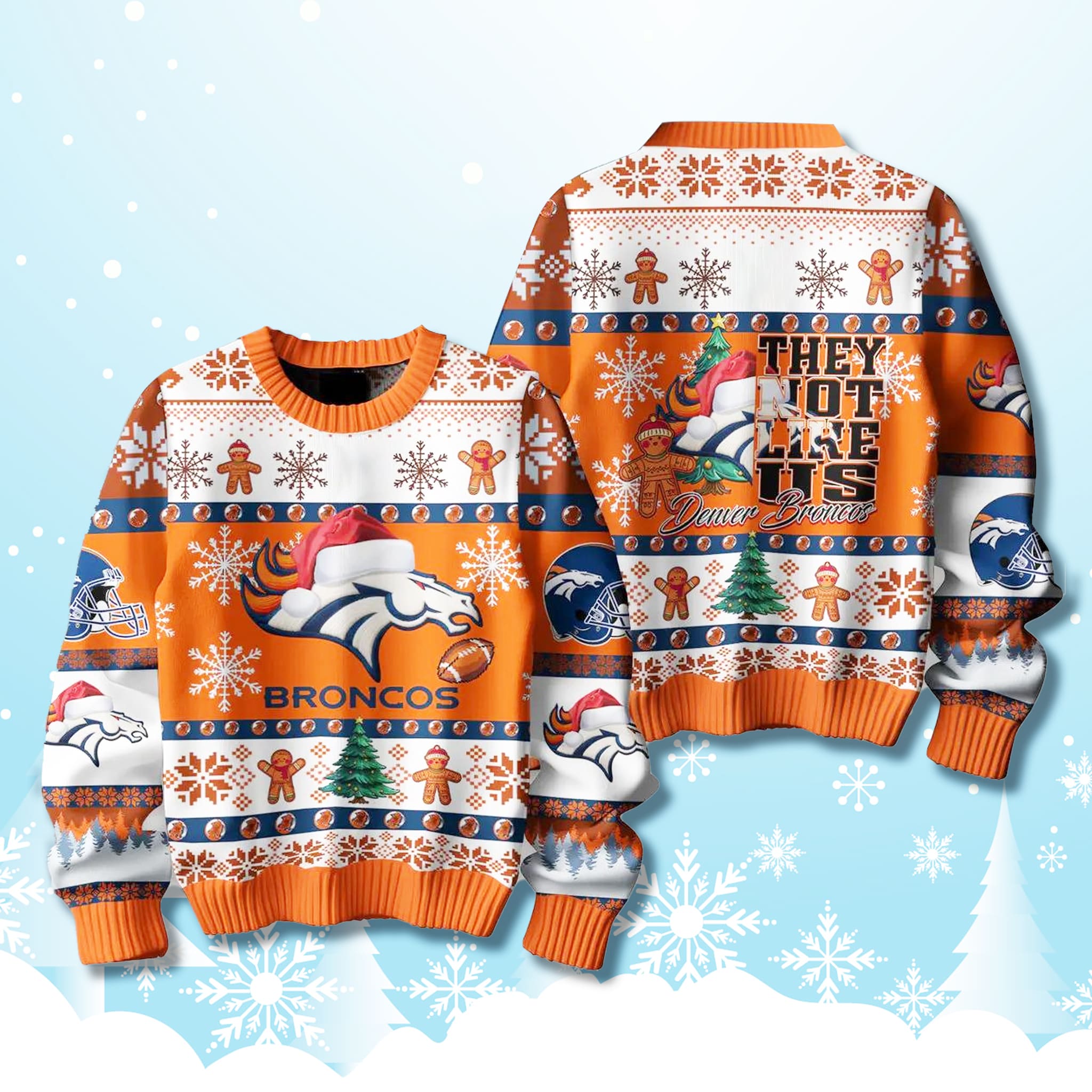 It’s the perfect, timely Christmas gift for the Broncos fan who celebrates their team’s unique identity with passion. This Broncos Football Christmas Sweater pops in the Broncos’ signature orange, navy blue, and white. It features the iconic Broncos logo topped with a Santa hat, classic team helmets, and the bold “They Not Like Us” slogan, all surrounded by fun holiday patterns like gingerbread men and snowflakes.