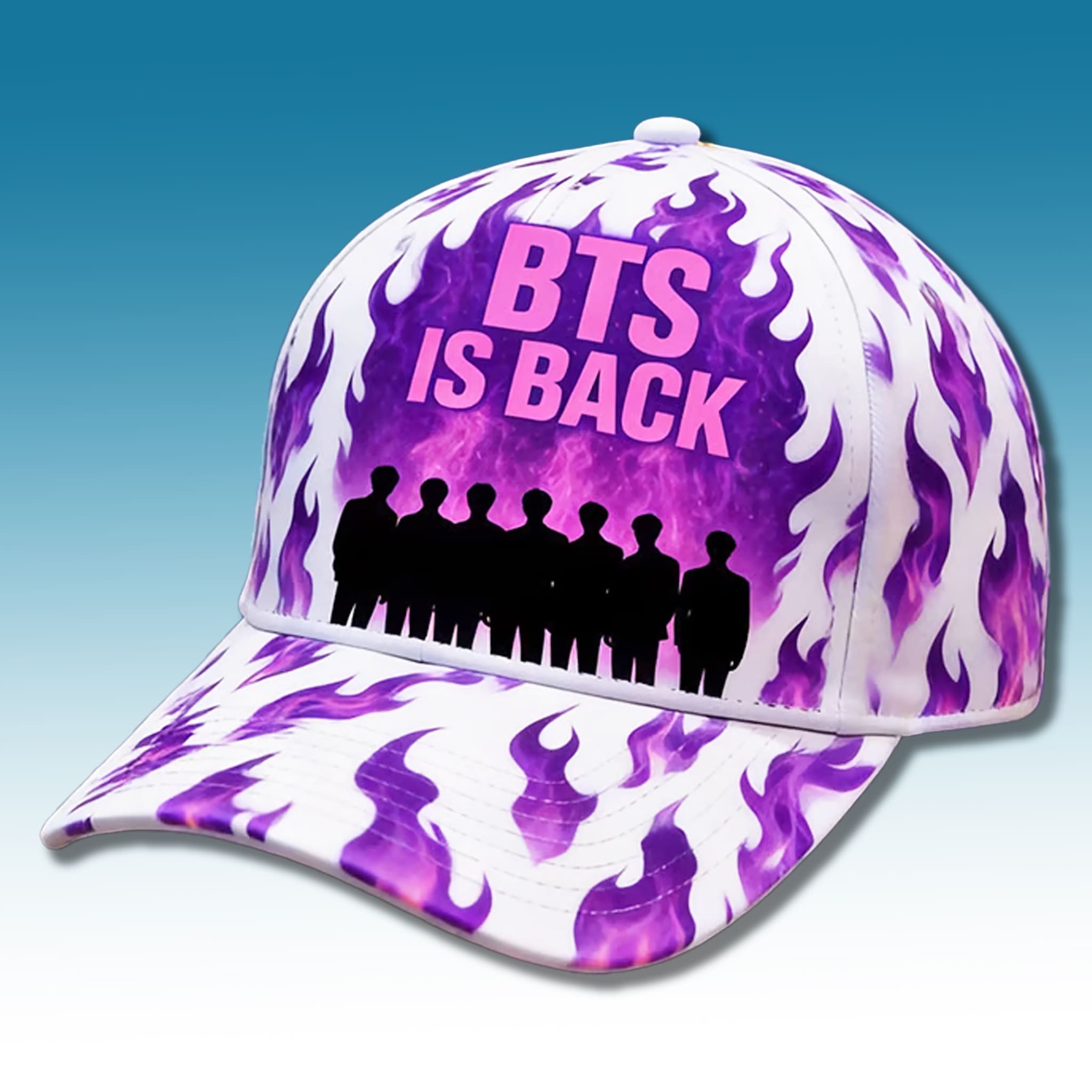 This BTS IS BACK hat design features vivid purple flames (BTS’s signature color) with the silhouettes of the seven members below, creating the feeling that the entire group is “igniting” their comeback and ready to conquer the global stage once again. The hat carries a modern, youthful streetwear style with an intense comeback vibe, easy to pair with casual outfits or wear to concerts and tour livestreams.
