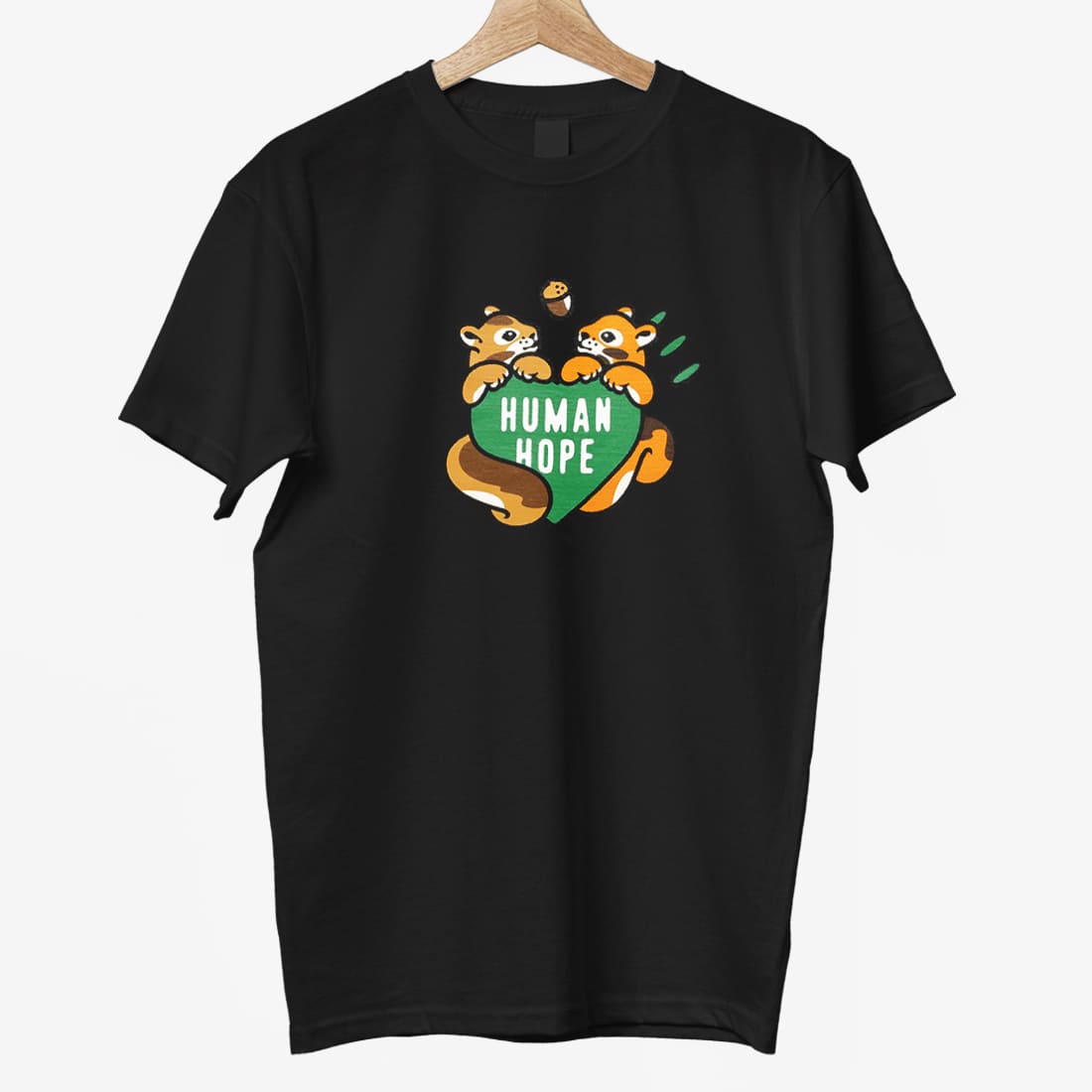 The black unisex t-shirt features in the center two cartoon squirrels hugging a green heart with the phrase “HUMAN HOPE” in clean white text. A minimalist but warm style with the main black-green-white color palette, carrying J-Hope’s signature street-cute aesthetic.