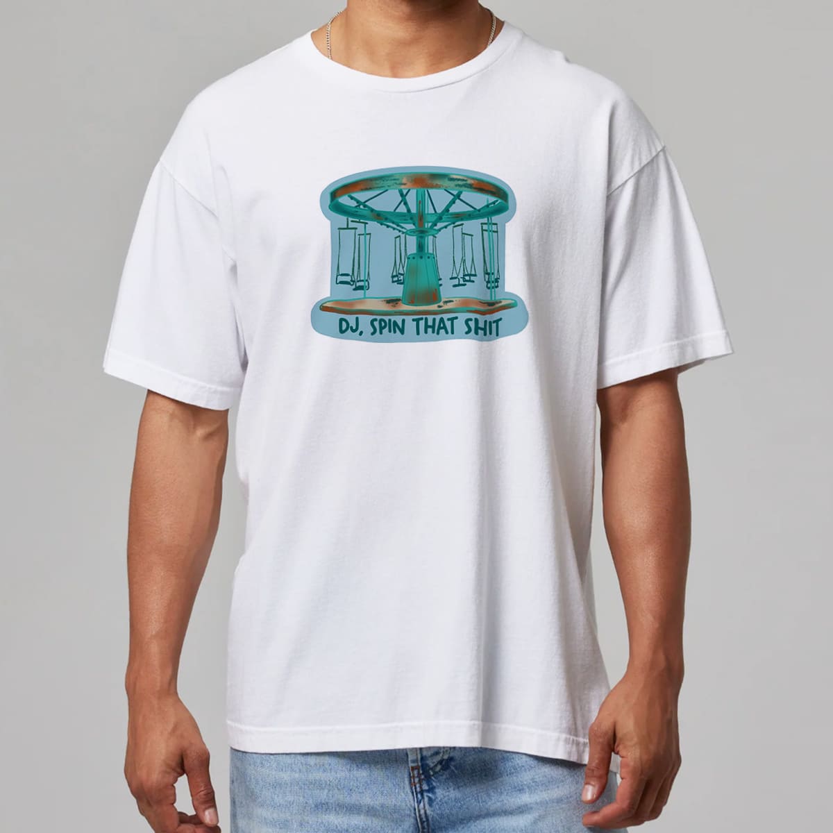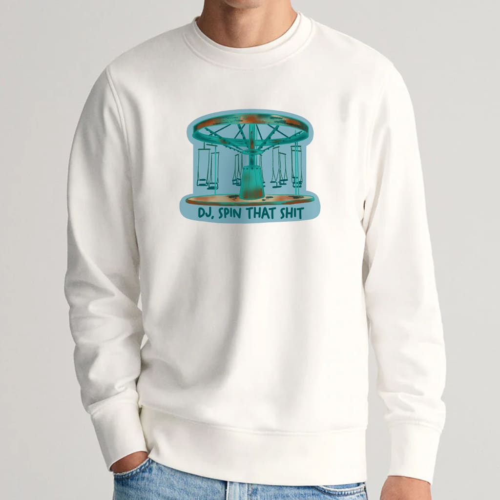 The BTS RM DJ Spin That Shit Shirt is a fun meme-inspired design based on a hilarious moment from a recent BTS concert. When RM (Kim Namjoon) enthusiastically shouted, “DJ, spin that shit!”, the DJ immediately played the emotional ballad “Spring Day,” creating an extremely funny contrast. Fans quickly turned the phrase into a viral meme, and this white shirt with its carousel graphic is a playful and adorable way for fans to celebrate that moment.