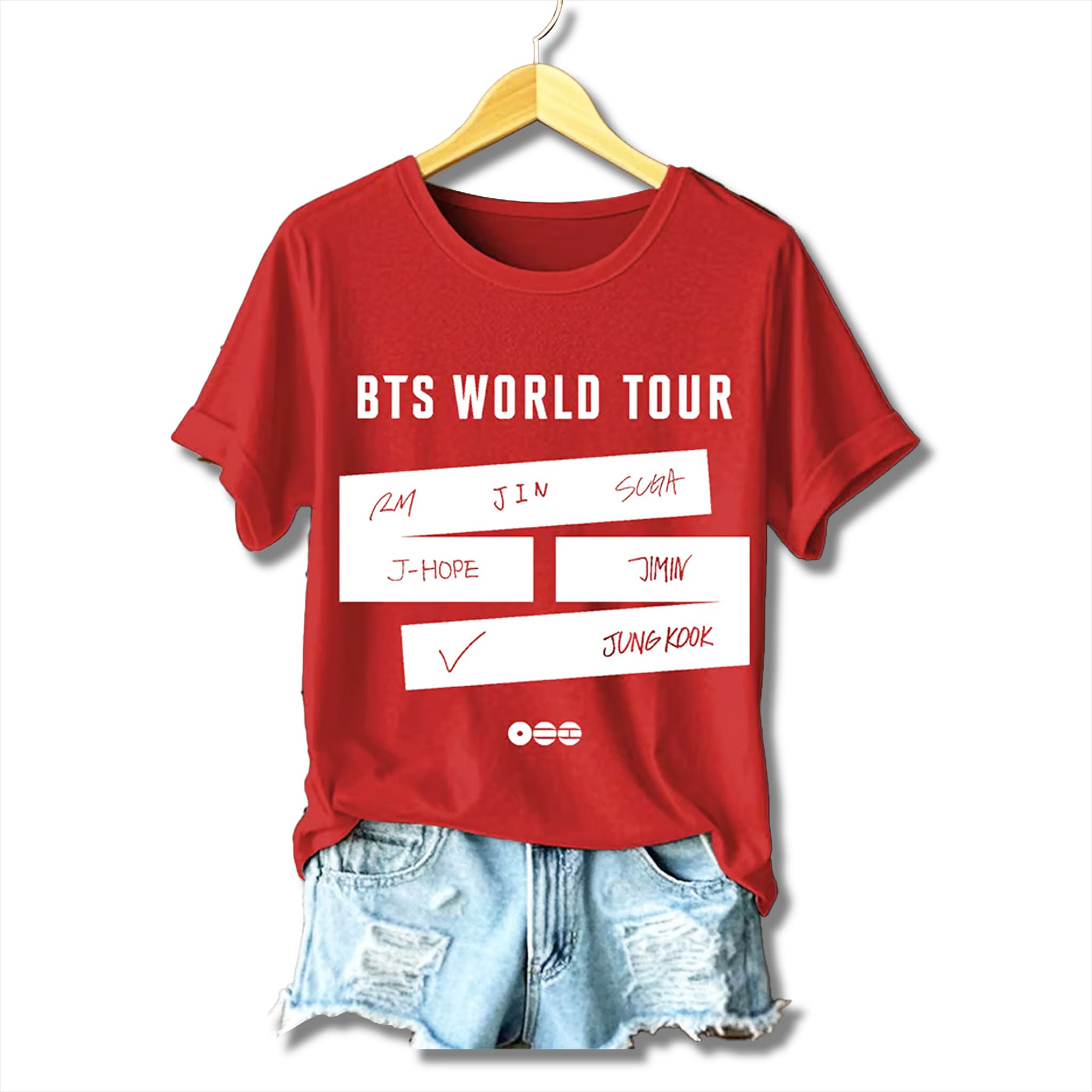 This design features a basic white T-shirt silhouette that is youthful and easy to style. The highlight lies in the bold red blocks printed across the chest, containing the names of the seven members: RM, Jin, Suga, J-Hope, Jimin, V, Jung Kook. The shirt is sold at iFrogtees in multiple color versions for you to choose from and get ready to cheer.