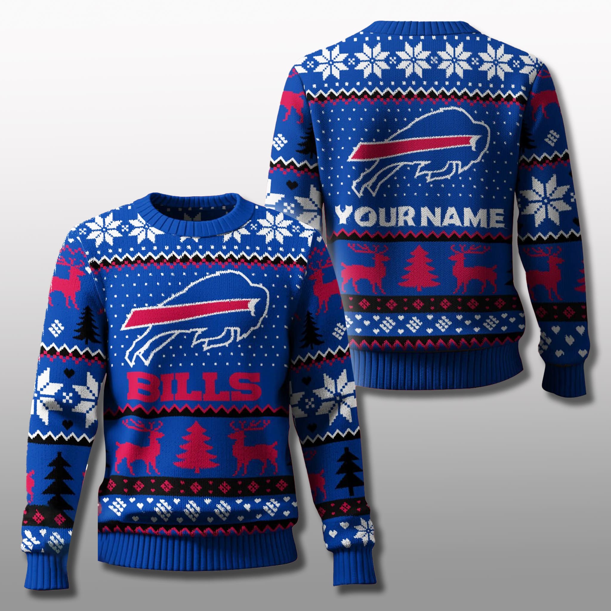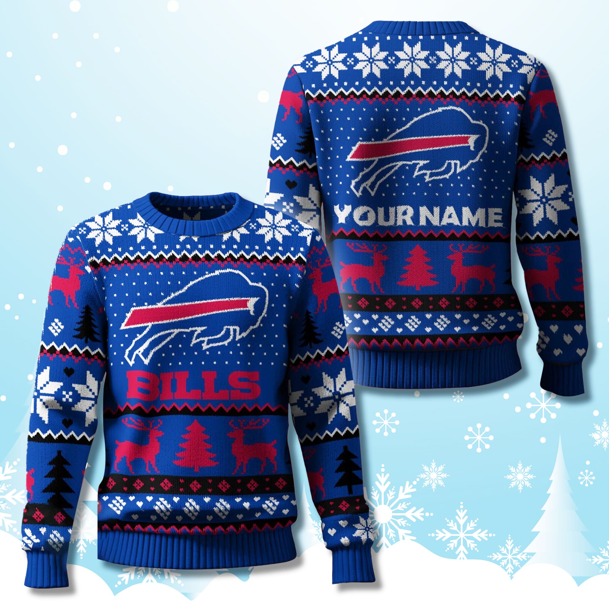 Featuring bold navy blue with red and white accents, this sweater embodies the Bills’ iconic colors. Traditional Fair Isle patterns – snowflakes, reindeer, and Christmas trees – are cleverly combined with the Buffalo and team name. The personalized (customized) feature lets you add your name on the back, making it a one-of-a-kind gift or a unique fan statement.