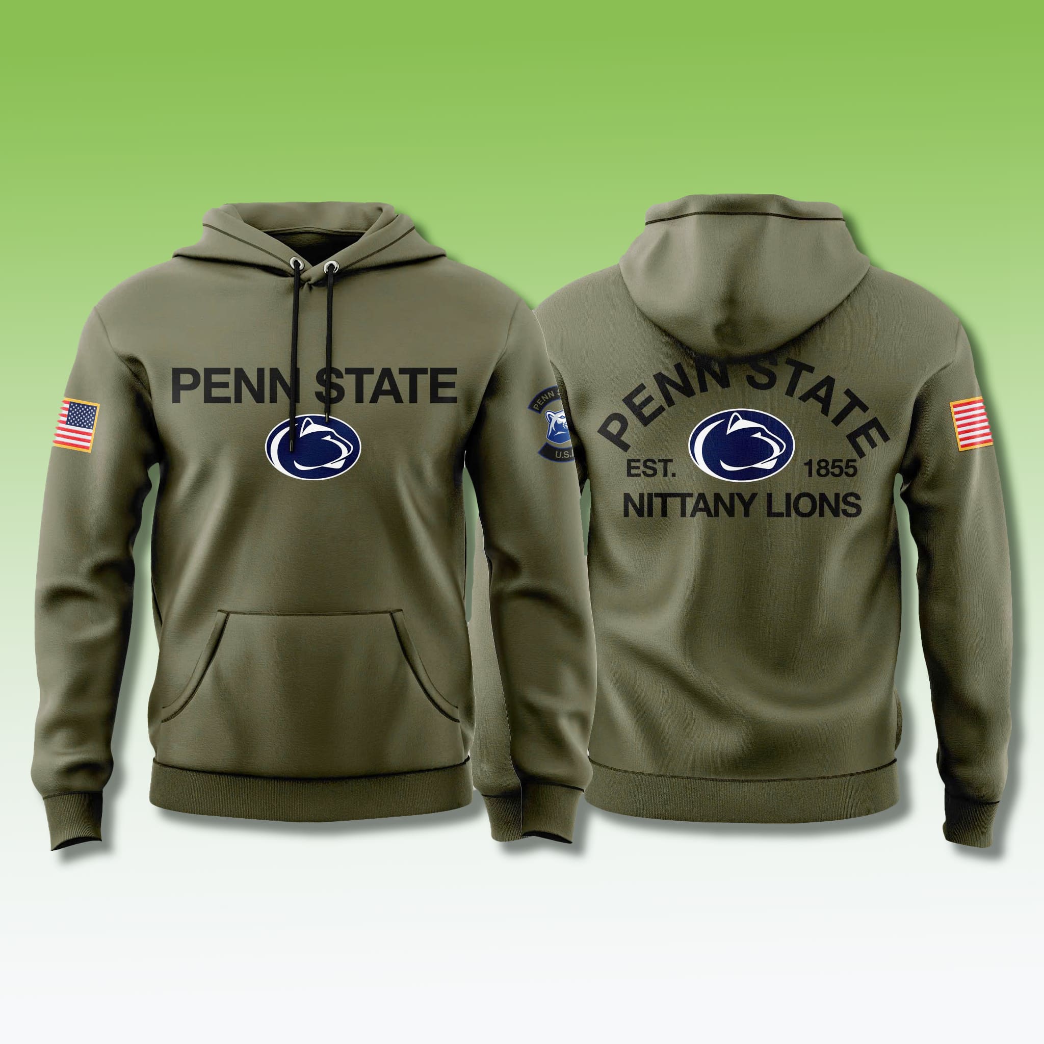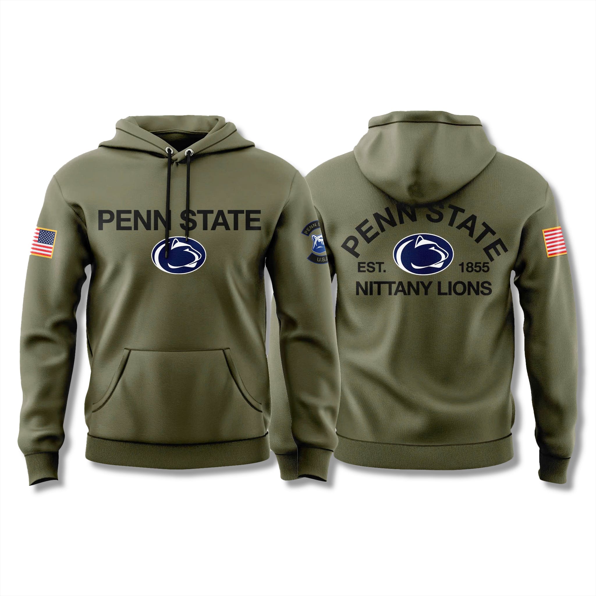 This hoodie features a deep olive green (military green) color, evoking strength and durability. The design is bold yet minimalist, highlighting PENN STATE prominently on the front and back. The back includes the full PENN STATE EST. 1855 NITTANY LIONS emblem, while the American flag detail on the sleeve adds a clear nod to Military Appreciation, making it a meaningful and stylish choice for fans.