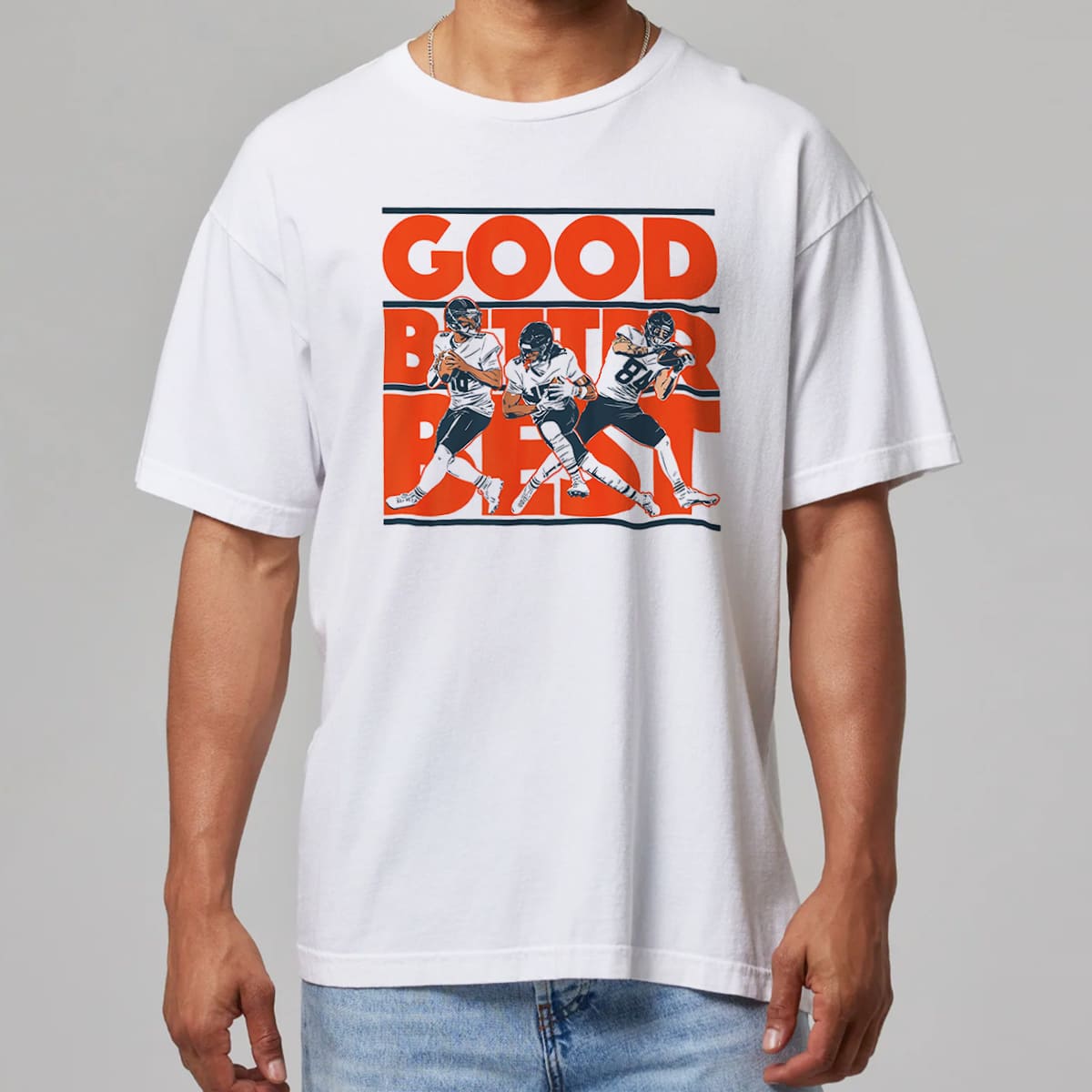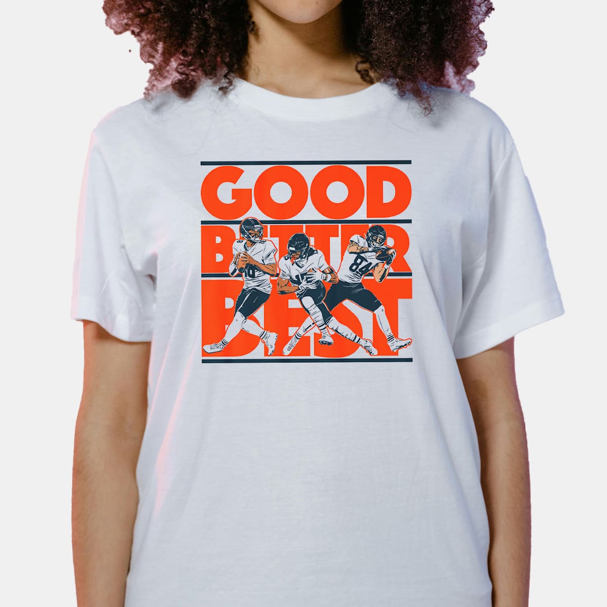 The slogan “Good Better Best” symbolizes the steady progress of the Bears’ offense – from good fundamentals, to better teamwork, to their best in clutch moments. The shirt features a clean graphic tee design with a white base, accented by bold orange “GOOD BETTER BEST” lettering and images of the three players, creating an energetic and modern visual. Available in multiple styles and color options at iFrogtees.