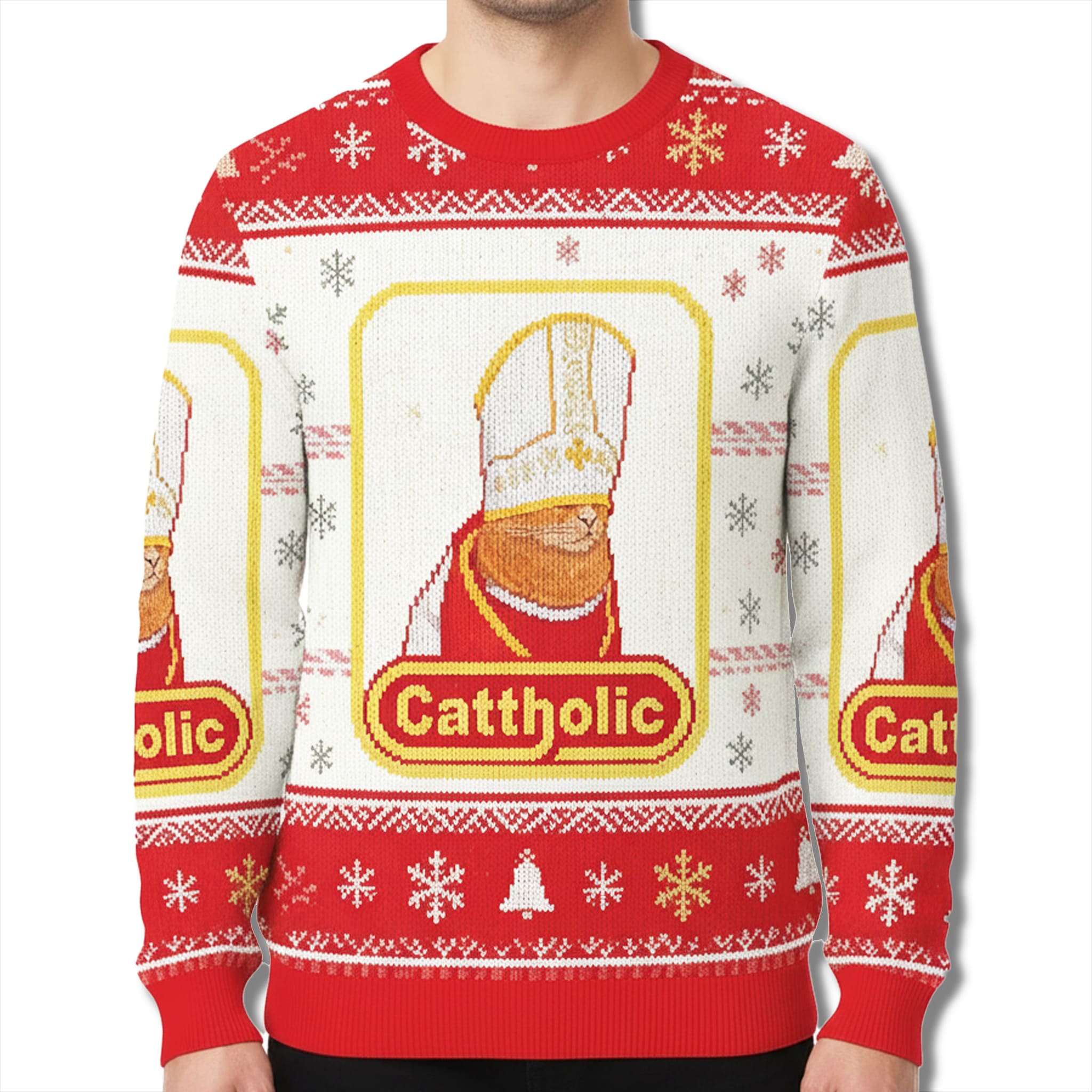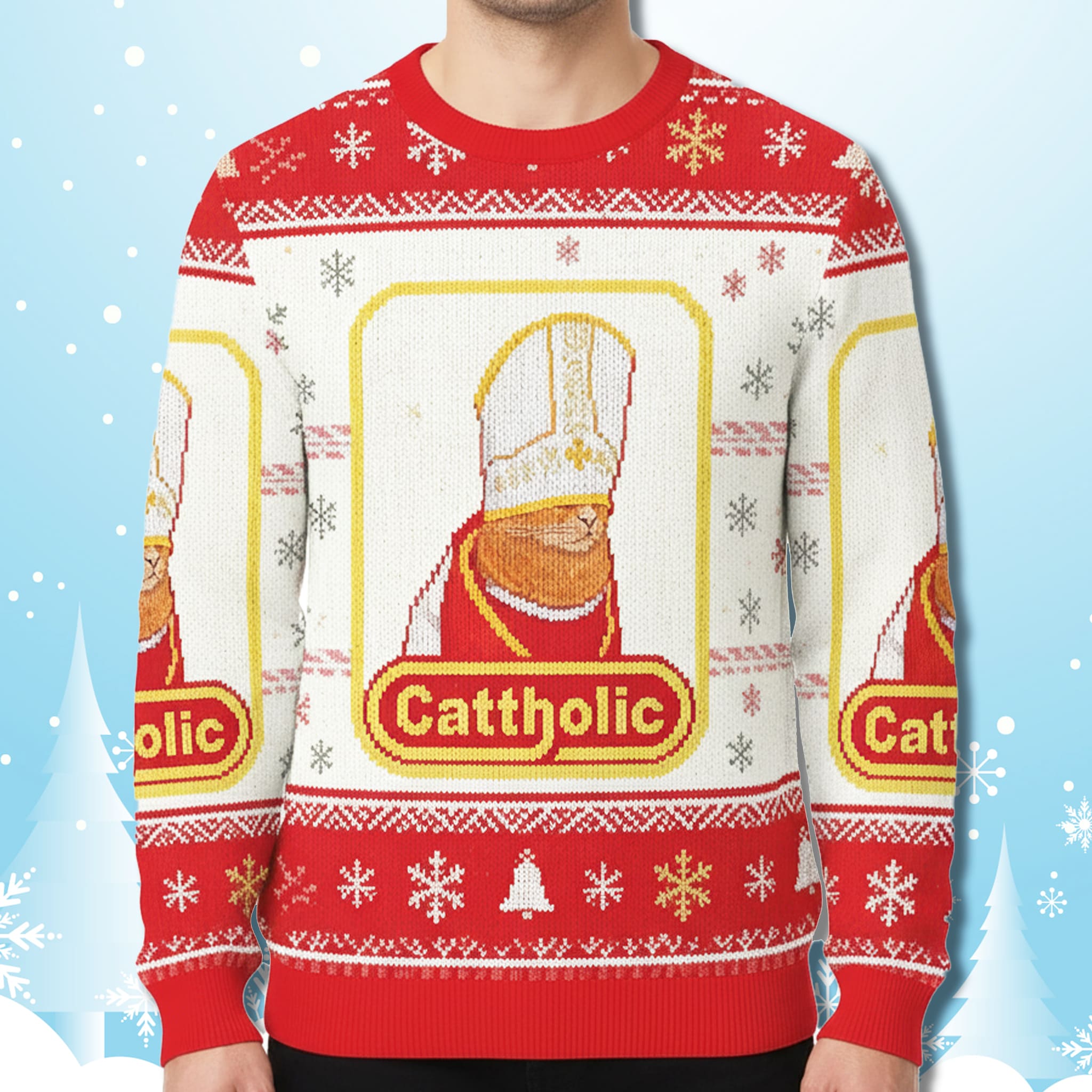 The design of the Cat Cattholic Ugly Christmas Sweater highlights the cat wearing the papal mitre in a golden frame. The main colors – red, white, and gold – follow the Vatican holiday palette, combined with snowflakes and traditional Fair Isle patterns typical of ugly sweater memes, creating a look that is holy yet playful.