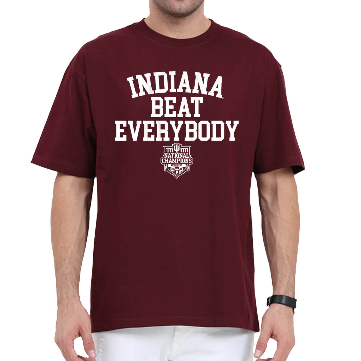 This shirt features a vibrant traditional, highlighting the bold text “INDIANA BEAT EVERYBODY.” Directly beneath is a refined stylized CFP National Champions logo combined with IU’s iconic trident symbol. This shirt is not simply apparel; it is a glorious scoreboard and a symbol of absolute dominance that IU fans want the world to see.