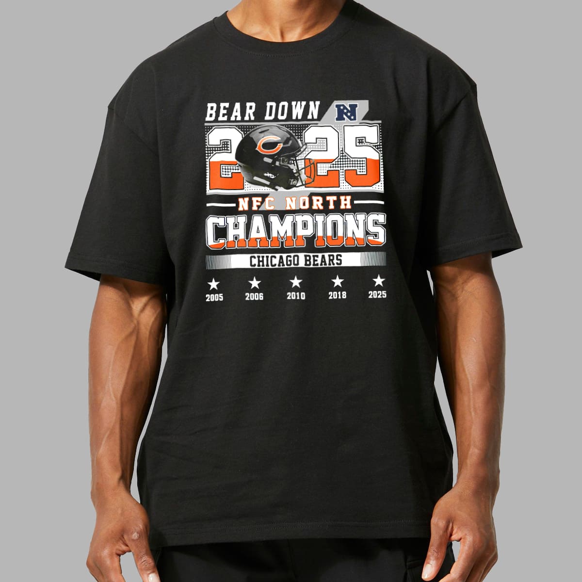 The Bears NFC North Champions Bear Down 2025 Shirt is a commemorative T-shirt celebrating the Bears’ first NFC North division title since 2018. After seven long years of waiting, the Bears have officially “Bear Down,” rising above their rivals to reclaim the top spot in the division and ignite excitement for a promising playoff run ahead. This shirt is more than just fan gear – it’s a statement of resilience, pride, and belief in the return of Chicago football.