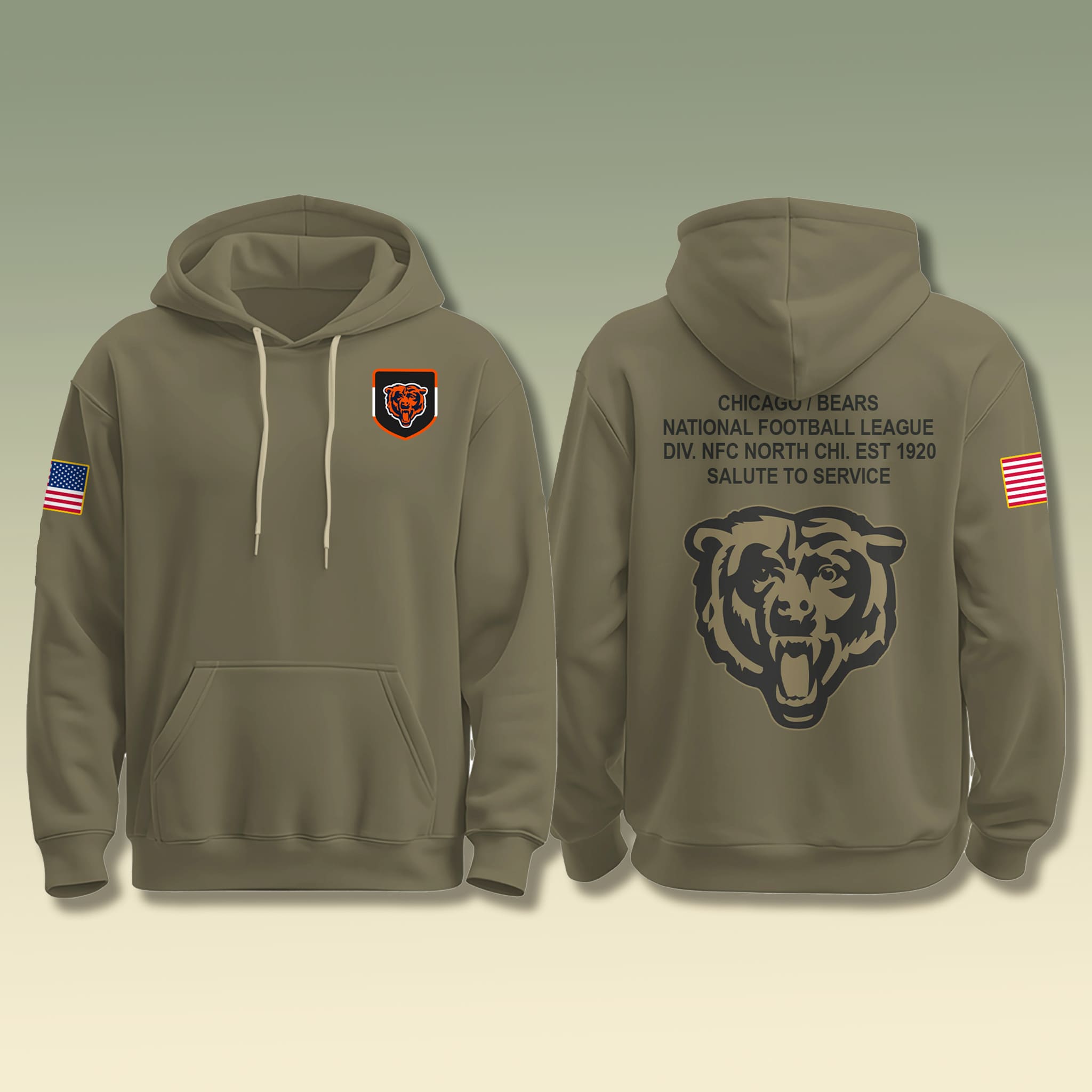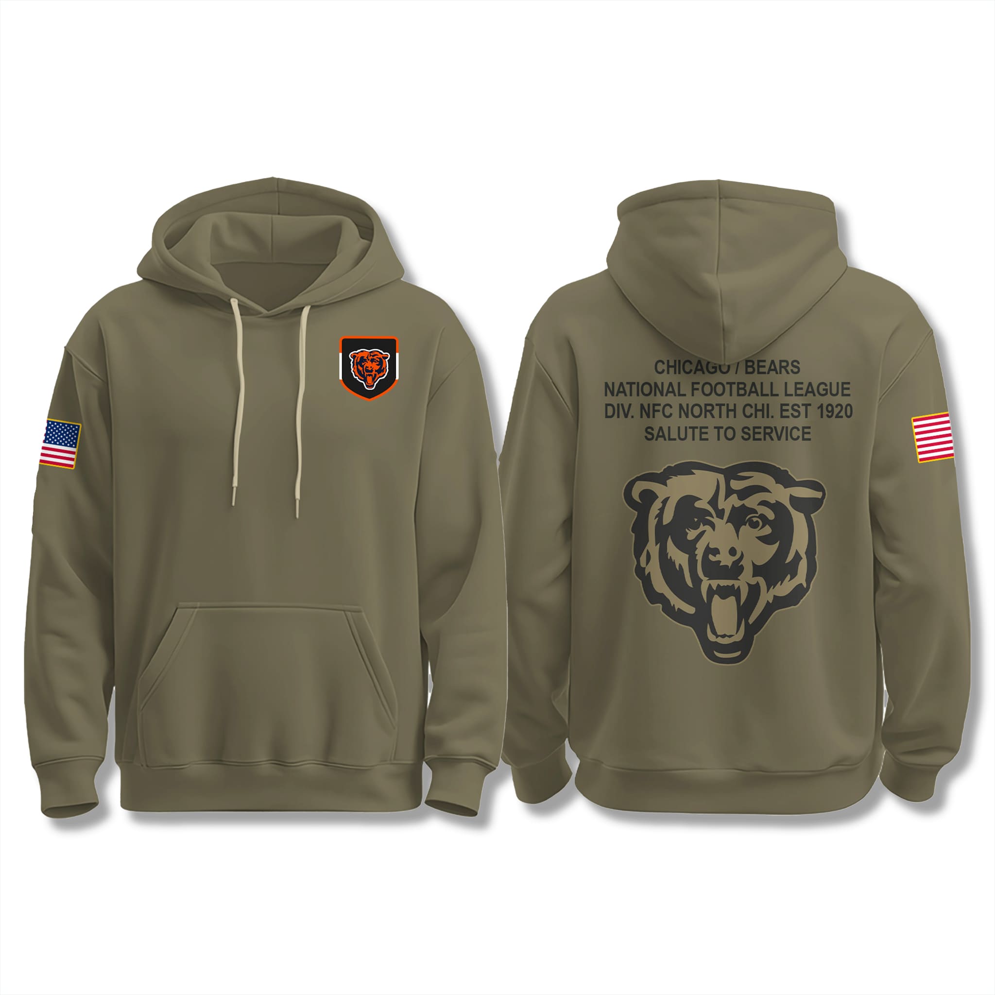 Featuring a military-inspired design in classic olive green with bold black and orange accents, the hoodie reflects both patriotism and team pride. The front displays the Bears patch logo, the back showcases a roaring bear graphic with the words “Salute To Service,” and the sleeve is adorned with the U.S. flag patch – making it an unmistakable symbol of Chicago toughness and national pride.