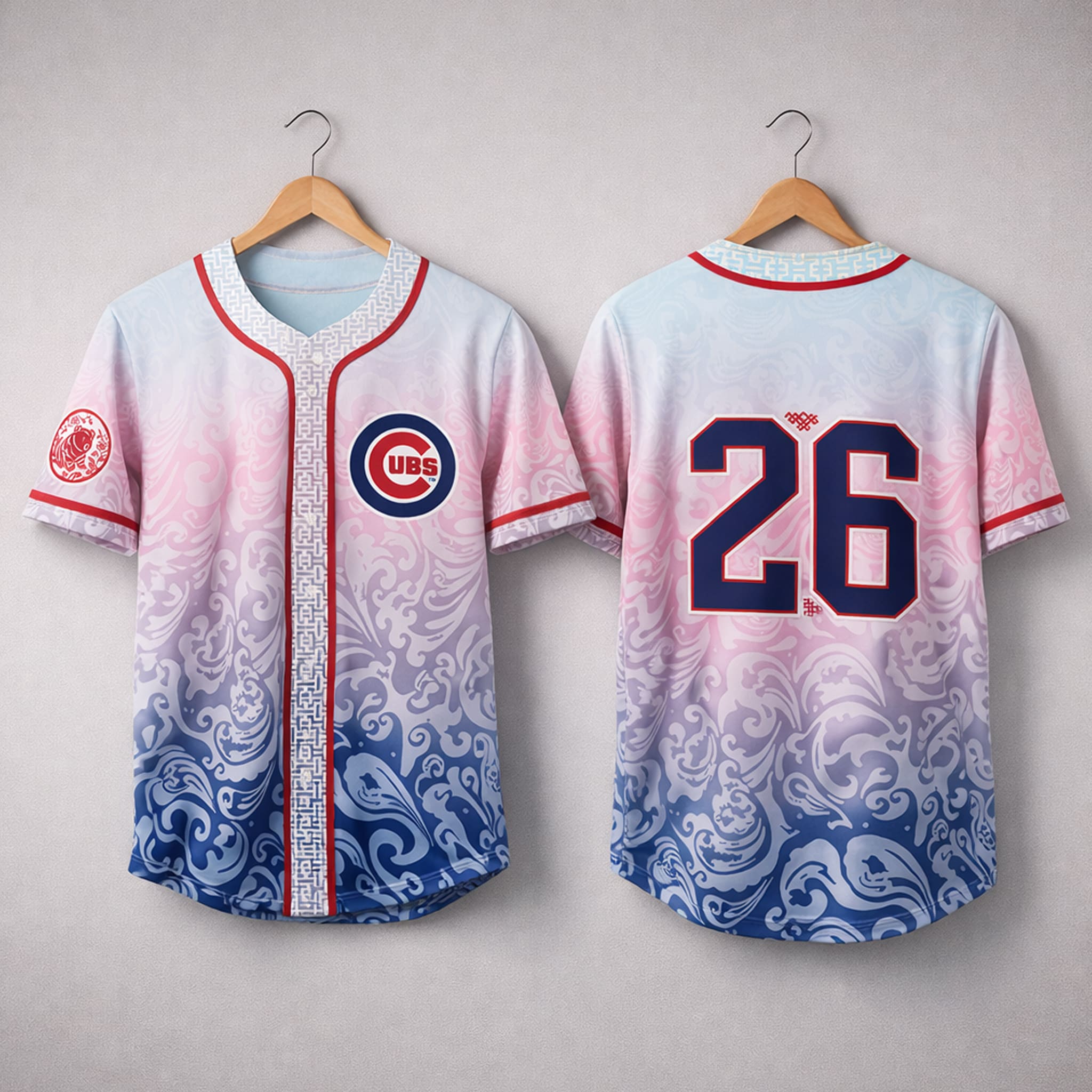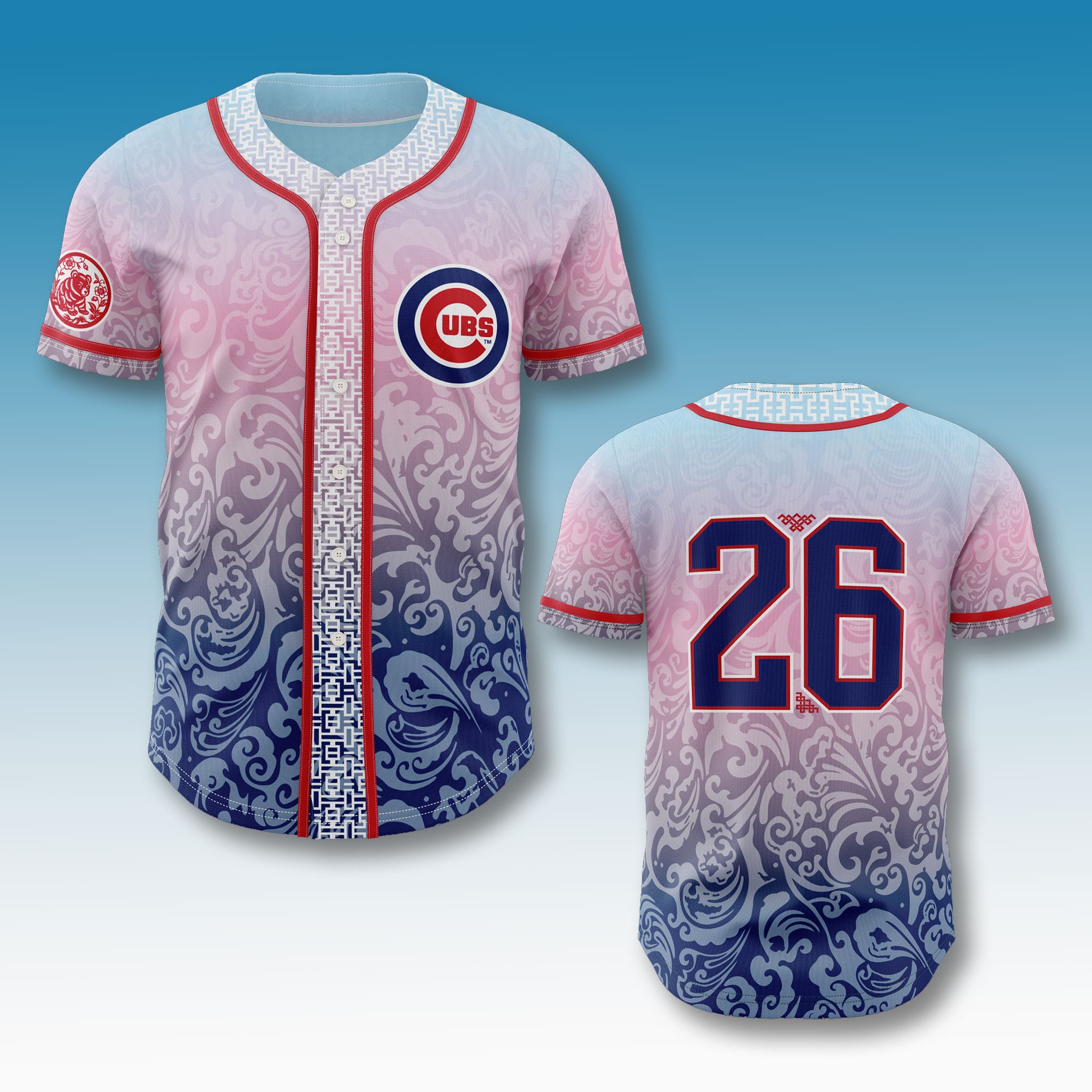 This special-edition heritage jersey features a unique artistic design: a gradient transition from soft pink to cool blue with flowing wave patterns, delicate traditional Asian motifs along the body and trim, a bold Cubs logo, and jersey numbers accented with a Chinese knot detail – creating a rich cultural vibe that is modern, comfortable, and perfect to wear to the game or daily to show support for the AAPI community.