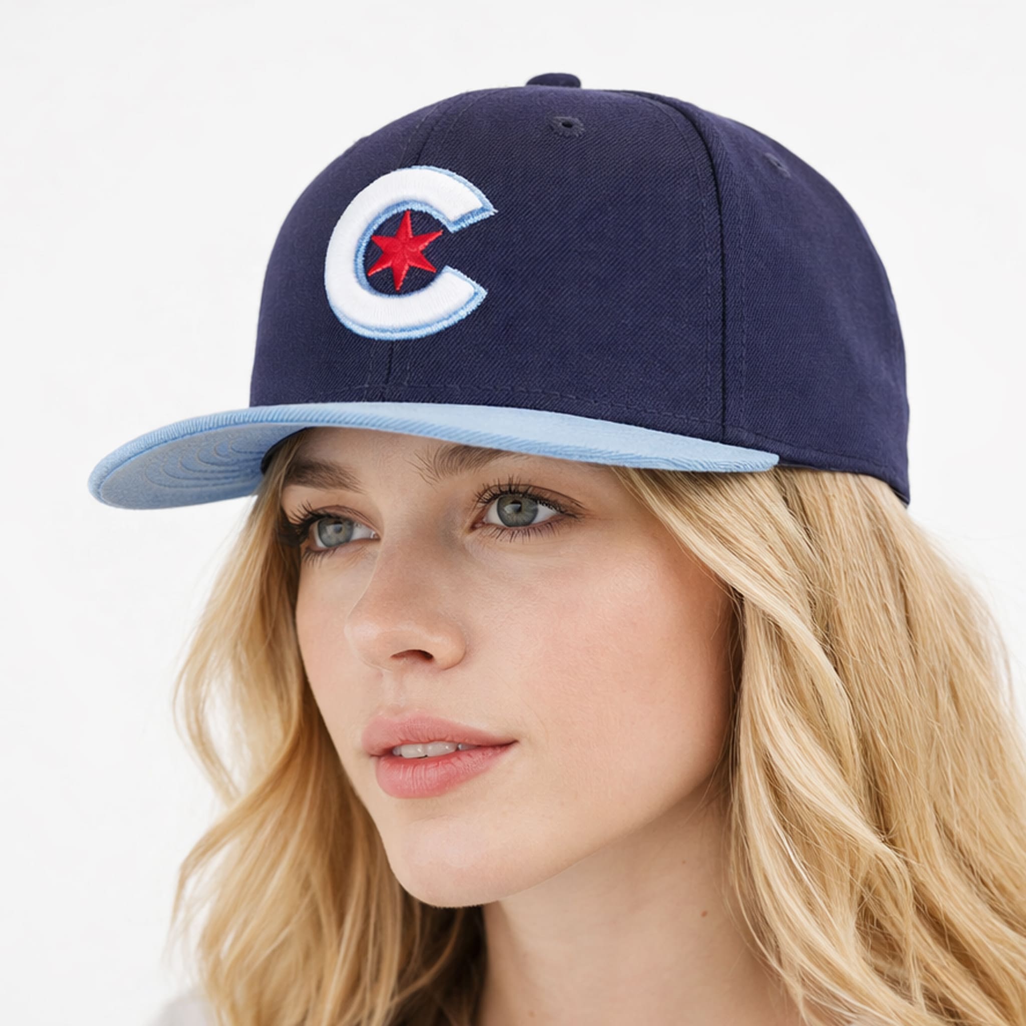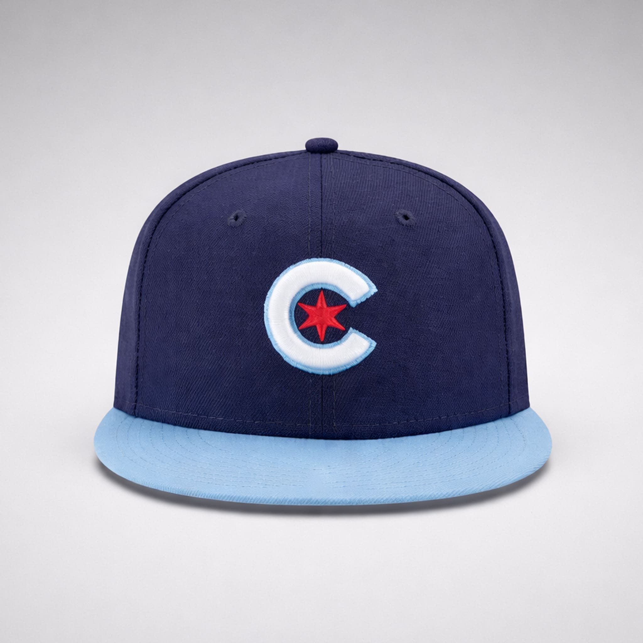 The hat is now available at iFrogtees with a premium snapback design: a deep navy crown, a light blue bill representing the lake, and a white “C” logo outlined in red with a prominent embroidered red star on the front – delivering a clean, modern City Connect style full of Chicago pride.