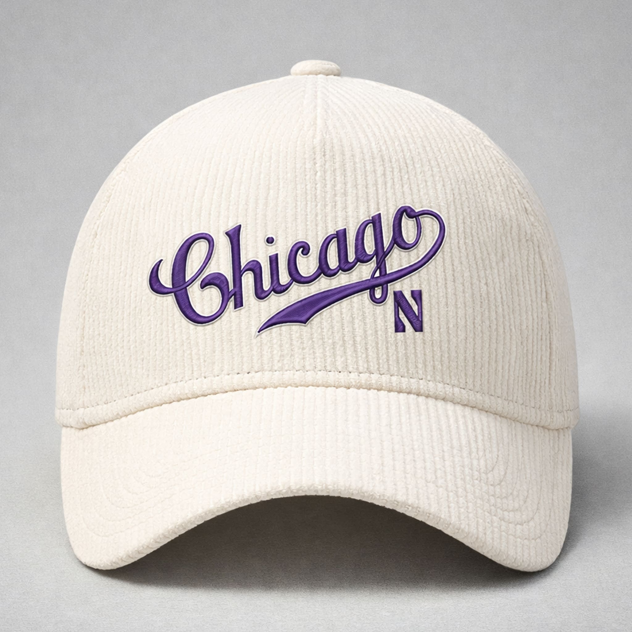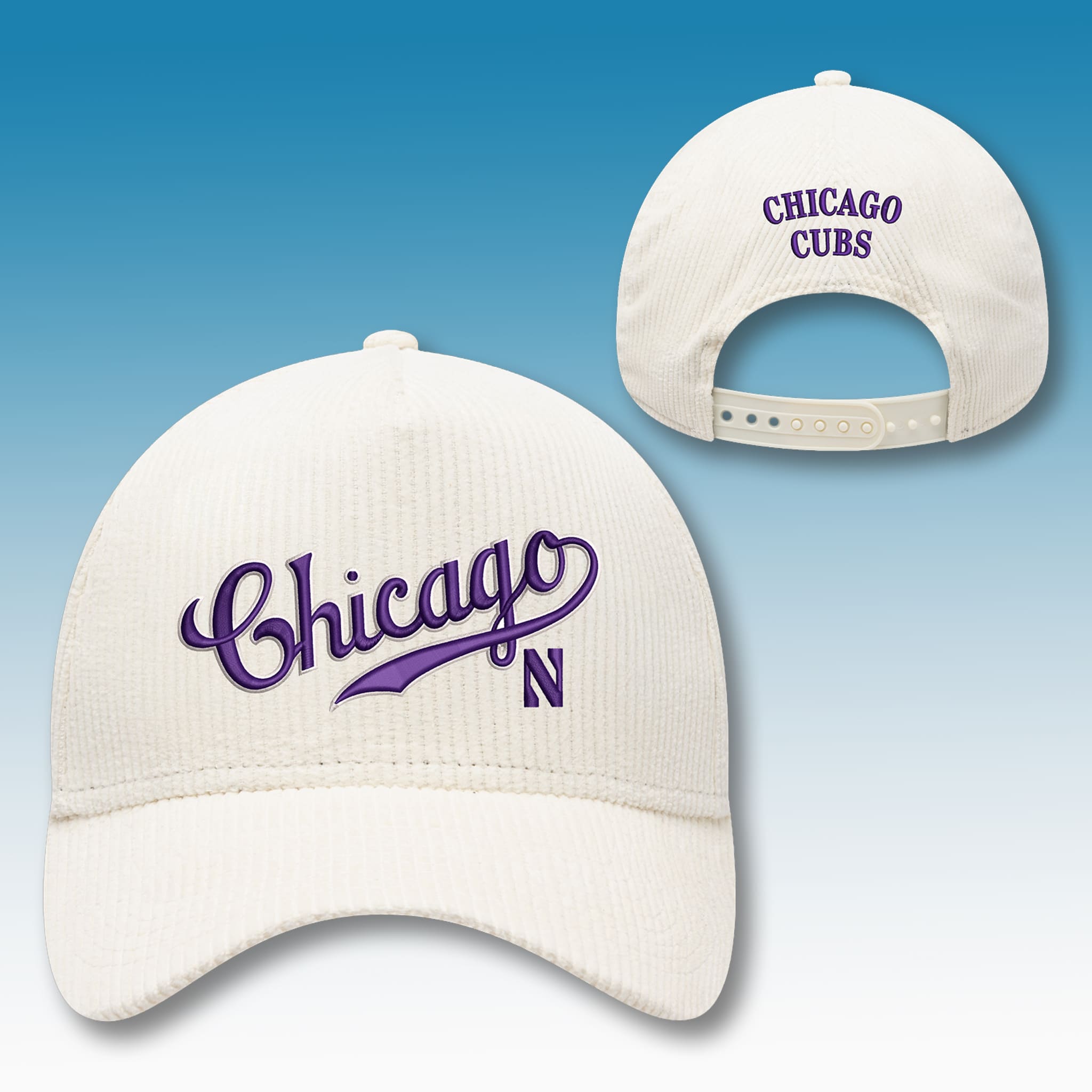 This hat features a comfortable unisex design: soft, breathable cream-white with an unstructured, adjustable fit. On the front, Chicago appears in royal purple lettering with a glossy gold outline and stylized detailing, paired with a subtle purple Northwestern logo. On the back, “CHICAGO CUBS” is printed neatly in purple text. The overall look is both retro and refined – wear it and instantly feel the connection between Wrigley Field and Northwestern pride.
