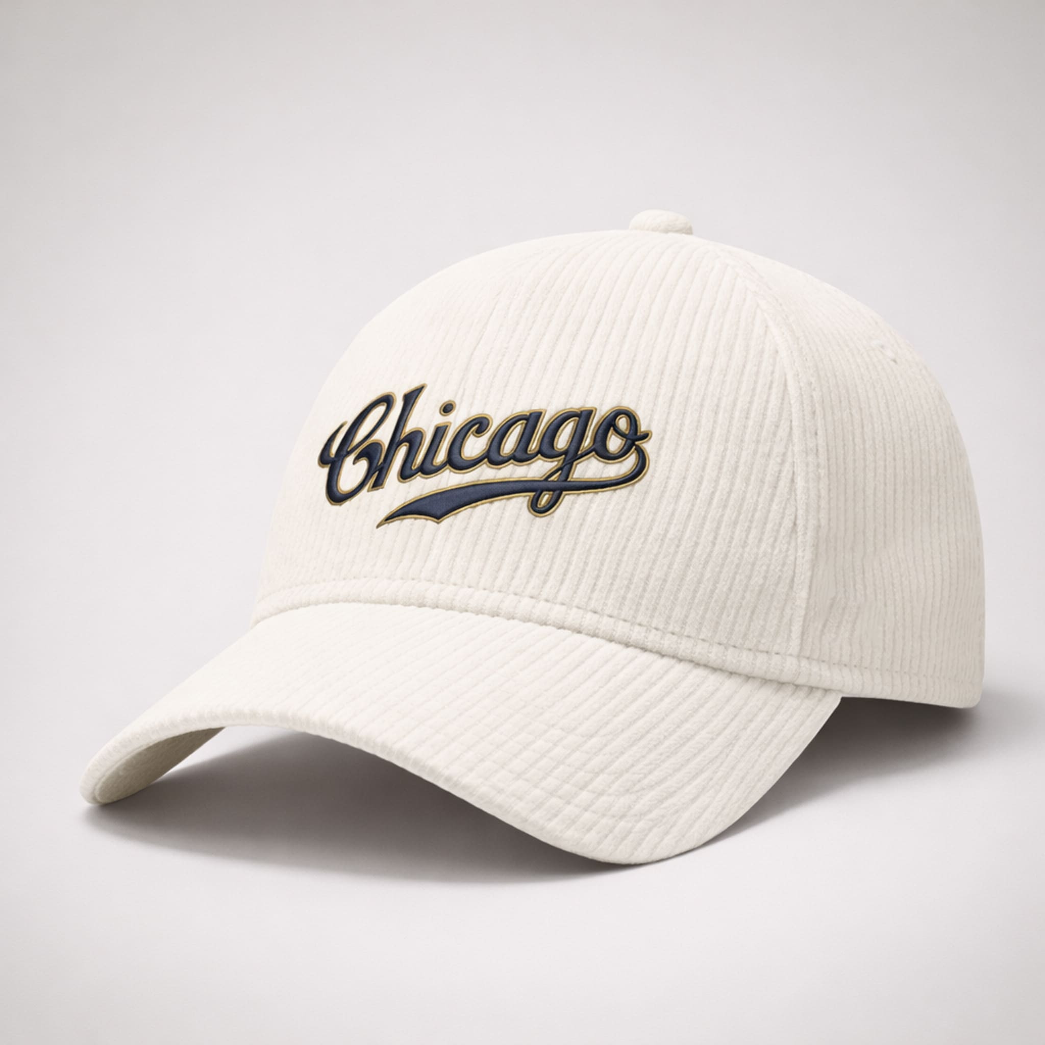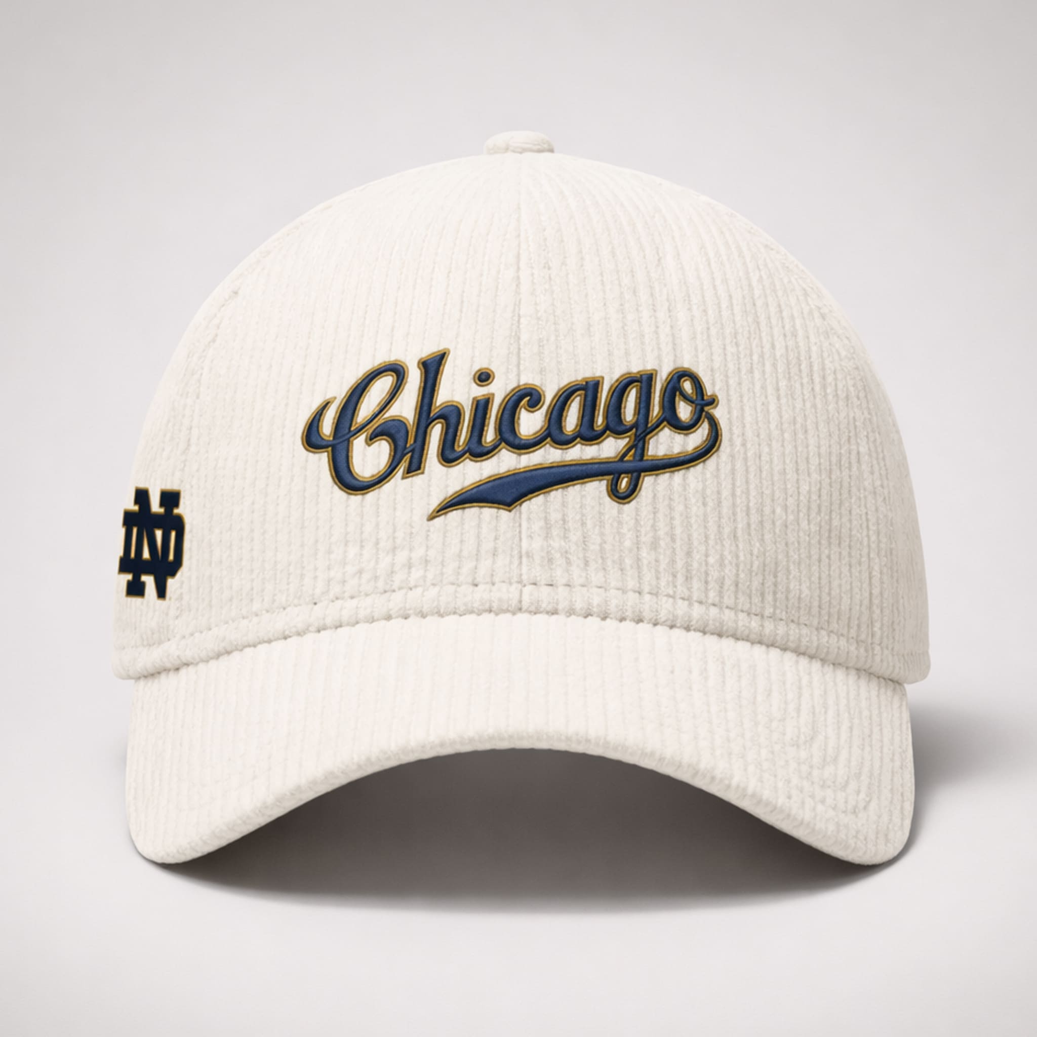 This hat features a classic unisex design: soft, breathable cream-white corduroy with an unstructured, adjustable fit. On the front, “Chicago” appears in navy lettering with a glossy gold outline and elegant curved detailing, accompanied by a bold black logo accent. On the back, “CHICAGO CUBS” is printed in clean black lettering. The overall look is both retro and refined – wearing it instantly connects the energy of Wrigley Field with Notre Dame pride.