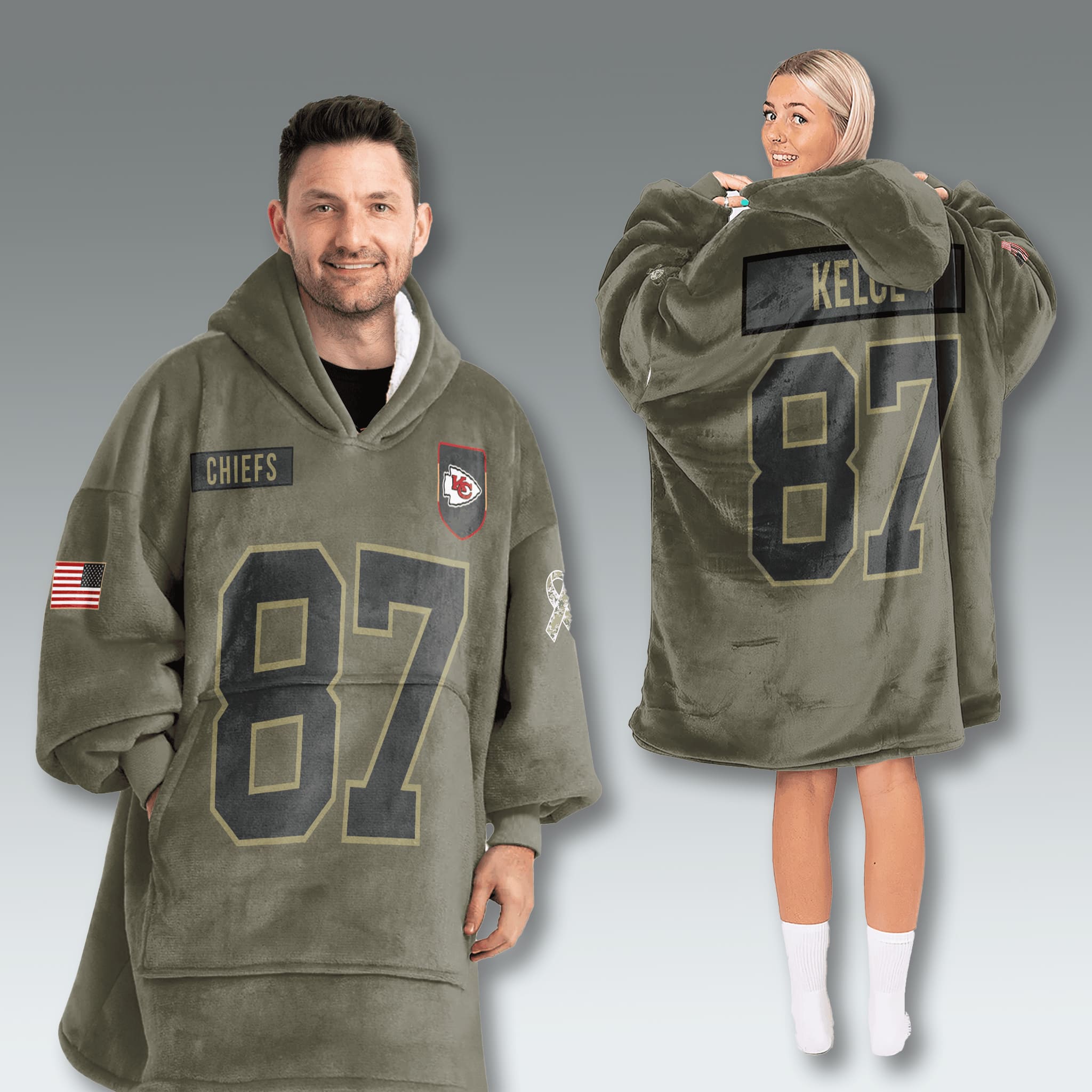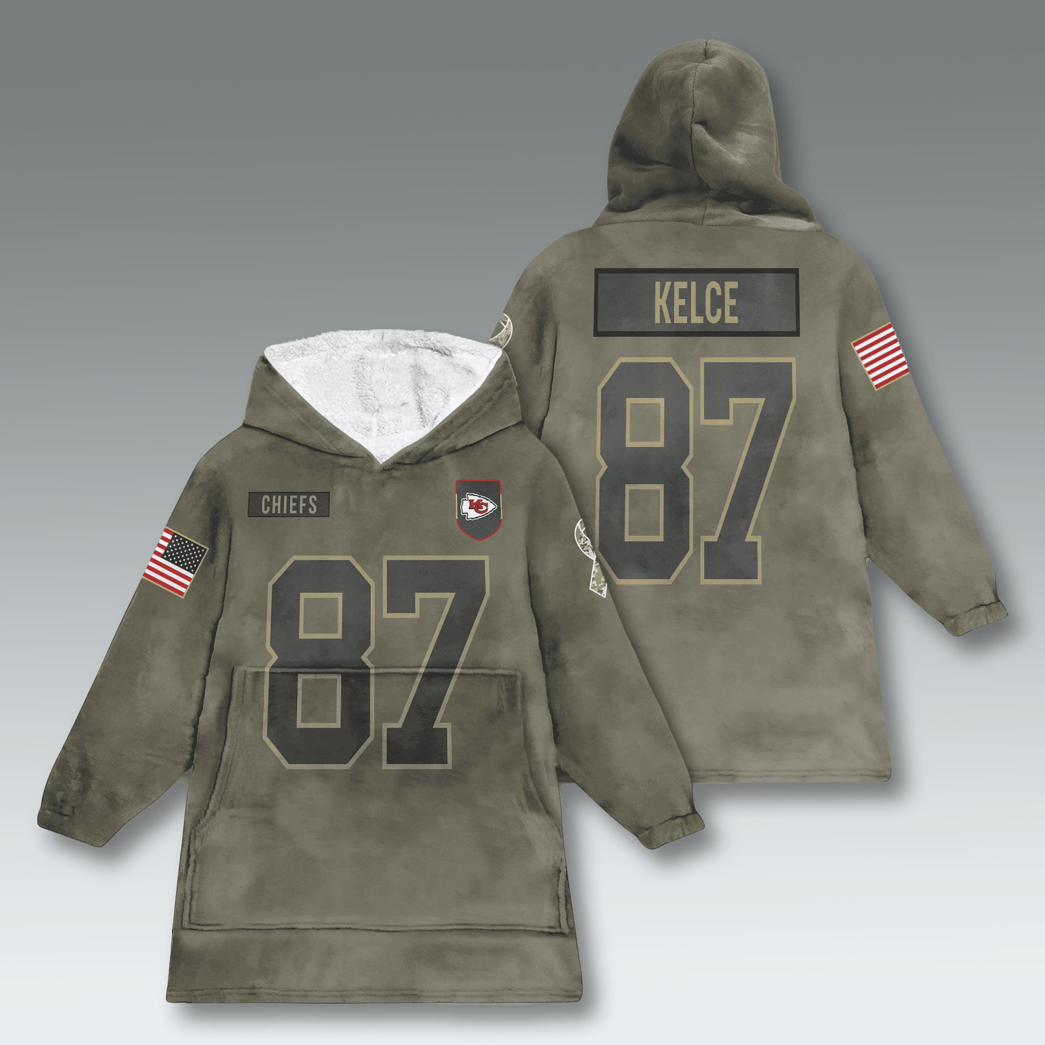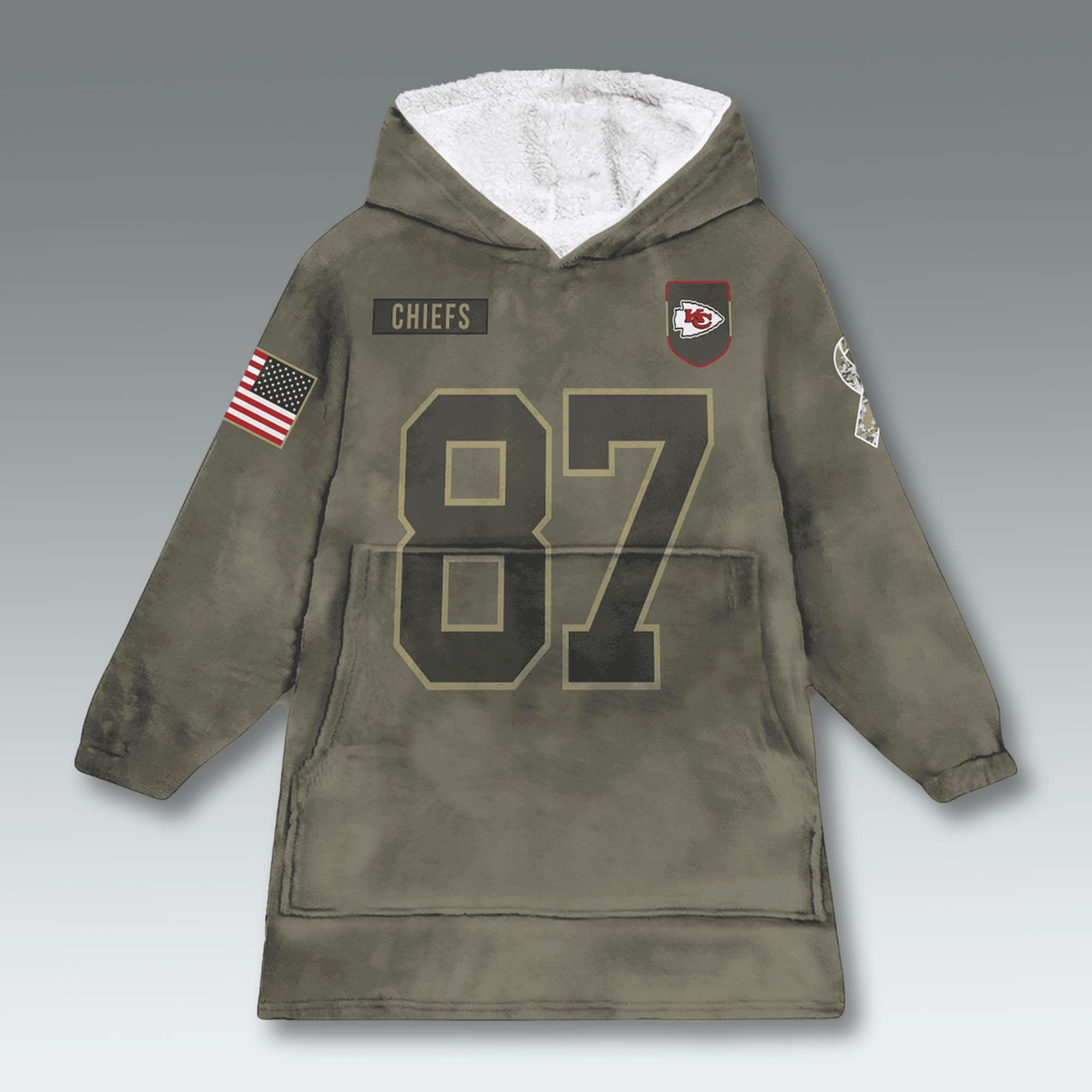 This blanket hoodie features an oversized fit with an Olive Green base, inspired by military uniforms, include the Chiefs logo, a small U.S. flag on the sleeve, and a CHIEFS patch on the chest, showcasing pride and honoring the spirit of service.