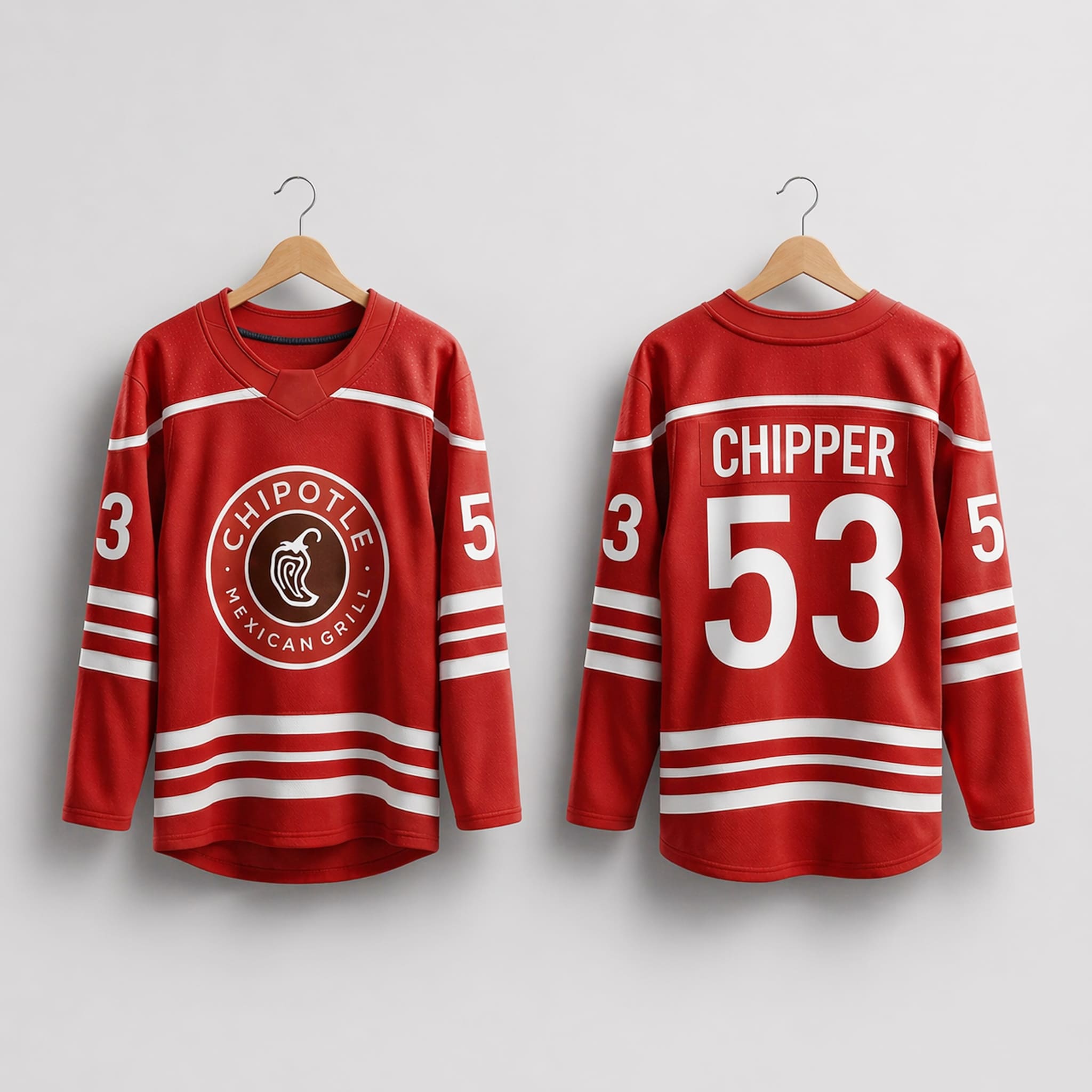 The Chipotle Hockey Jersey 2026 is a limited-edition merch item released on April 16, 2026 in celebration of the hockey playoffs. The design is inspired by classic hockey jerseys: a vibrant red base, the circular Chipotle Mexican Grill logo on the chest, and white-red striped accents on the sleeves and hem. On the back, it features the name “CHIPPER” along with the number 53 – “Chipper” is a longtime nickname used by the hockey community and players for Chipotle, while 53 represents the 53 real ingredients on Chipotle’s core menu.