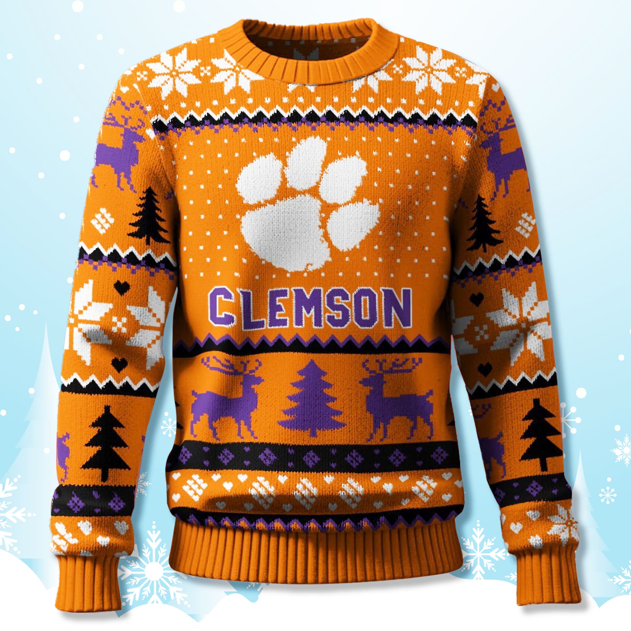 This vibrant Clemson Tigers Ugly Sweater pops with Clemson’s iconic orange and purple, ensuring your team spirit is unmistakable. The design masterfully blends the fierce Clemson paw logo with classic holiday motifs, featuring a knit-style pattern of reindeer, snowflakes, and festive trees. It’s the perfect balance of team pride and traditional “ugly Christmas sweater” fun.